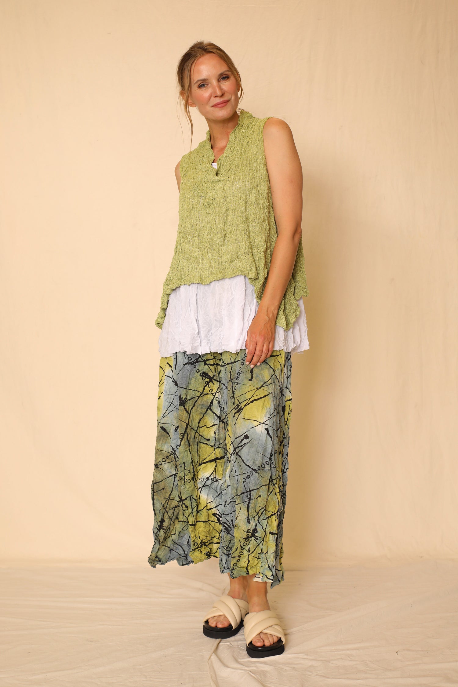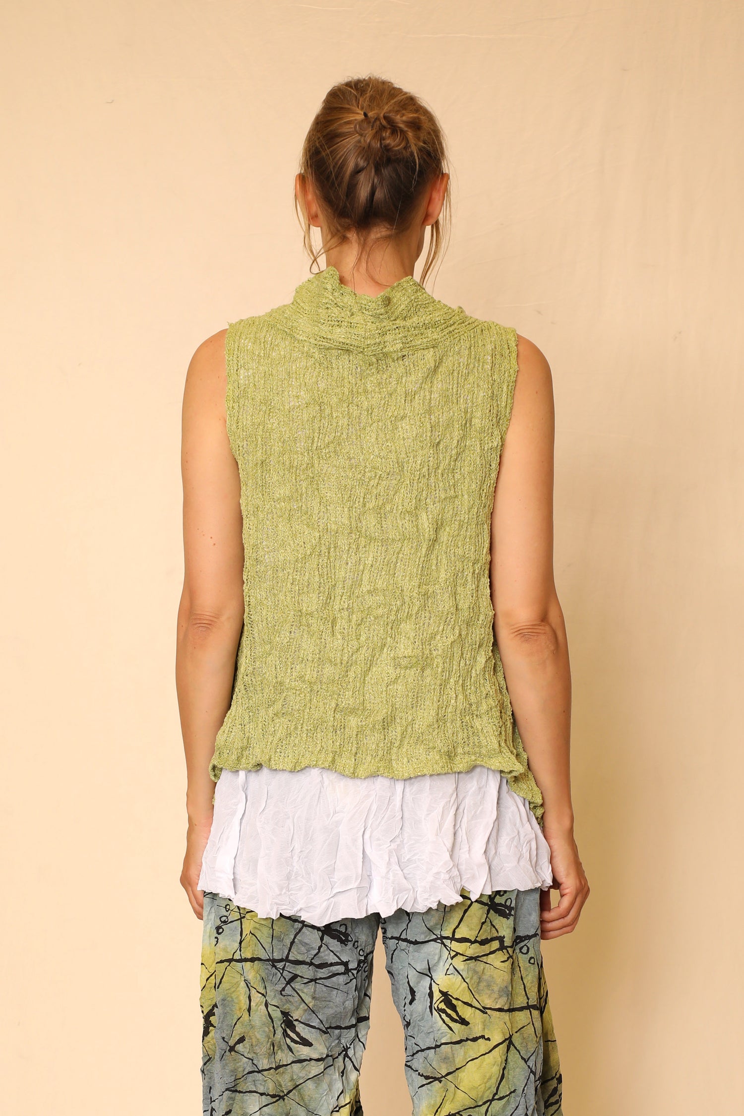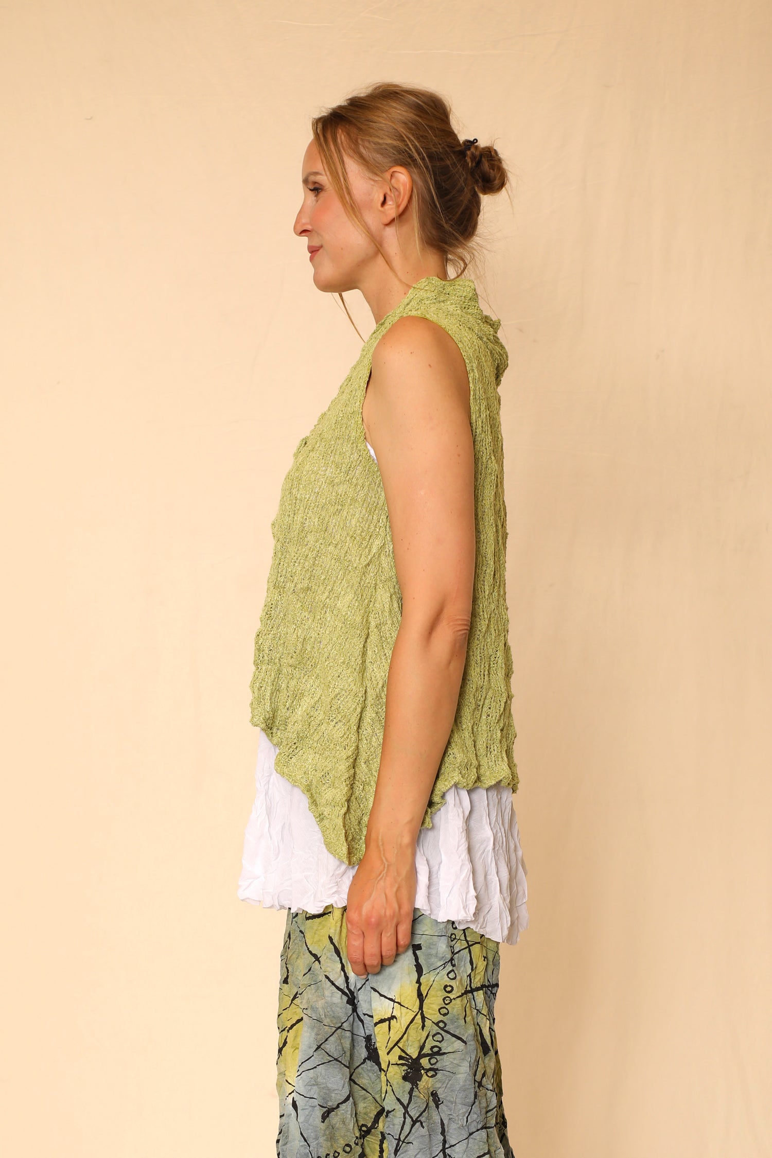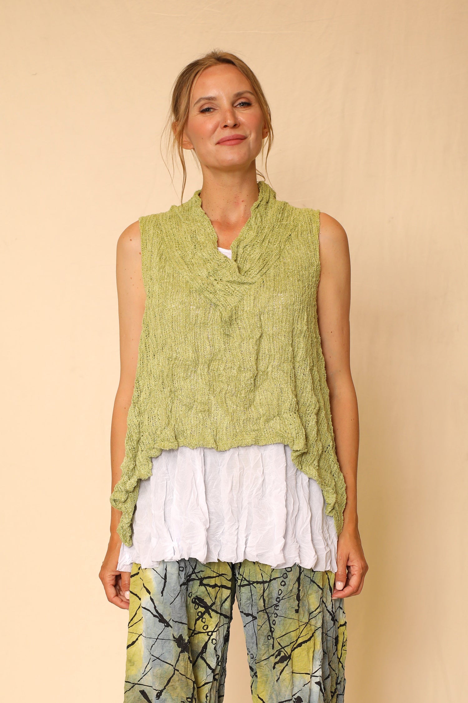 The breezy knit crinkled Adeline topper will prove to be your perfect companion for those warm balmy days. Effortlessly combining style and comfort, its wide overlapping tunic neck embraces the appeal of a sharkbite hem to aid in the look of a stunning A-line silhouette. A one-of-a-kind piece that evokes a sense of laid-back sophistication and style.