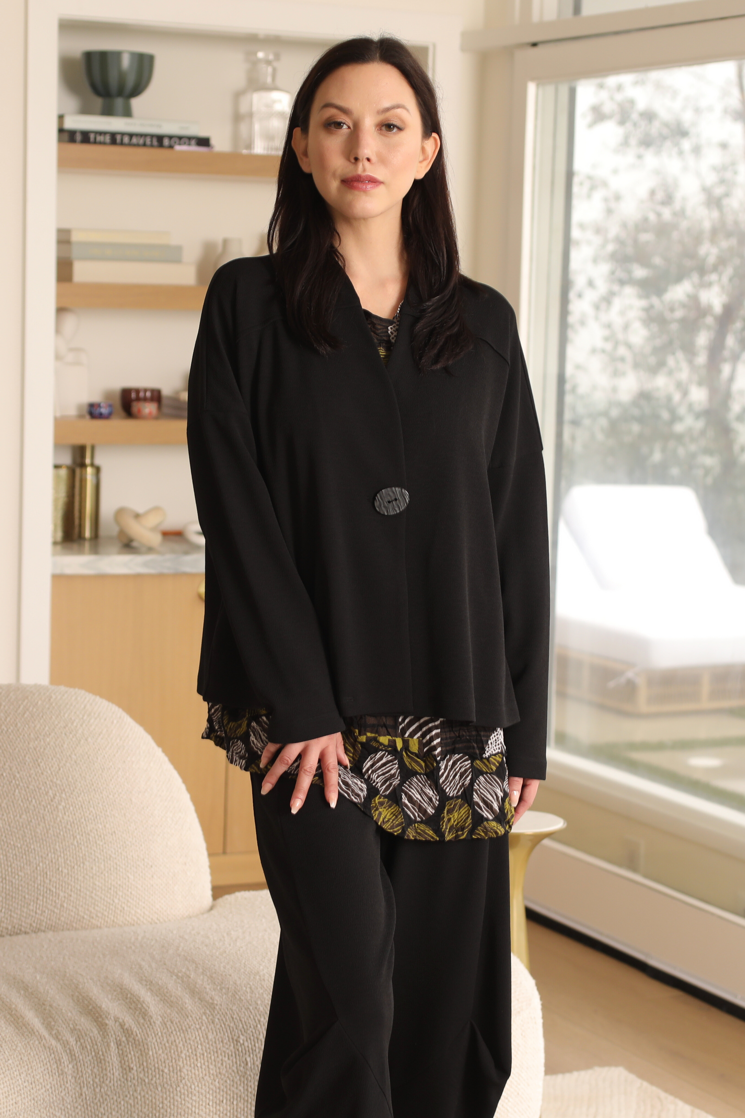 Bring an effortless sophisticated piece to your wardrobe in the buttoned Aelin Jacket. Perfected with drop shoulder long sleeves in a straight hemmed A-line fit, pair over any garment to complete a gorgeous look.