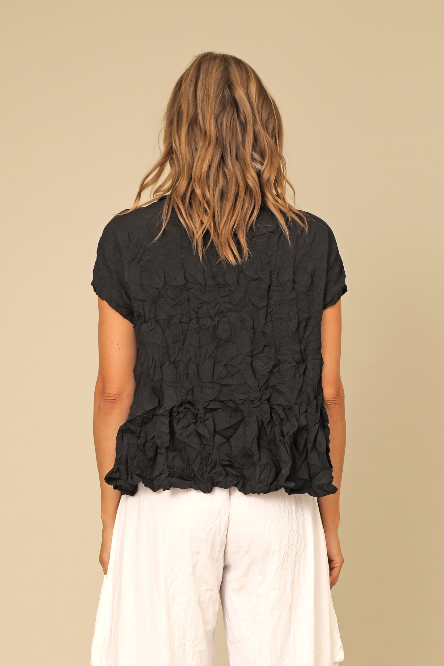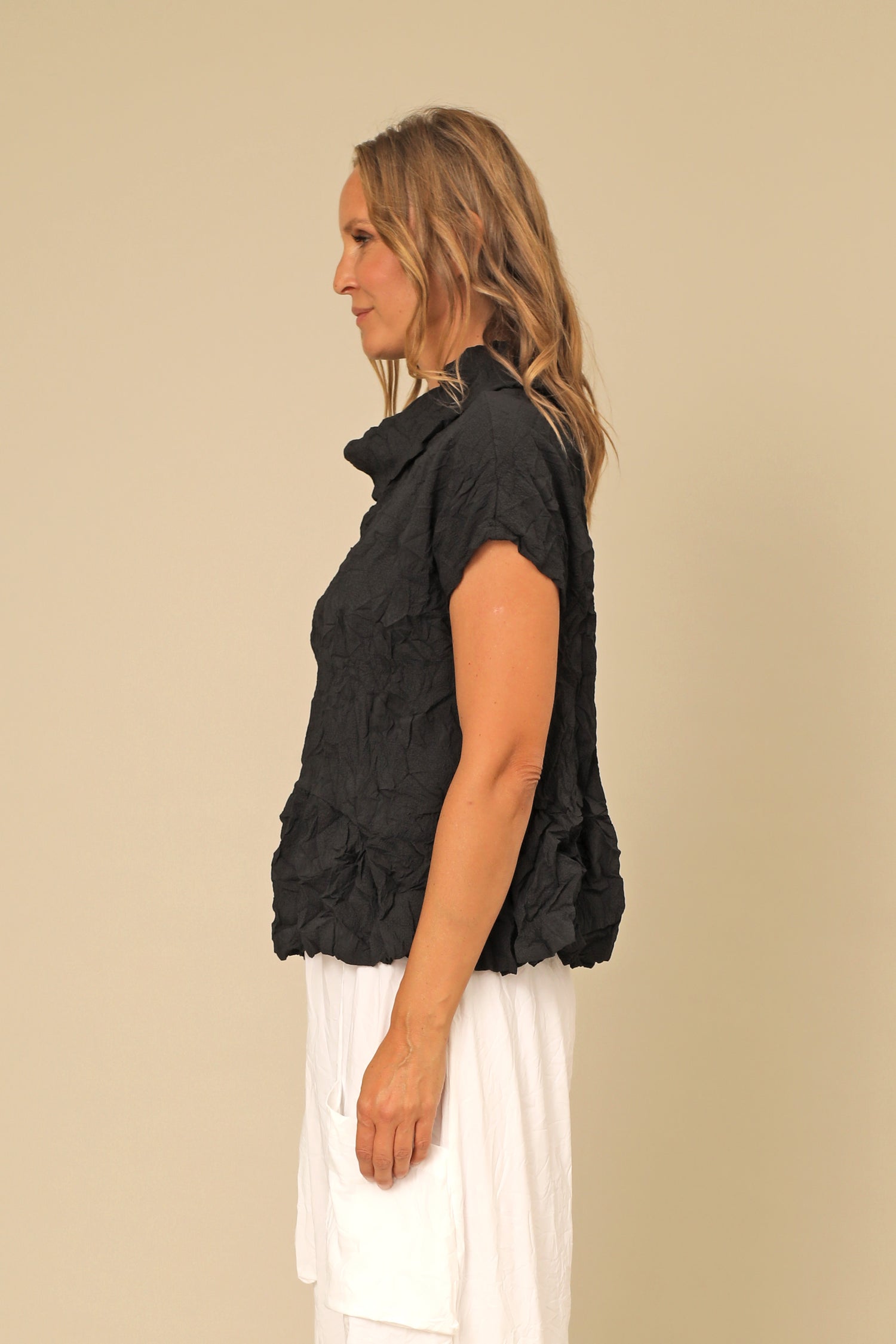 Elevate your wardrobe with the chic Amabel Top. Featuring drop shoulder sleeves and a loose mockneck, it offers a playful twist with shirring detail at the straight hem. The relaxed A-line silhouette and texture of our crinkled embossed woven fabric add a dash of whimsy to any look.