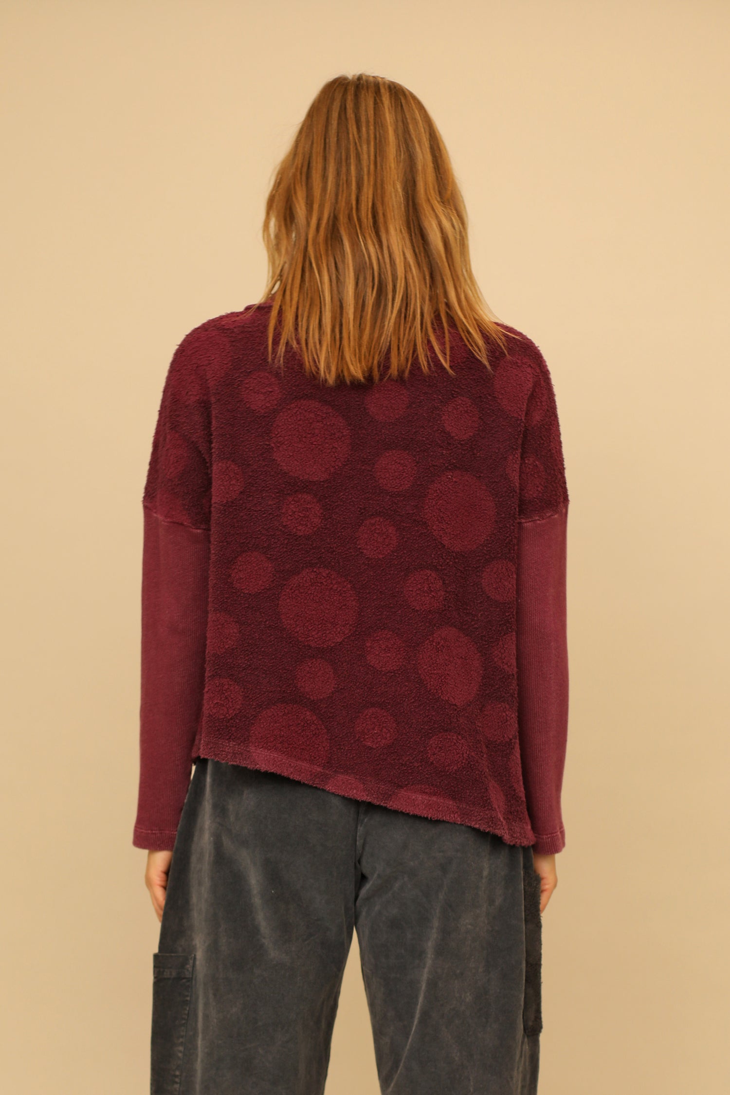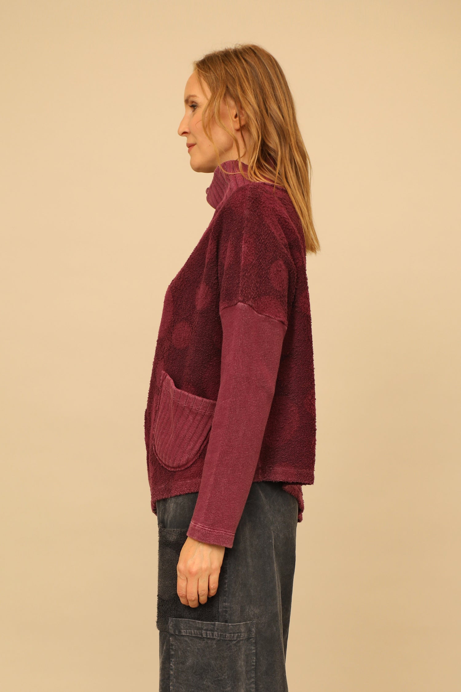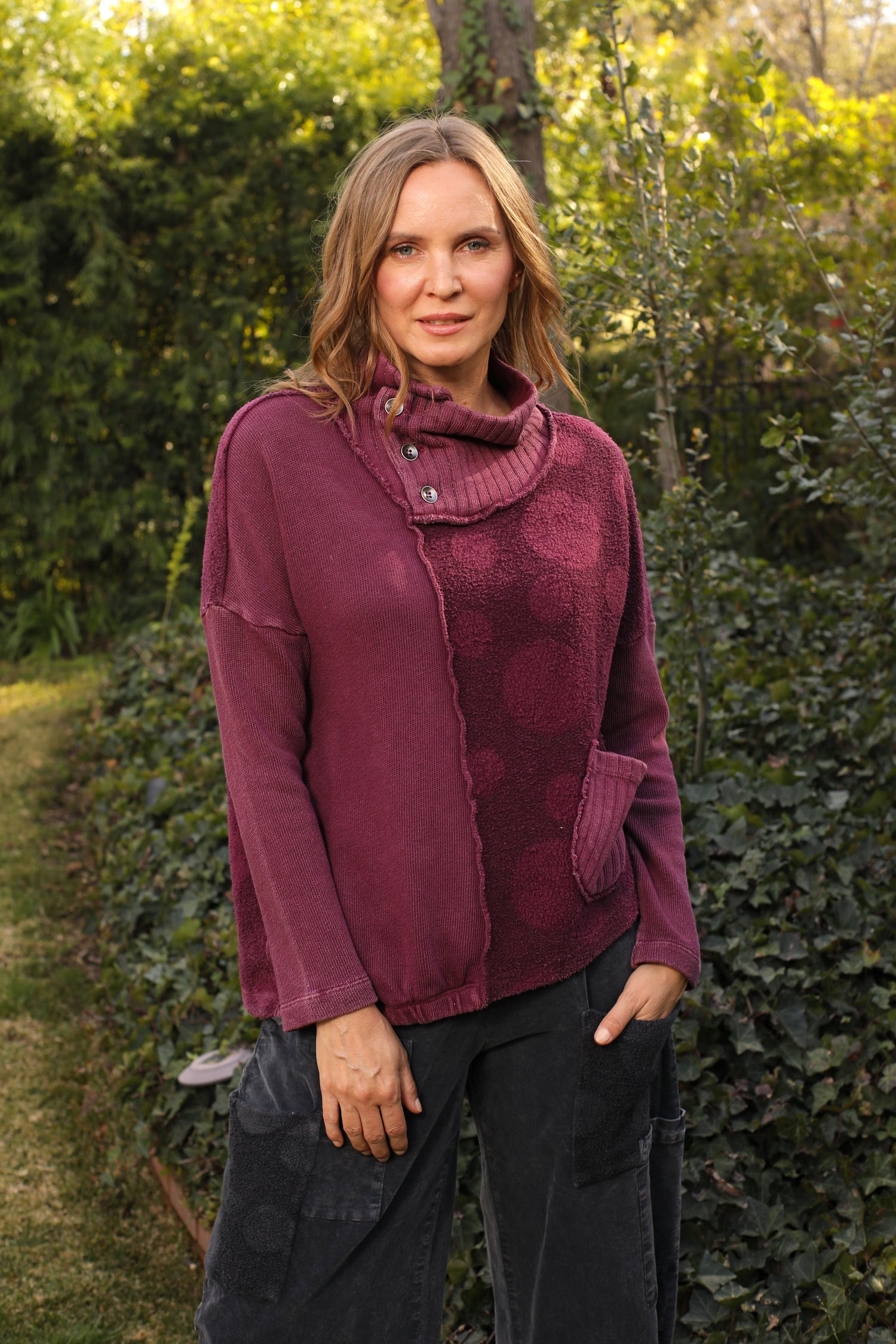 A fall essential with vintage inspired flair. The long sleeve Aniston Top comes with a button-up turtleneck and drop shoulder sleeves with a front patch pocket for comfort, while the raw edged contrasting fabric design tied with an A-line silhouette and a one-sided elastic asymmetric hem brings out more of the garments distinct finish from our unique dying process.