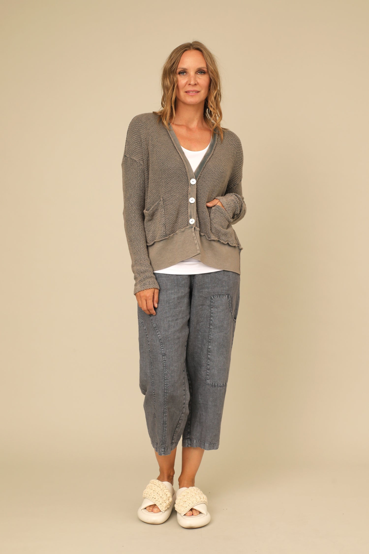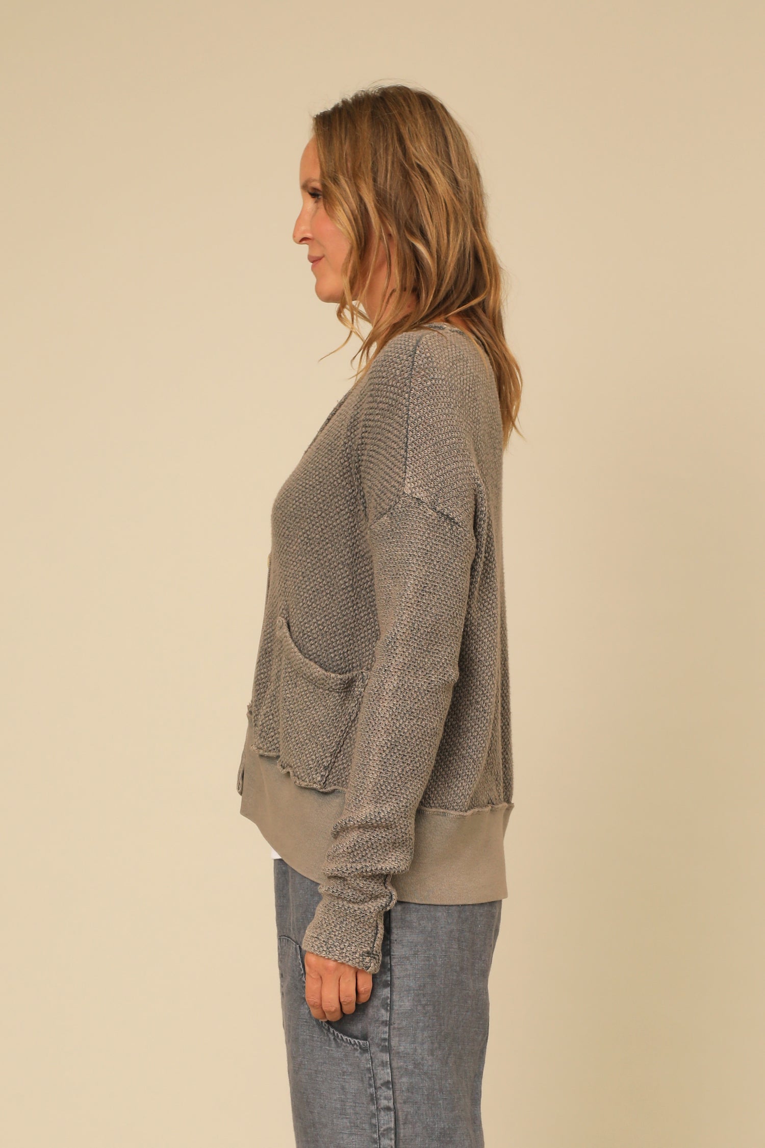 The Ansley Cardigan reimagines a cozy classic with a vintage washed feel. This sweater knit layering piece features a V-neck button front, fitted in a boxy silhouette and drop shoulder long sleeves. Ribbed contrast at the straight hem and patch pockets for a chic tactile charm.