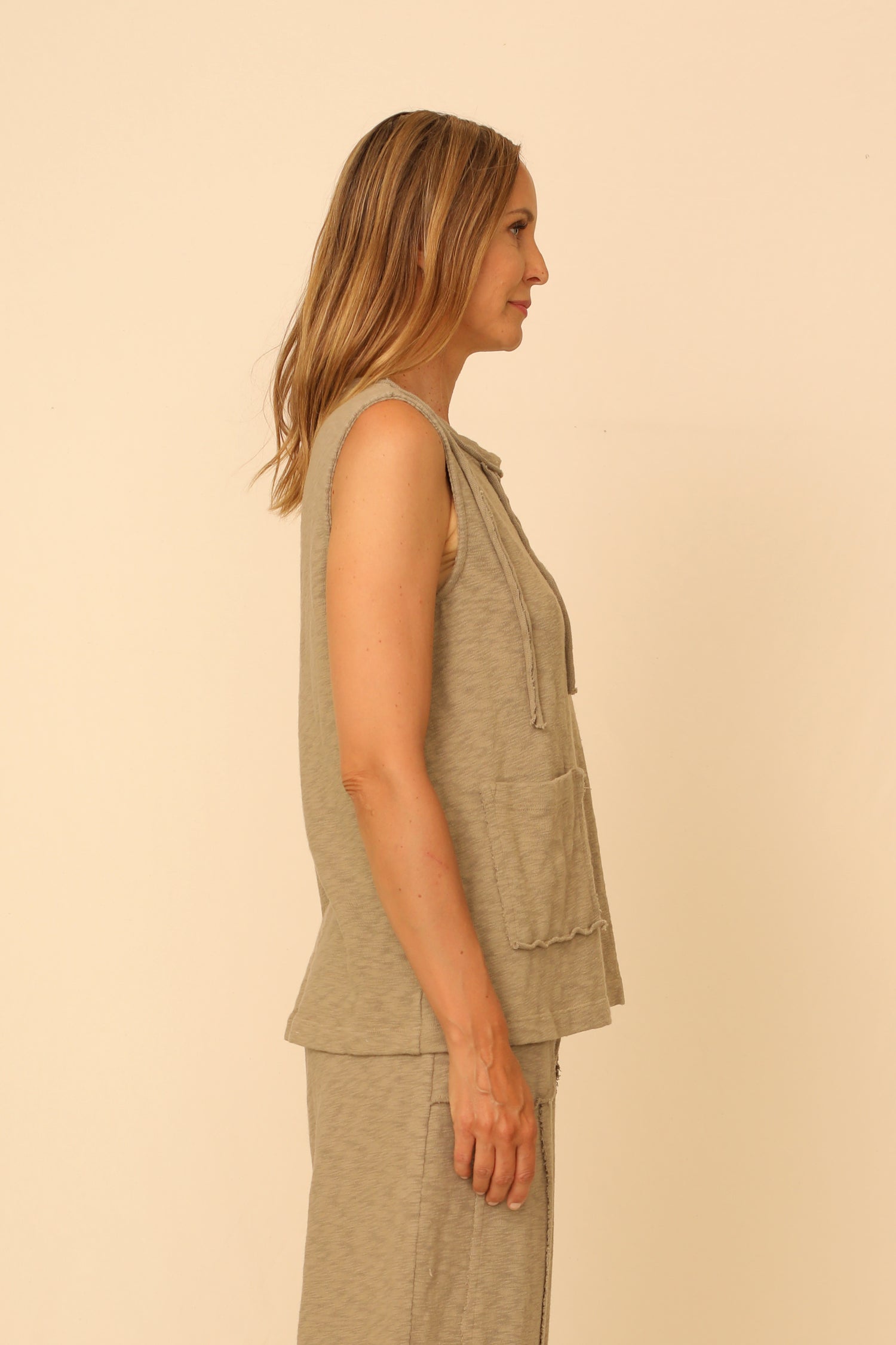 Refresh your wardrobe with the cotton slub sleeveless Aria Tank. Lightweight and extremely comfortable, easily able to throw on or layer. Brightening your look with raw edge details on the dripping front seams and rounded neckline, fitted in an A-line fit to flatter your silhouette with a straight hem and patch pocket.