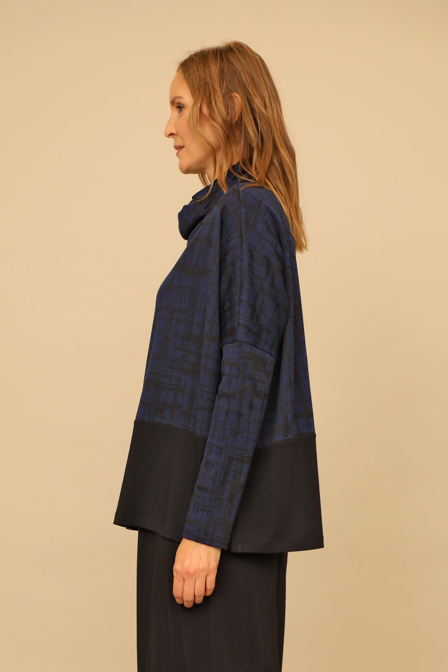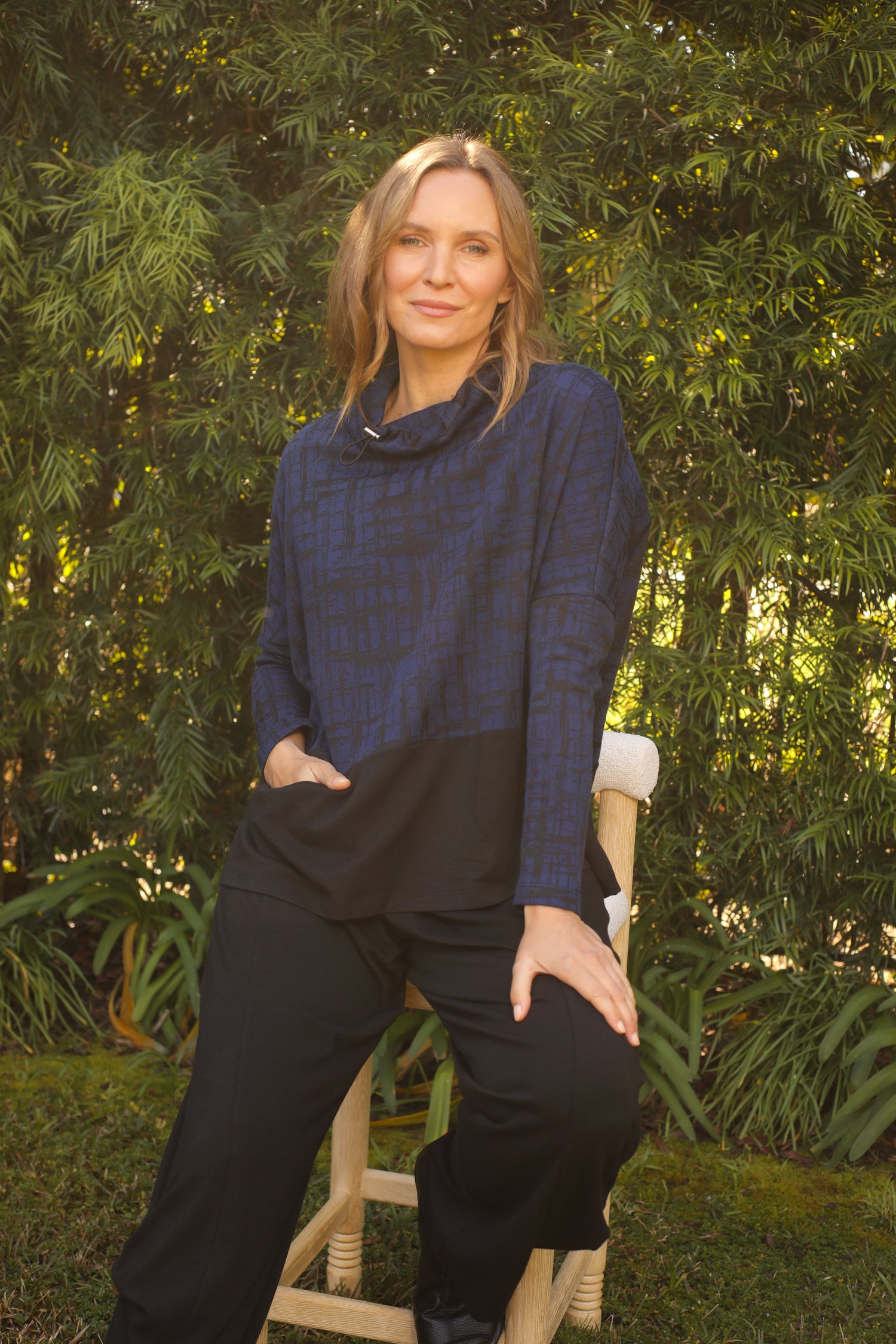 The epitome of comfort and luxurious style is personally brought to you by our drop shoulder long sleeve Arya Top. Our daring abstract knit pattern or smooth bamboo fabric are highlighted in this garment, with its drawstring turtle neckline and the black bamboo solid contrast at the straight hem with an inseam pocket. Fitted in a boxy silhouette to perfectly pair with our Natalie Pant.