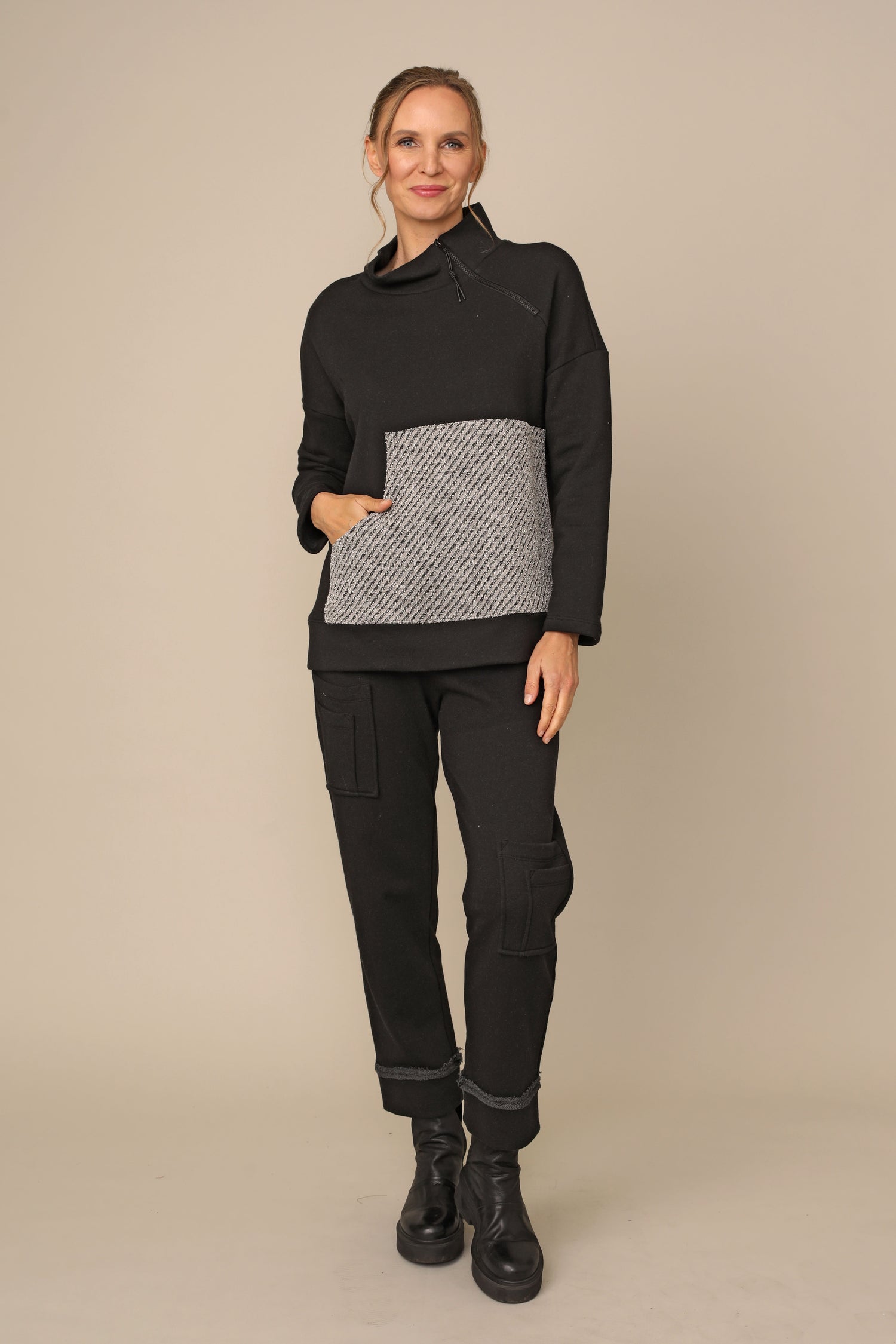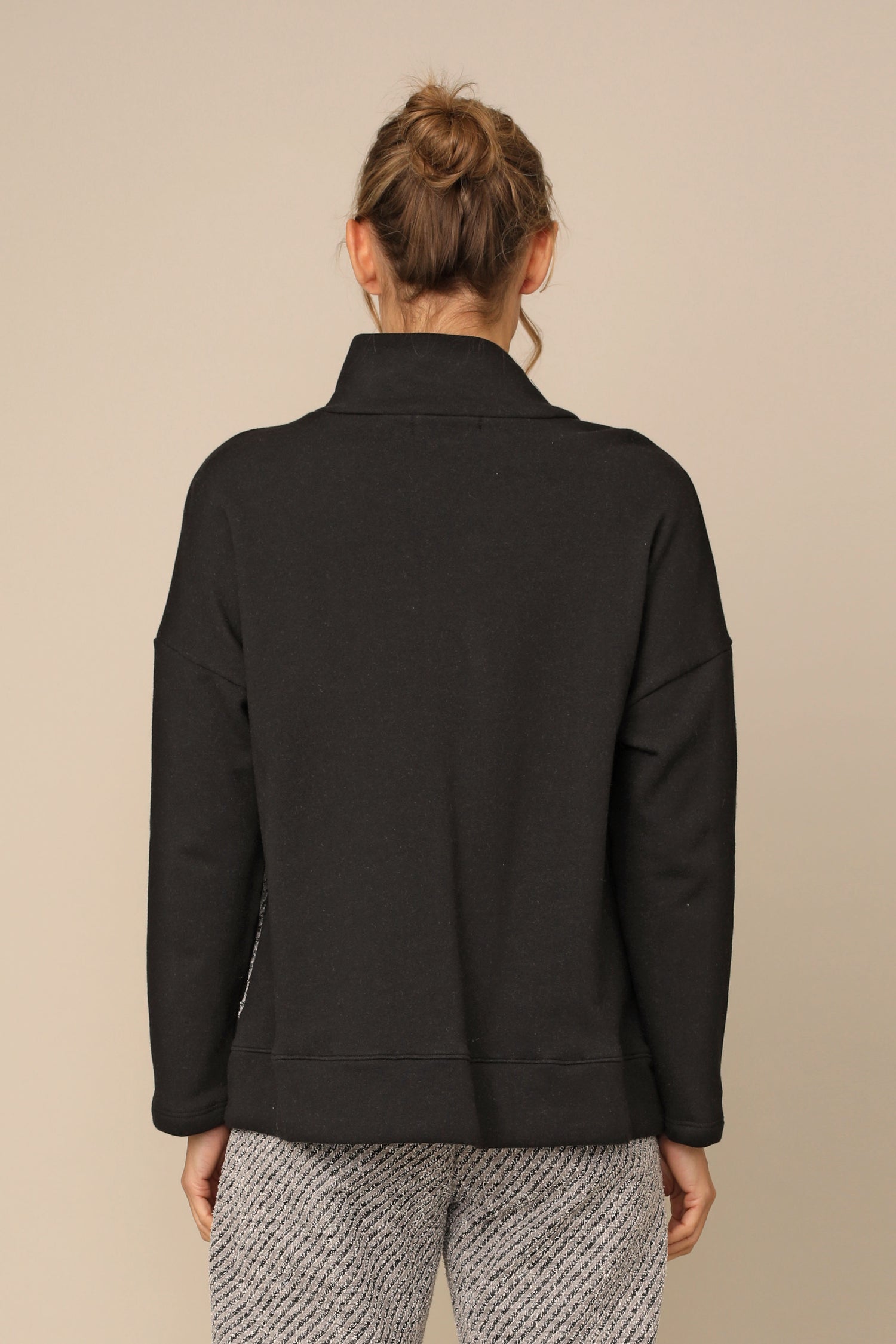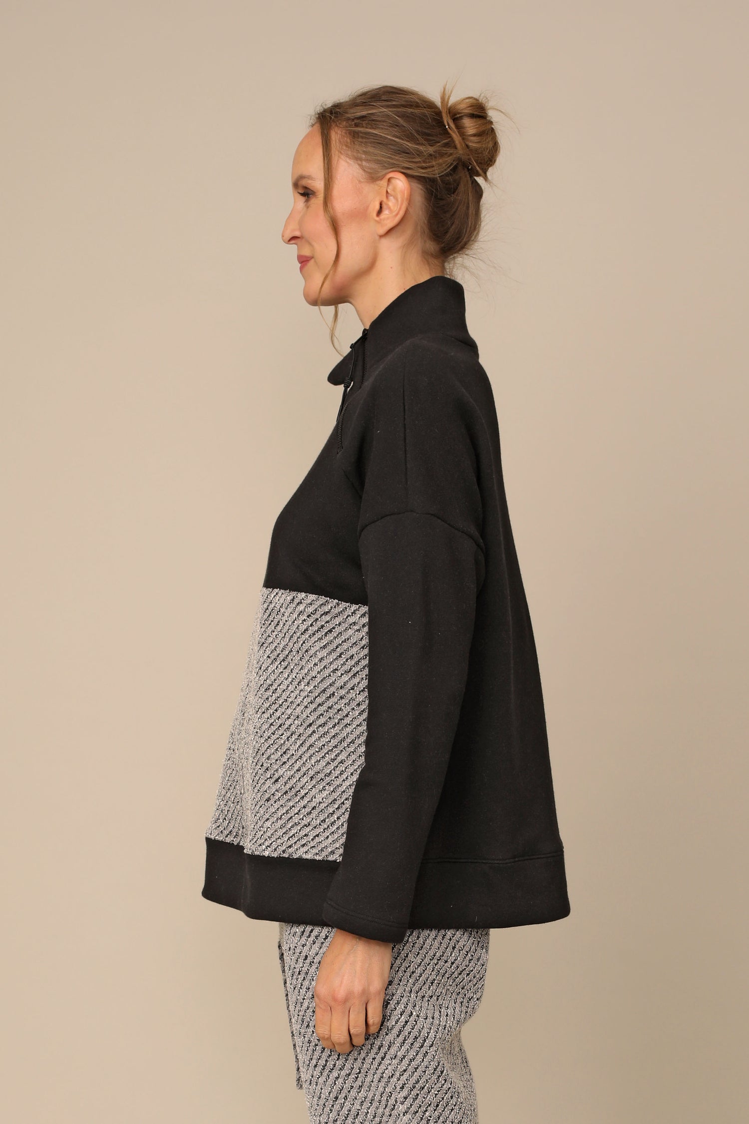 The Aubree Top pairs a zipper trimmed mock neckline with drop shoulder long sleeves. Designed in solid french terry fabric in a boxy silhouette, finished with a contrasting striped jacquard patch pocket for a unique touch.
