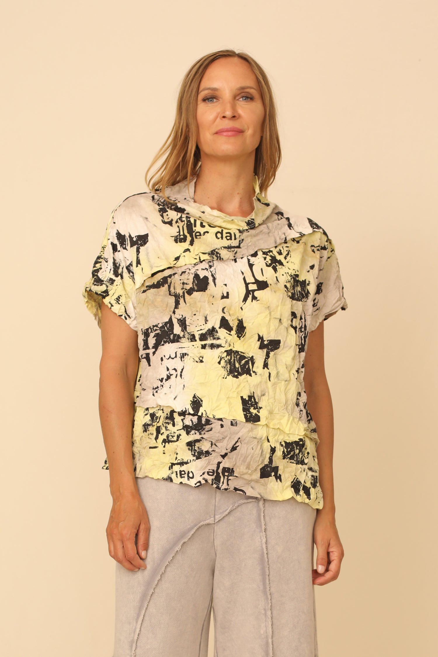 Elevating your basics, the Beatrix Top carries the familiar characteristic of comfort with dolman short sleeves and a loose mock neckline in a boxy silhouette, while the unique details of an asymmetric hemline and diagonal pleat details explore an artistic perspective. Offered with unique hues in our lightweight crinkled fabric that can create statement pieces or breathtaking sets.