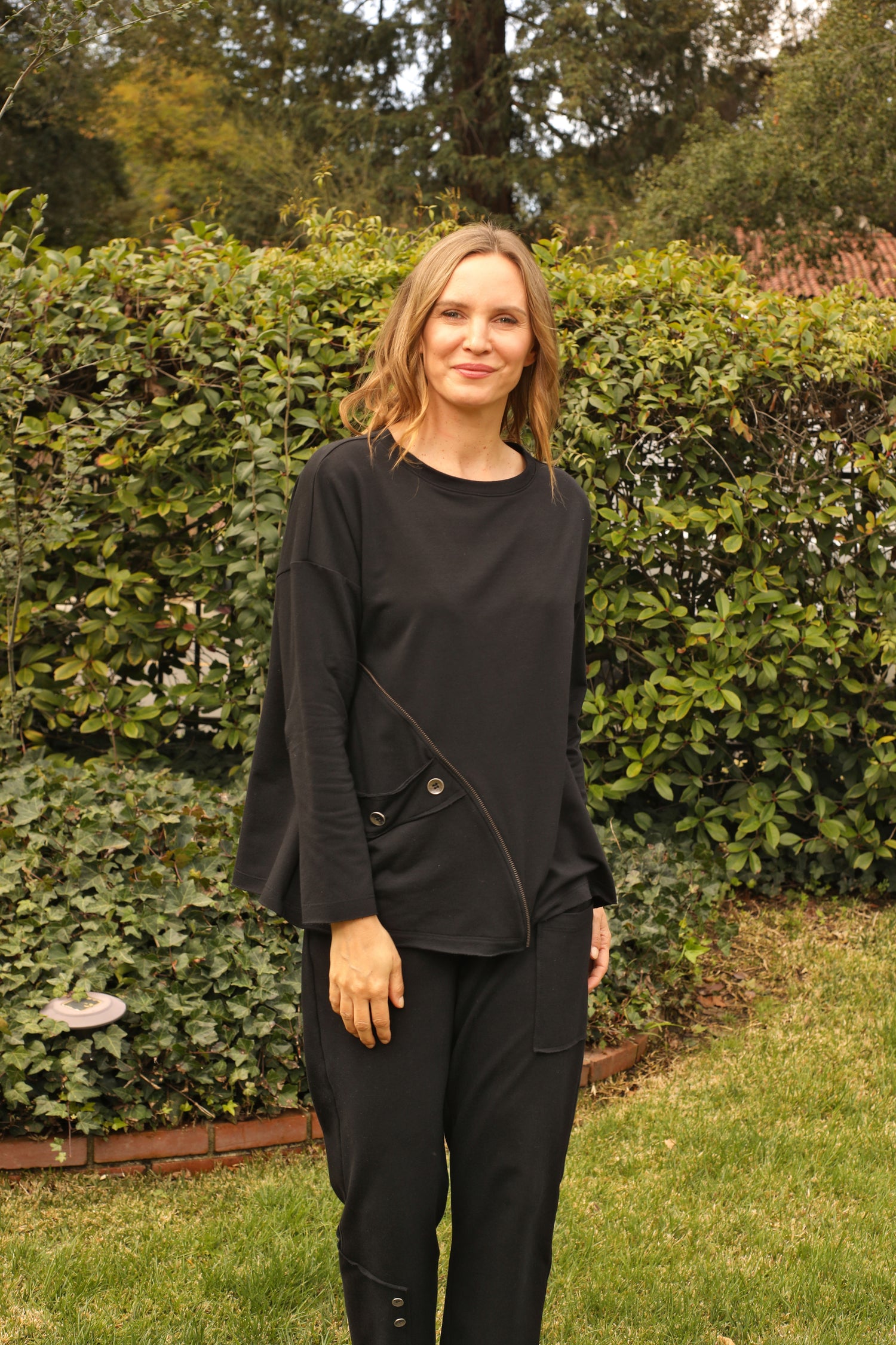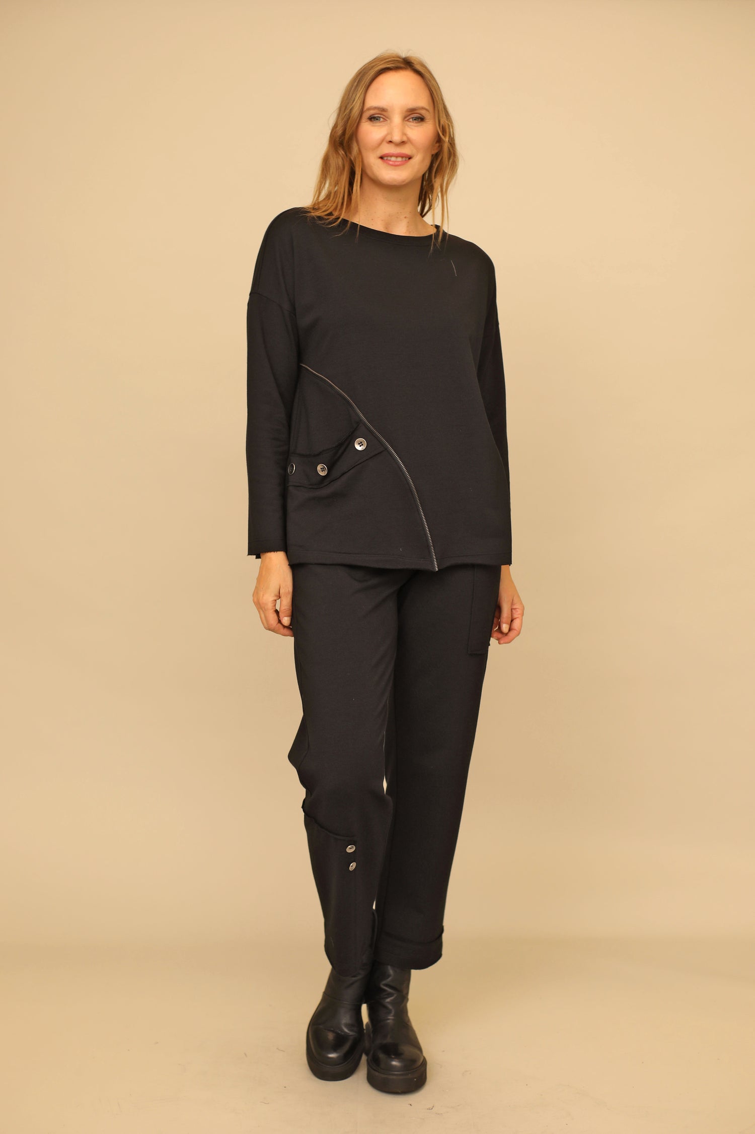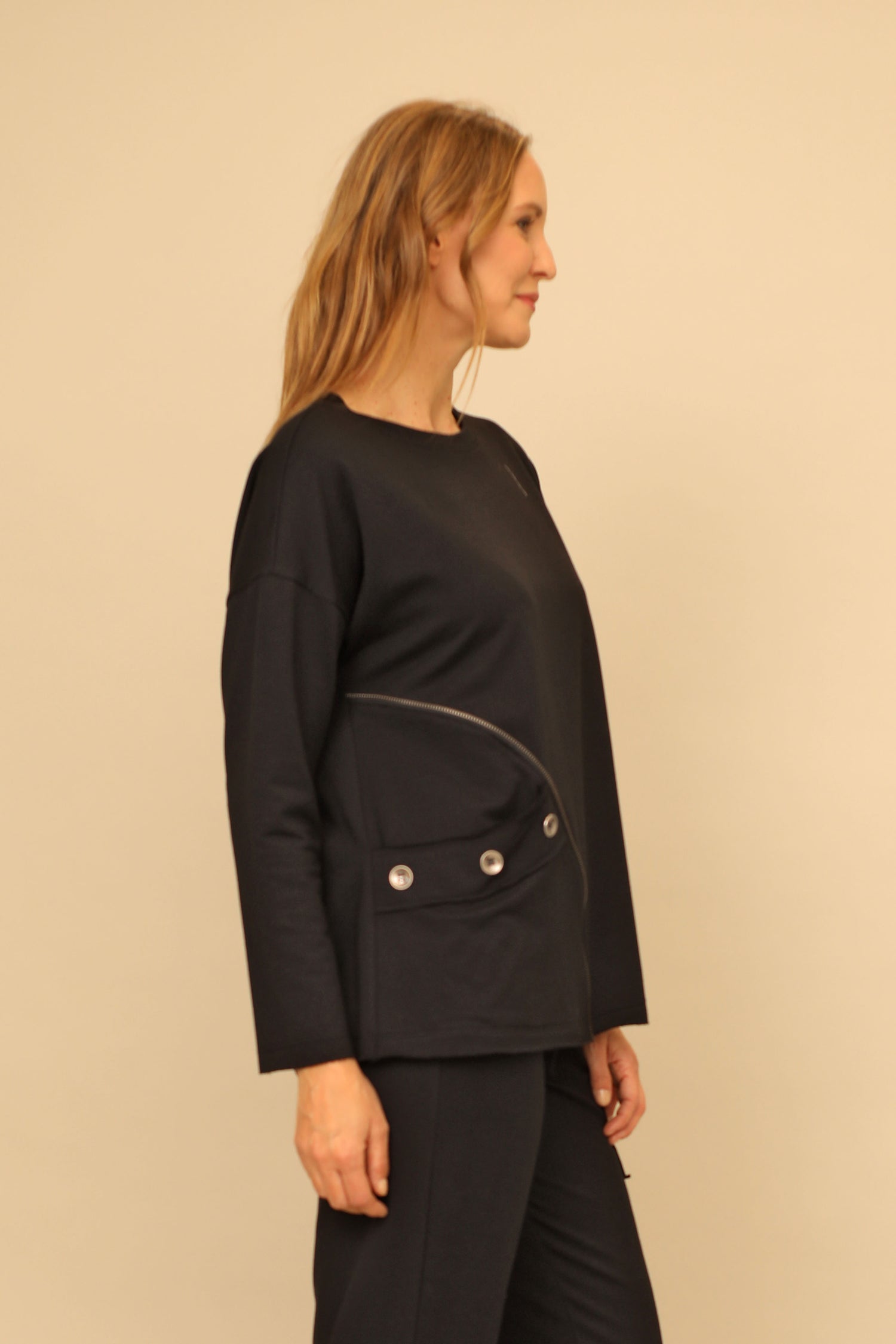 Embrace comfort with the Brie Top. Its long sleeves, rounded neckline, and boxy silhouette provide a familiar feel, while the striking zipper teeth trim and button-detail inseam pocket add a contemporary edge. Available in a range of beautiful colors, this top is made from cozy solid French terry fabric.