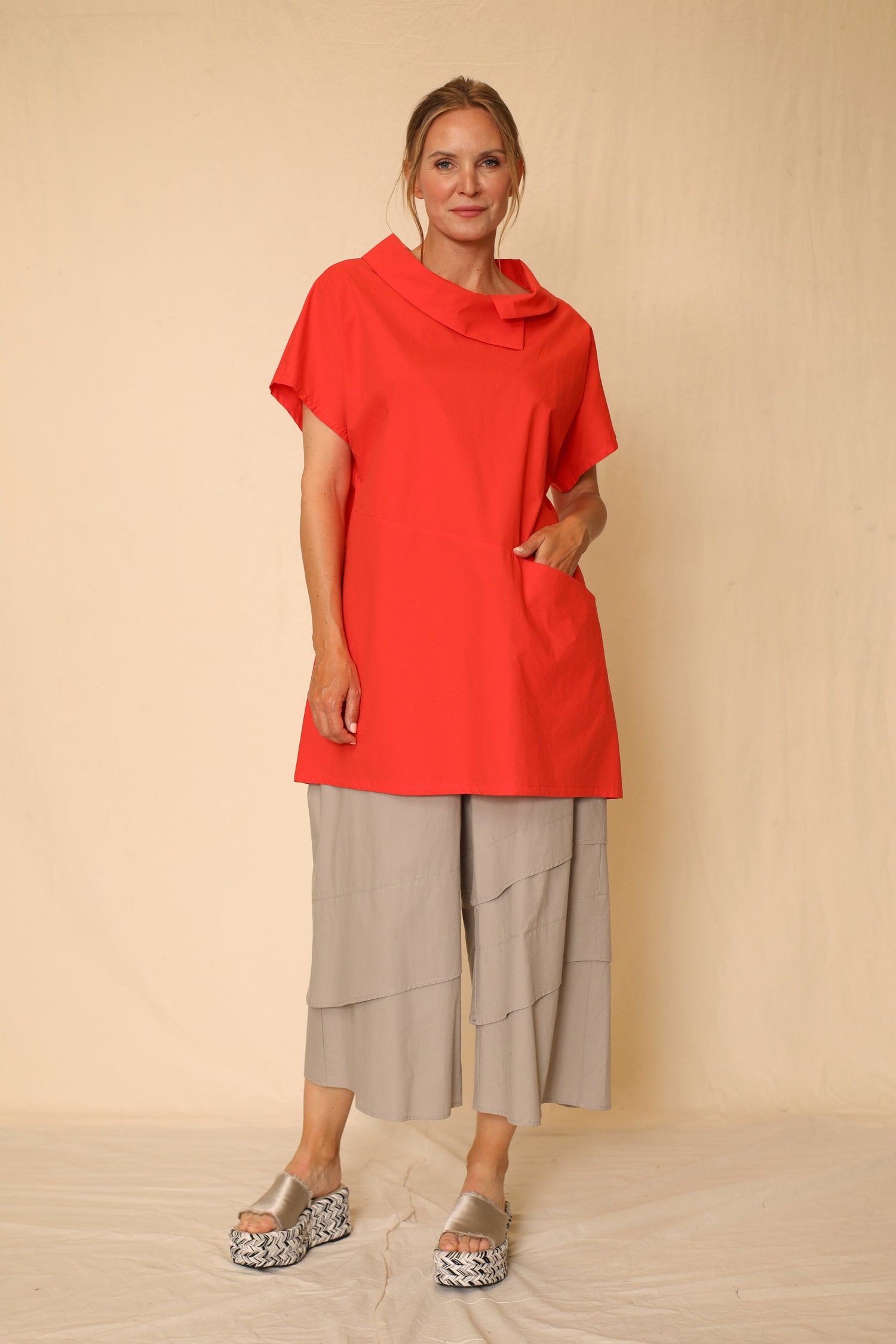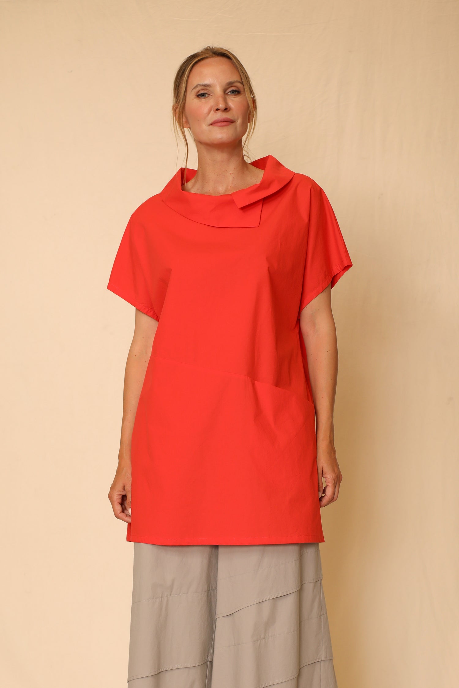 Bring a gorgeous touch to your wardrobe with the Danielle Tunic. The wide asymmetric layering neckline and the flow of its midline seam detail with an inseam pocket magnifies to elevate alongside the simplistic elements of the garment, fashioned with drop shoulder sleeves and straight hem in our cotton woven fabric.