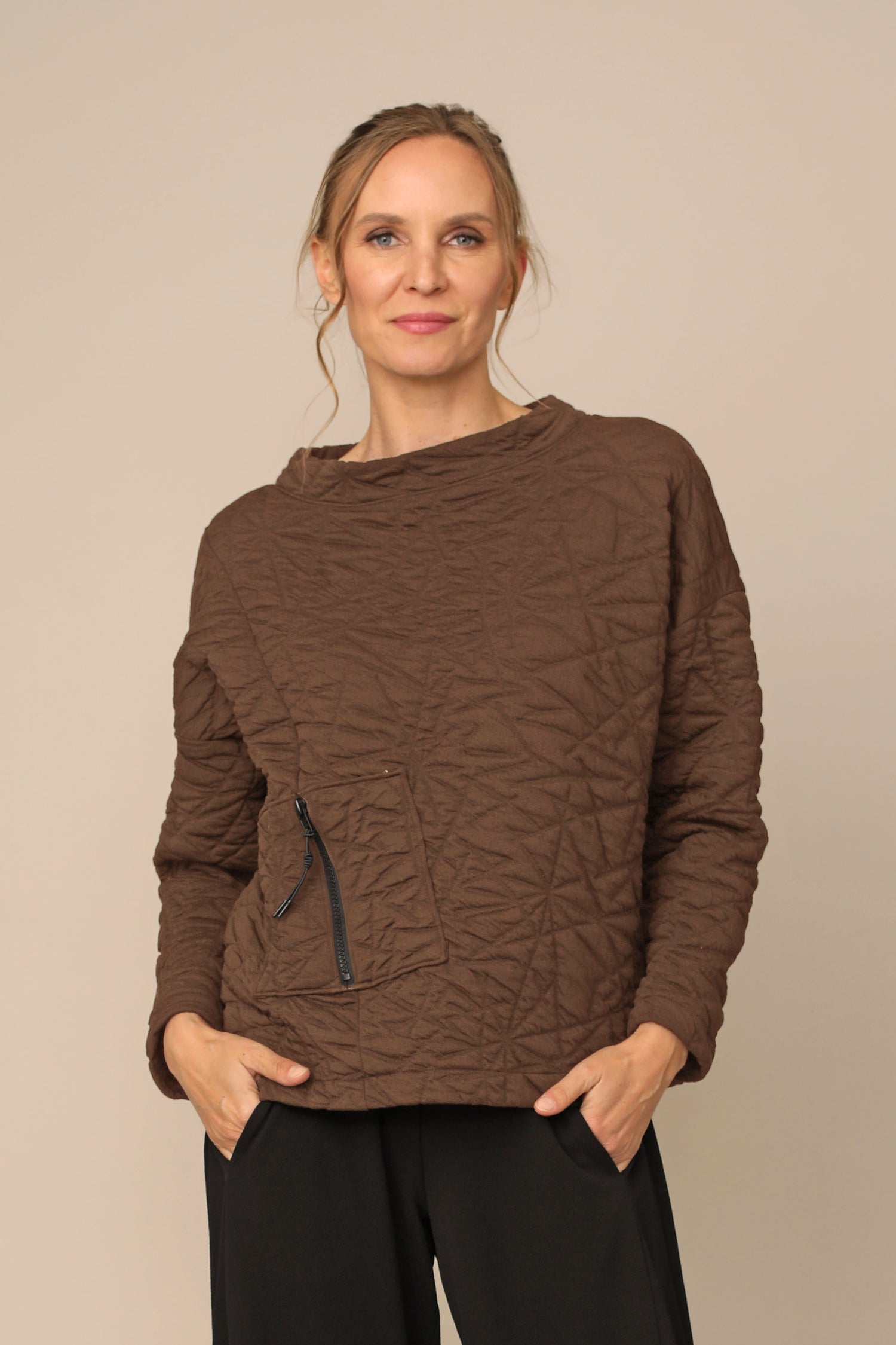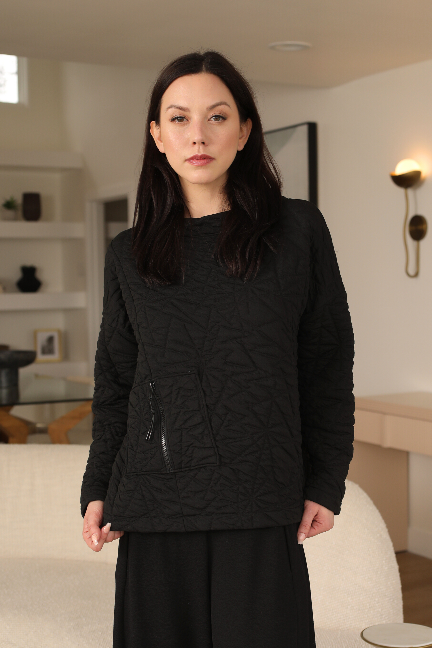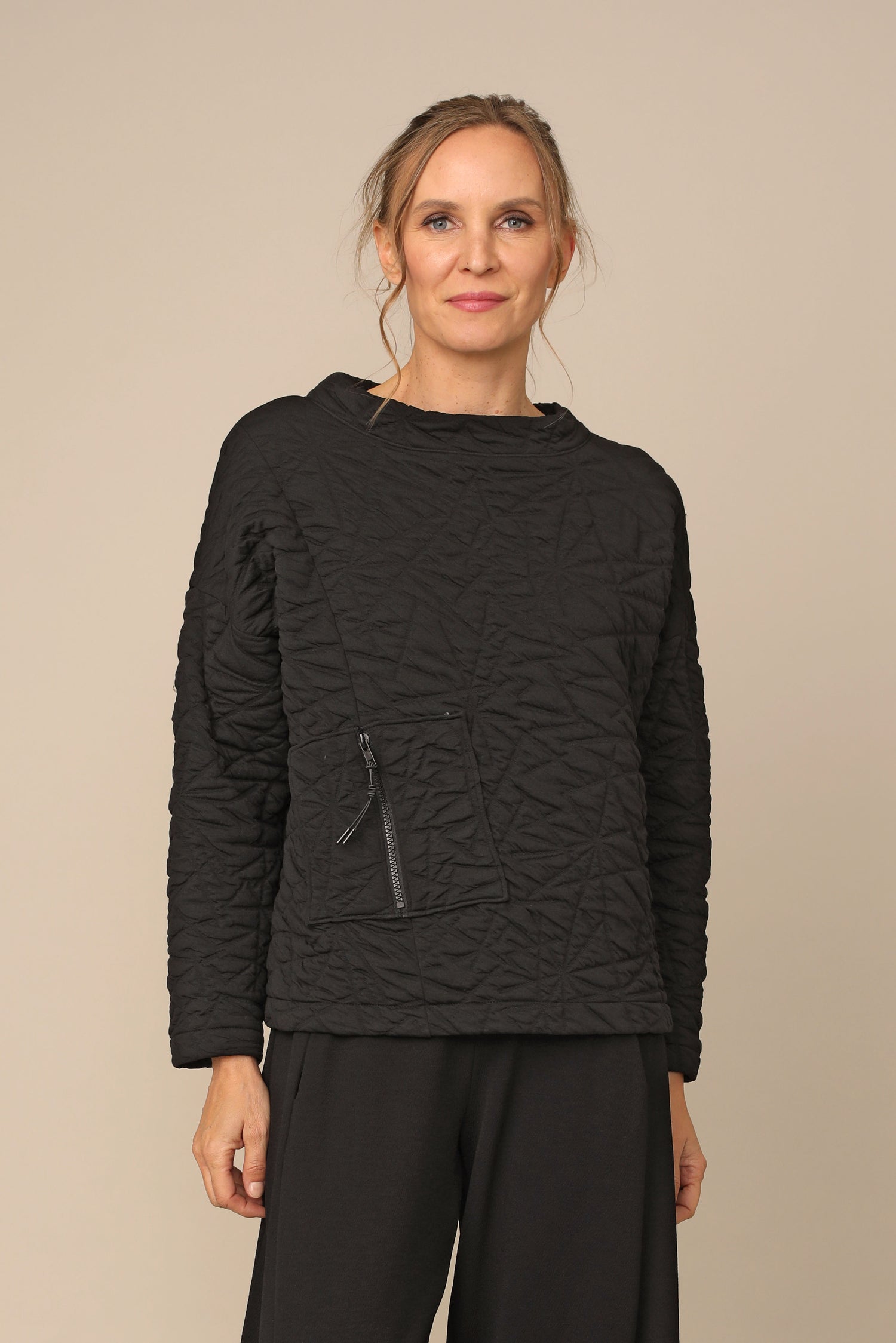 The Danni Top is effortlessly fitted for any occasion, yet beautifully curated for all day wear in our bold textured puff jacquard that carries you with ease. Thoughtfully designed with drop shoulder long sleeves alongside a banded rounded neckline and front zipper pocket in a straight hemmed boxy silhouette.
