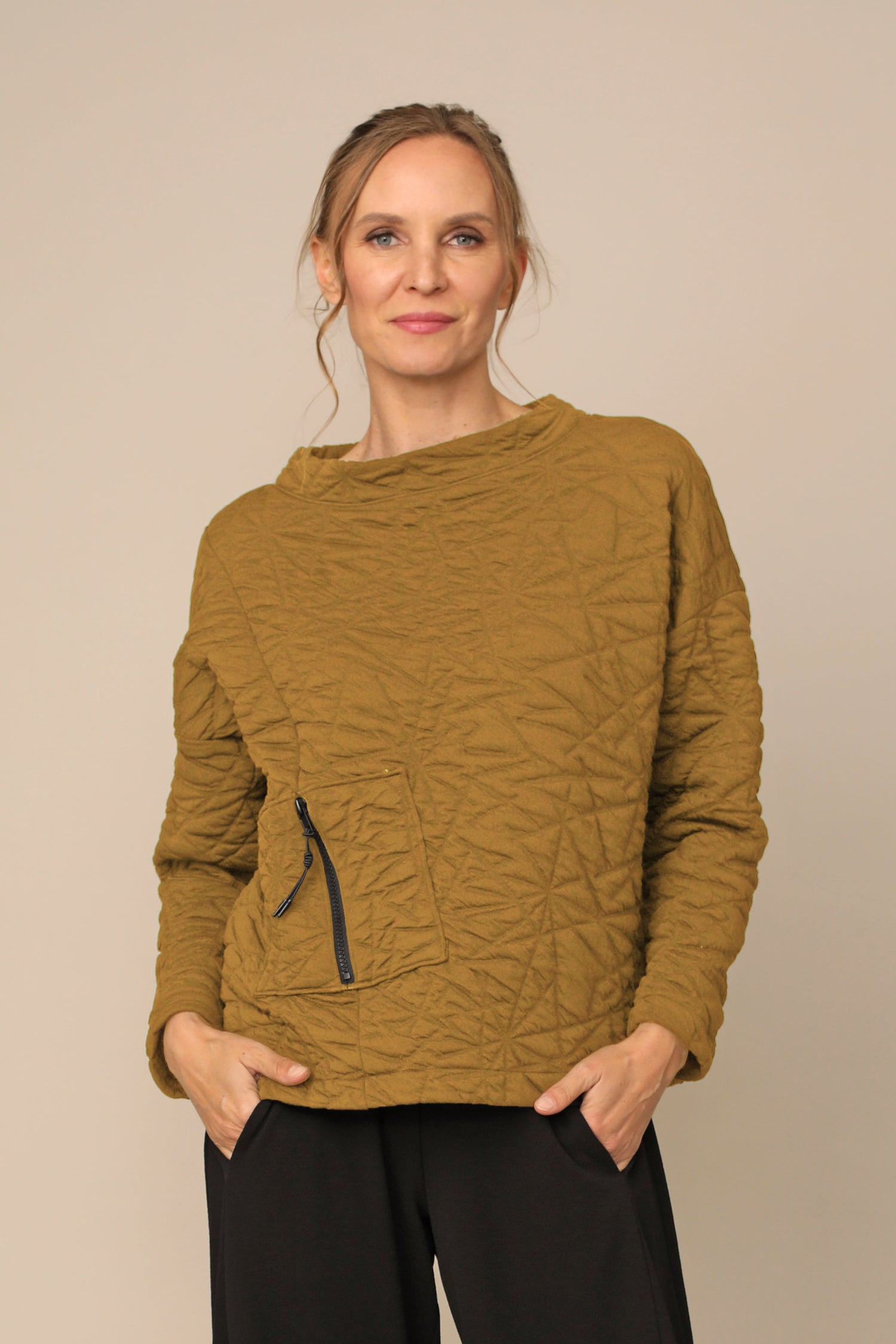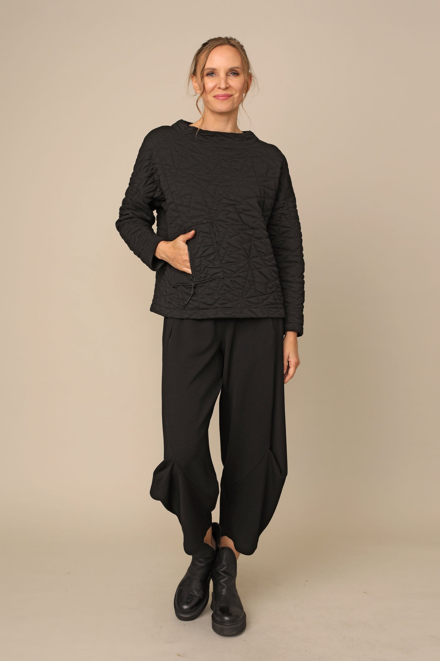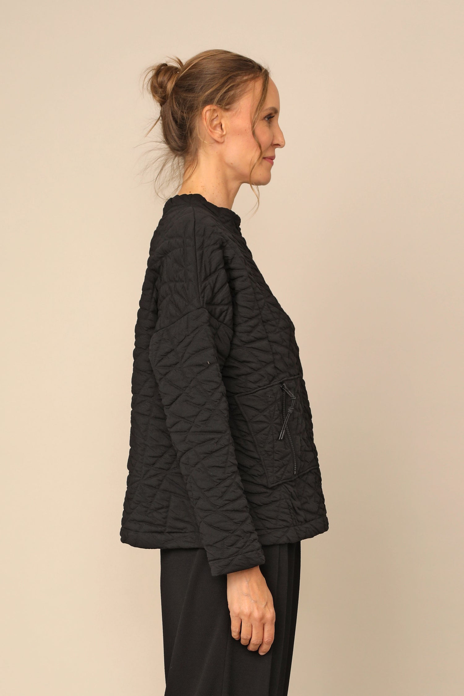 The Danni Top is effortlessly fitted for any occasion, yet beautifully curated for all day wear in our bold textured puff jacquard that carries you with ease. Thoughtfully designed with drop shoulder long sleeves alongside a banded rounded neckline and front zipper pocket in a straight hemmed boxy silhouette.