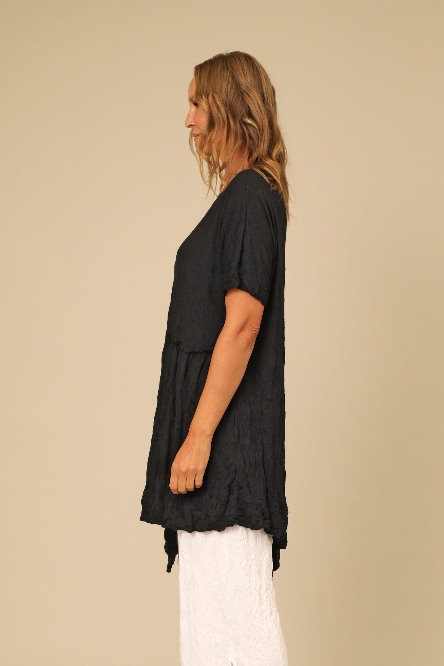 Meet the new Dolly Tunic, your playful effortless go-to featuring dolman sleeves with a chic cinched detail and in seam pocket. A flattering A-line silhouette and asymmetric hem alongside a rounded neckline, this recycled crinkle jersey tunic offers a fresh, carefree aesthetic for those sunny days.