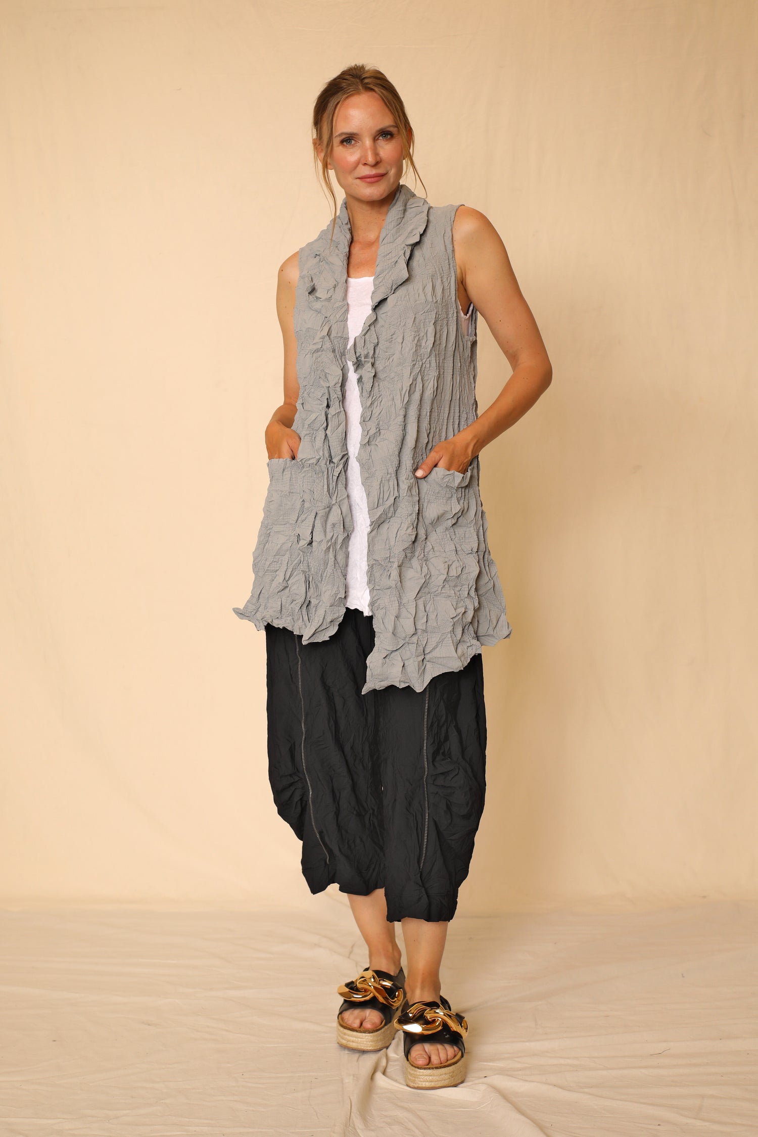 Whether thrown over a long sleeve or our Crinkle Jersey Liz Tank, the sleeveless Dulce Vest is here to give the best. Its notched shawl collar will always give you a dashing feel, while its A-line fit and asymmetric hem works to flatter. Our travel friendly crinkled embossed woven fabric, whether across the street or across the country, will always be ready when you are.