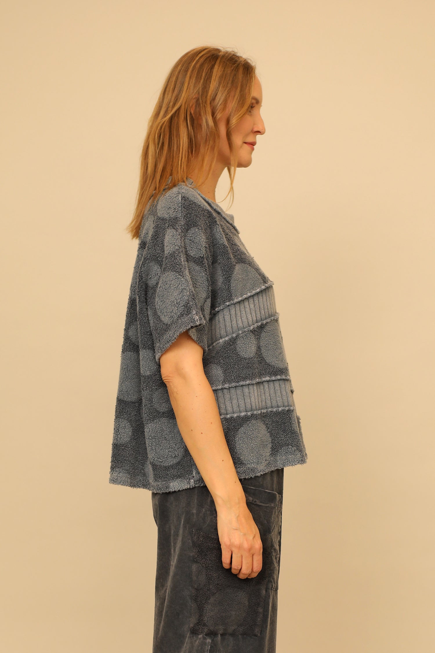 The Eileen Top showcases a familiar silhouette with dolman elbow sleeves and a rounded neckline in a straight hemmed boxy silhouette, but boldly stands out with its contrasting fabric design and raw edge seams for a natural effortless look with our exclusive dying process to give its own specialized finish.