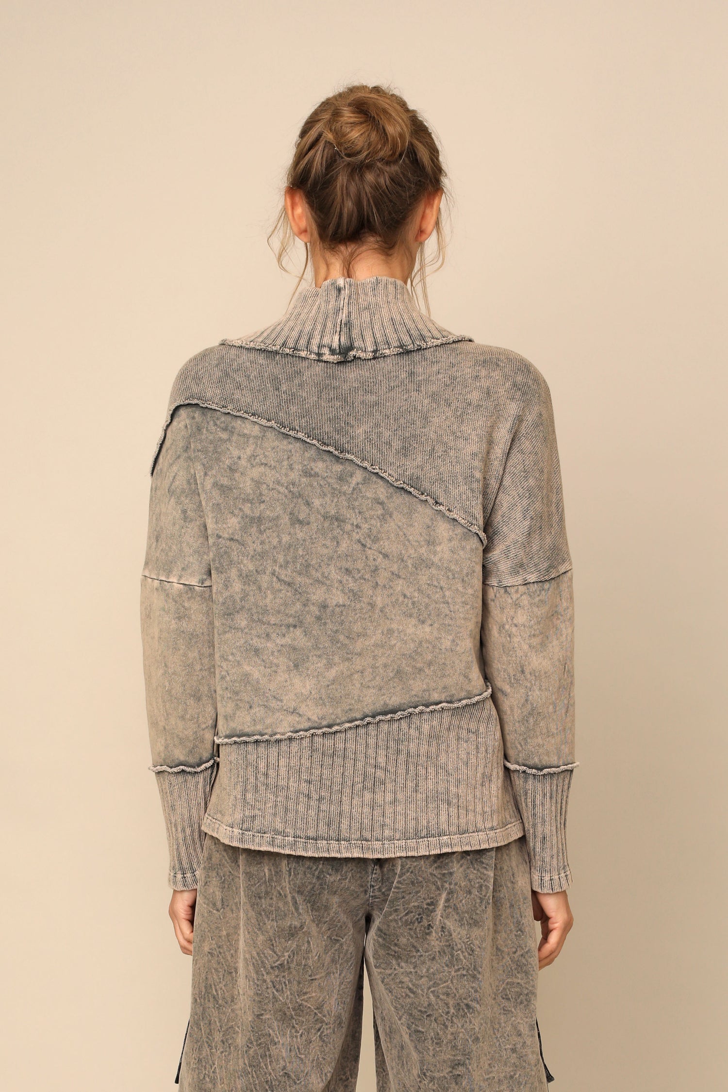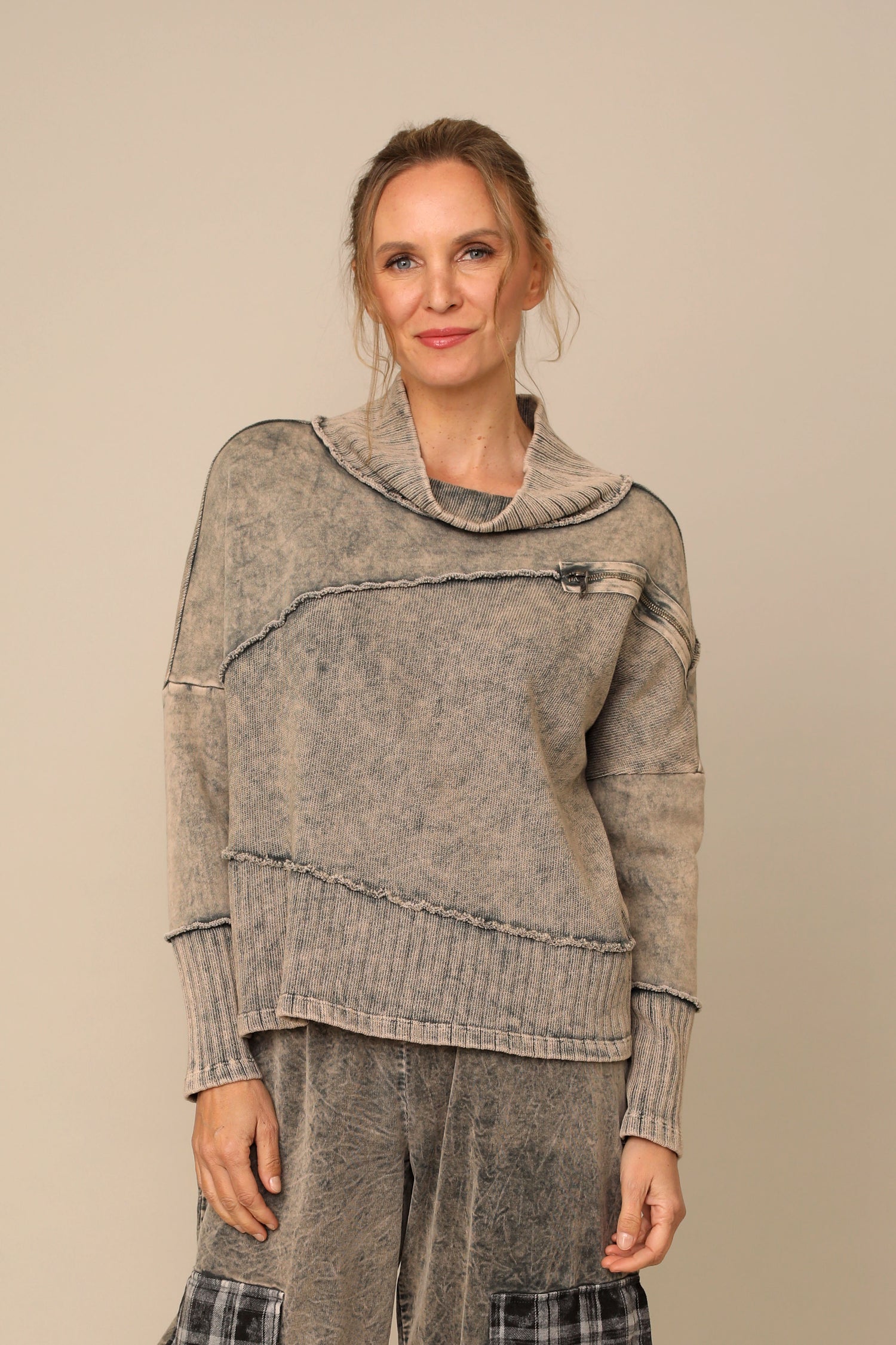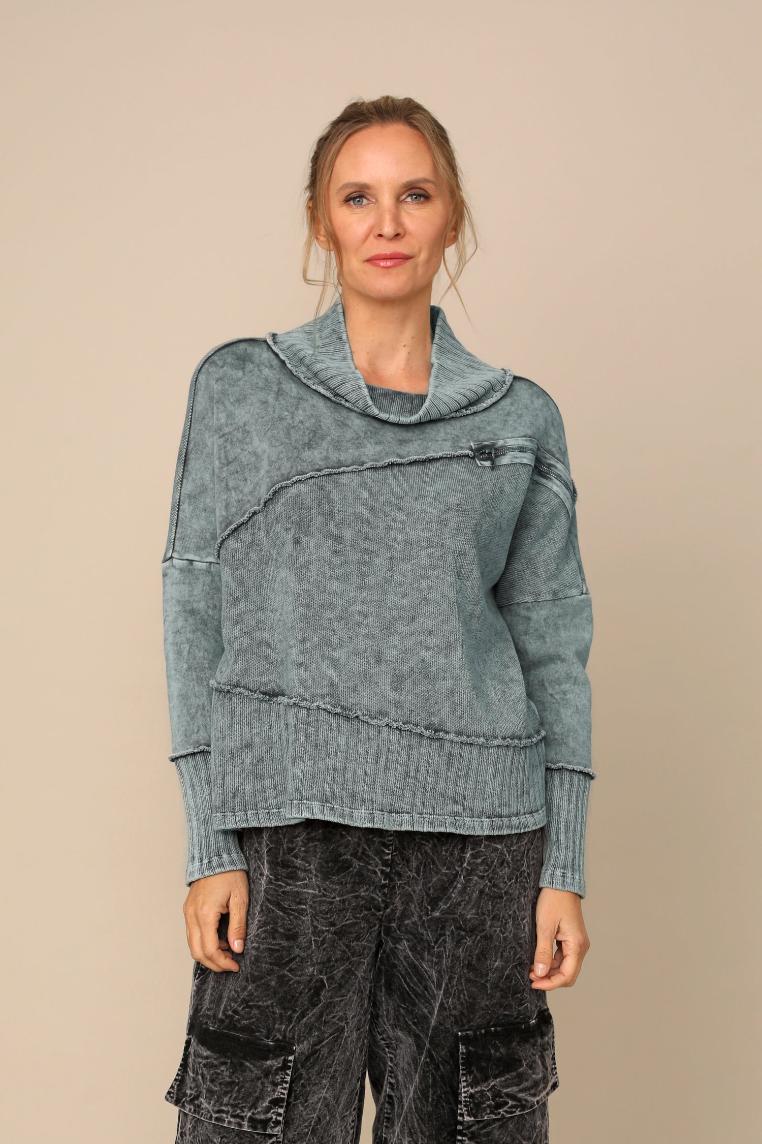 The drop shoulder long-sleeved Elenore Top redefines chic comfort. Featuring a mock neckline with asymmetrical seams that run across the contrasting body and a zipper trim in a straight hemmed boxy silhouette. Alongside its vintage wash, it truly brings out a unique character to any outfit.