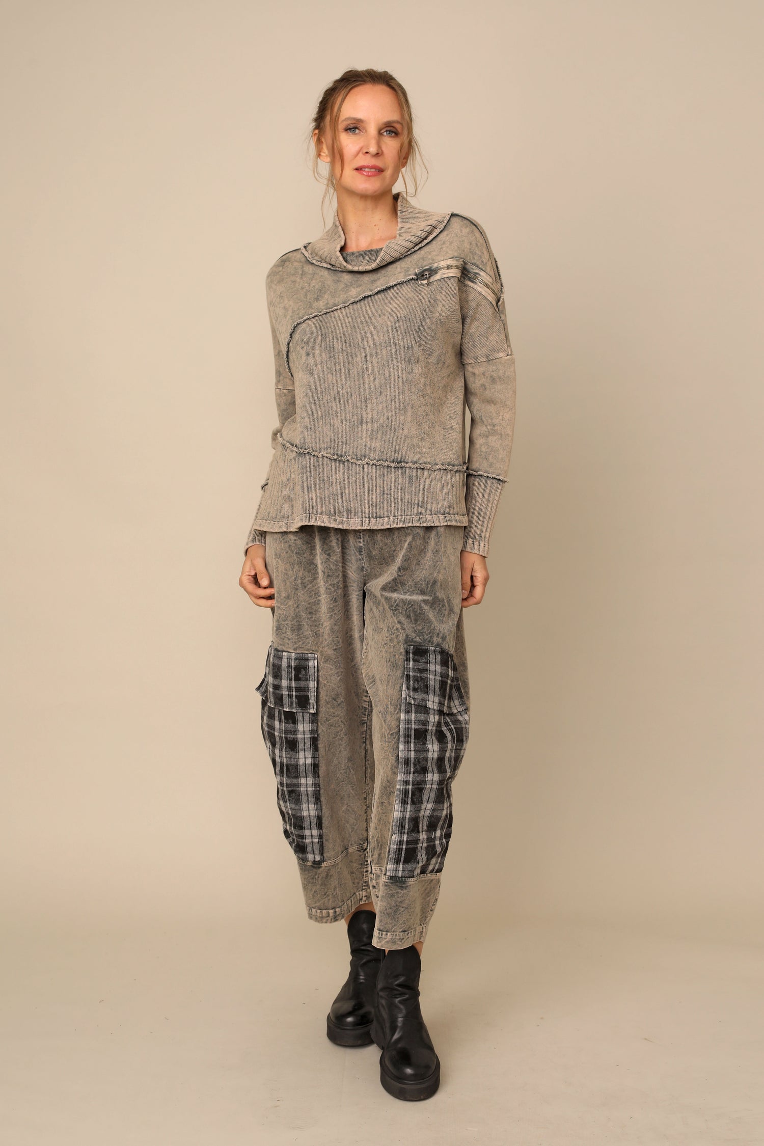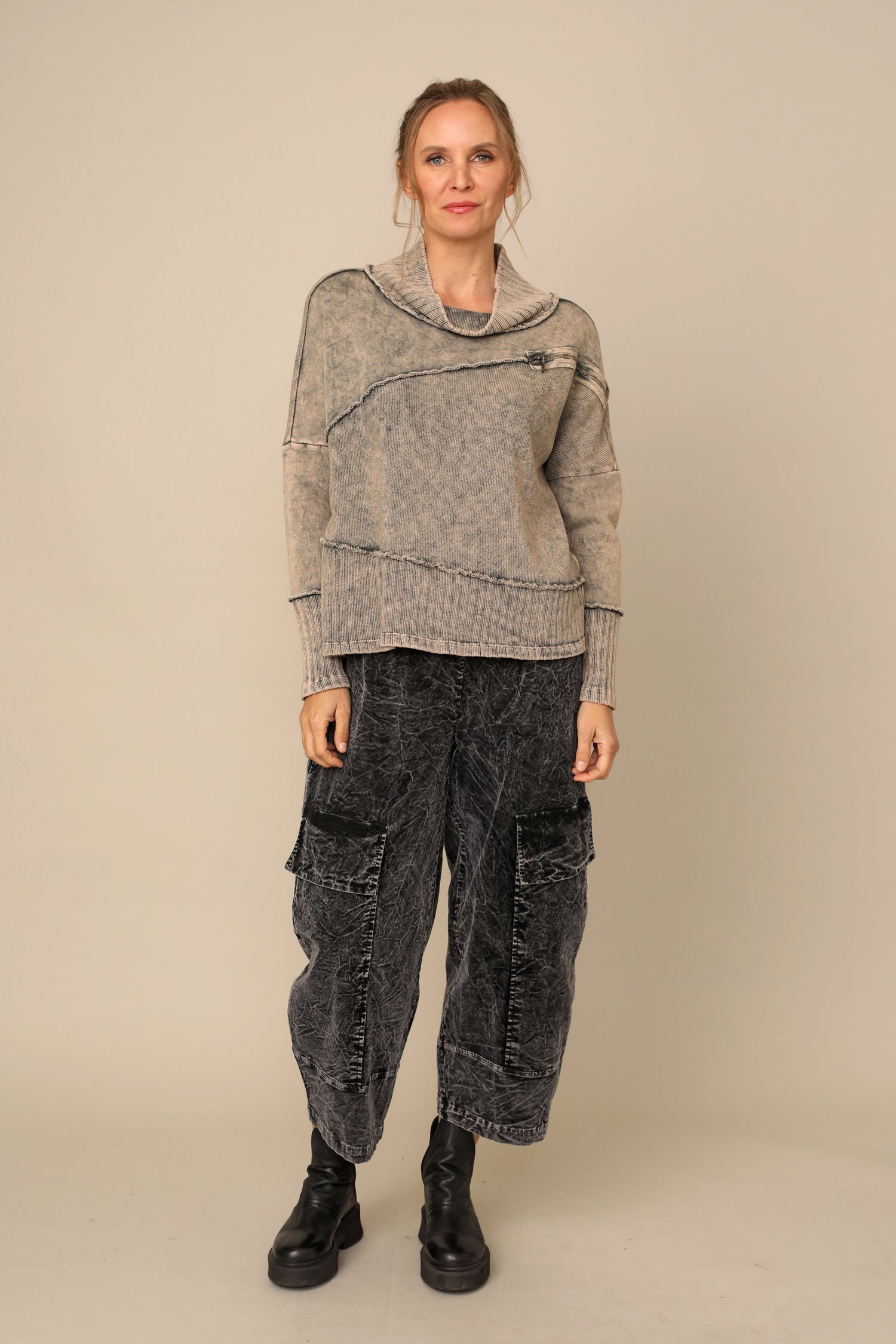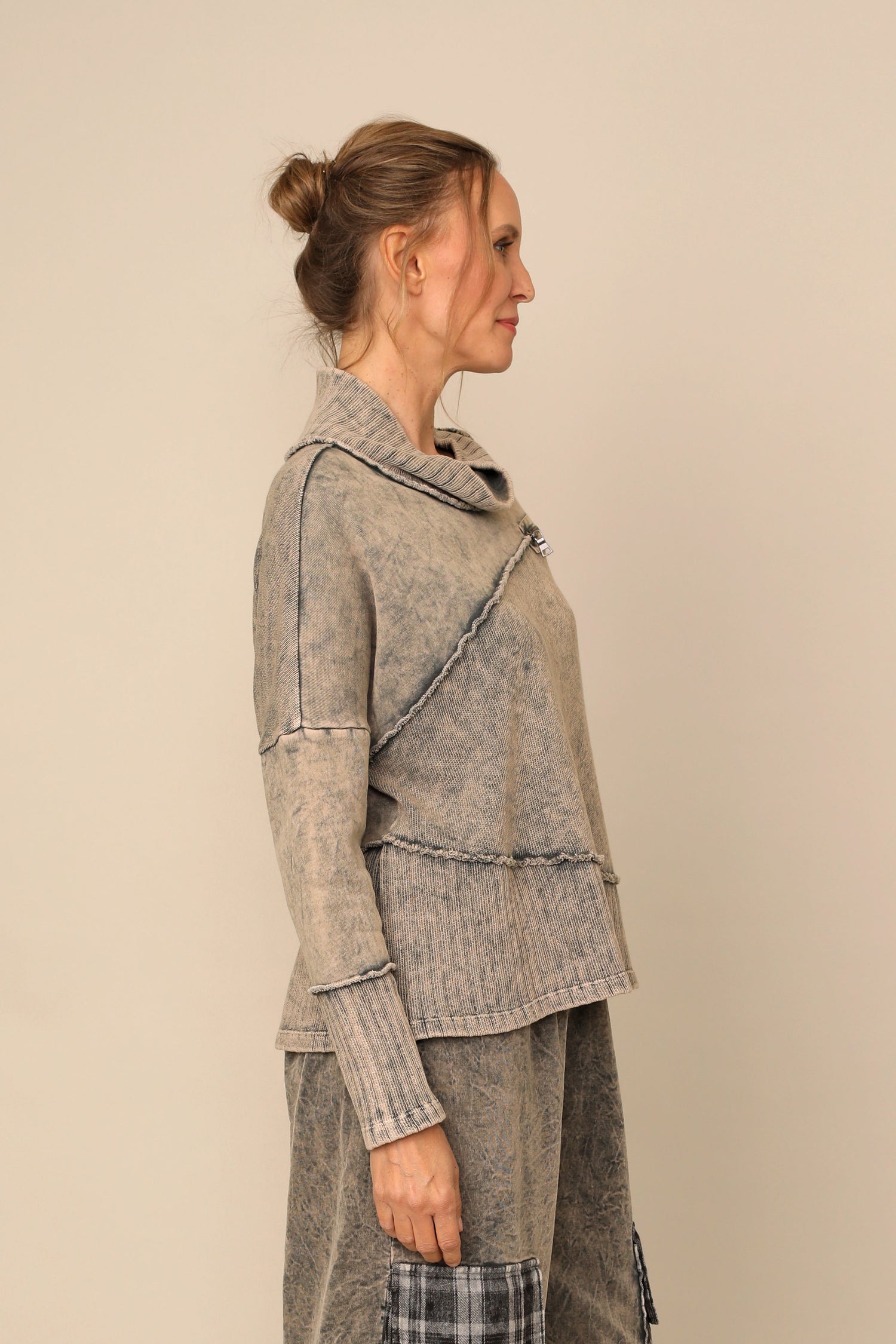 The drop shoulder long-sleeved Elenore Top redefines chic comfort. Featuring a mock neckline with asymmetrical seams that run across the contrasting body and a zipper trim in a straight hemmed boxy silhouette. Alongside its vintage wash, it truly brings out a unique character to any outfit.