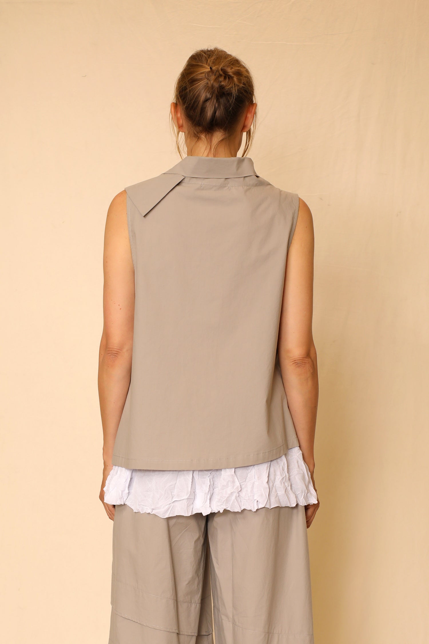 Beautify and create an immediate jaw dropping look when you layer with our sleeveless cotton woven Esme Vest. Designed with a strikingly stunning asymmetric layering neckline that’s fashioned with a misaligned straight hem, front patch pocket, and detailed 3D metal buttons for enclosure. Paired over our crinkled Liz tank for a top tier styled look.