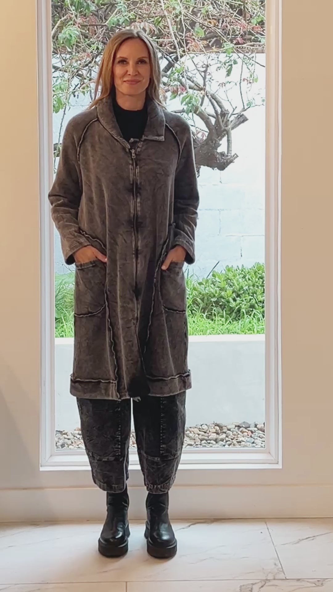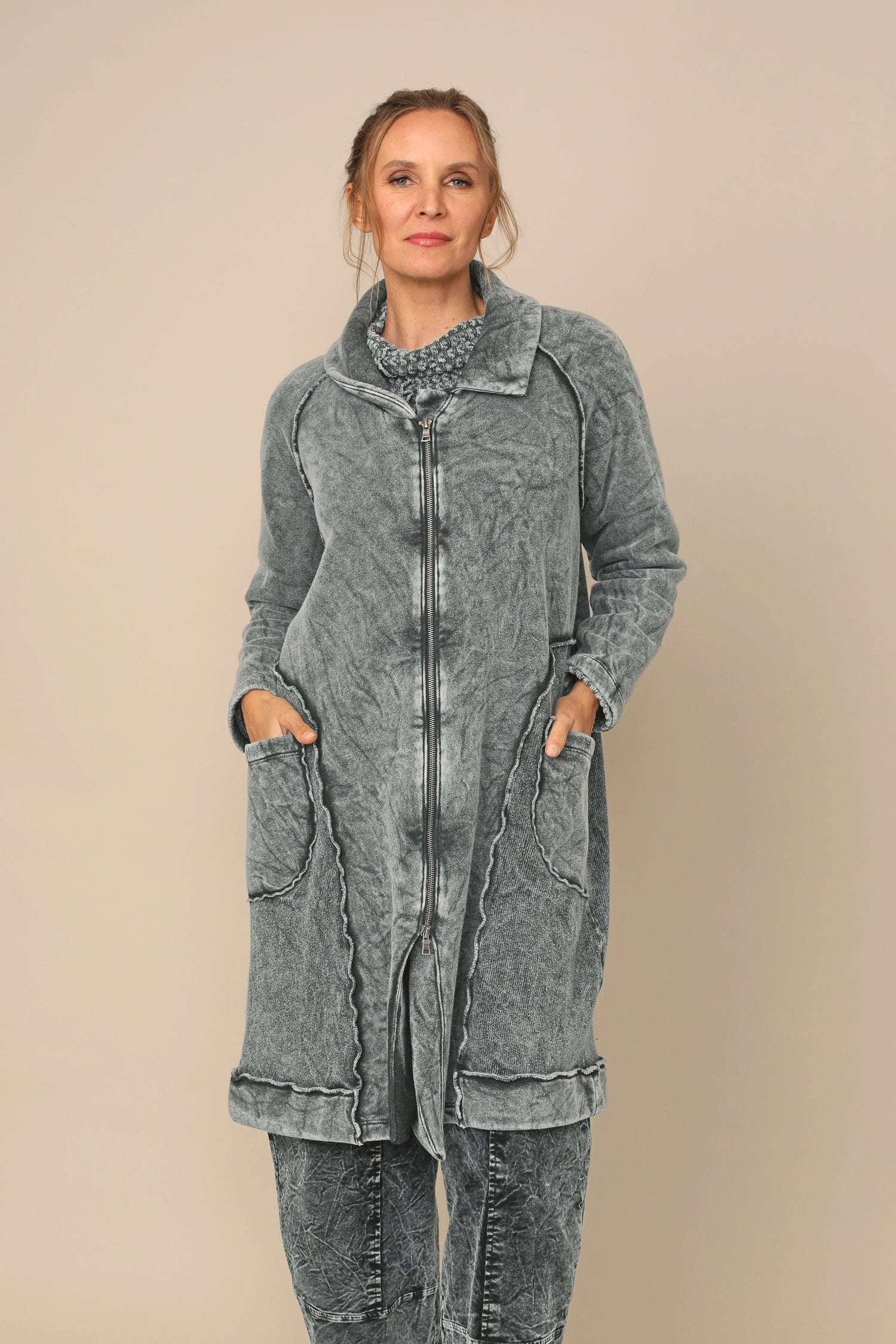The zip up Givanna Jacket is the epitome of quality and luxury. Featuring dolman long sleeves and an asymmetrical collar, fitted in a straight hemmed boxy silhouette with patch pockets alongside sweater knit contrast. Finished with a vintage washed touch.