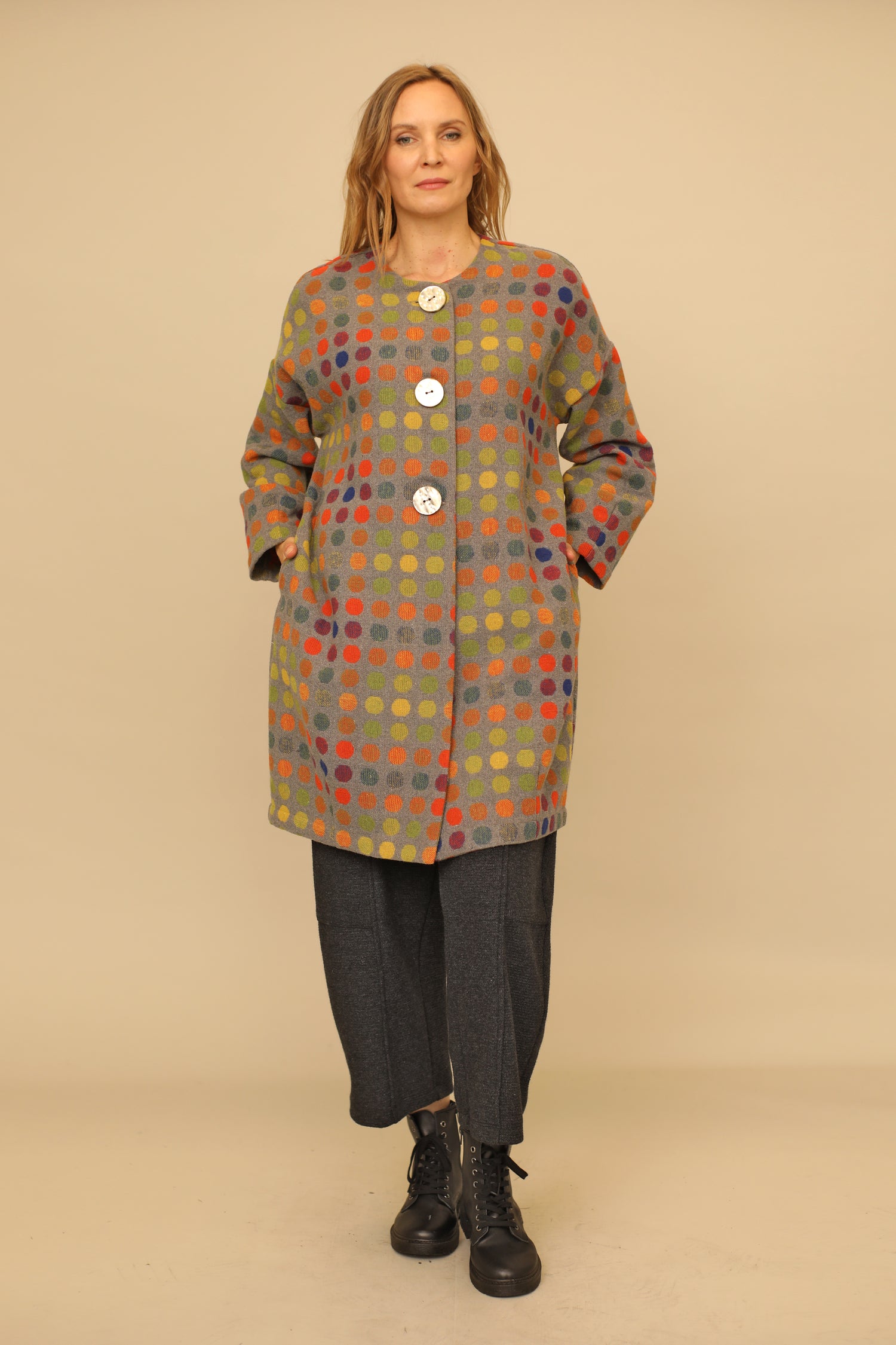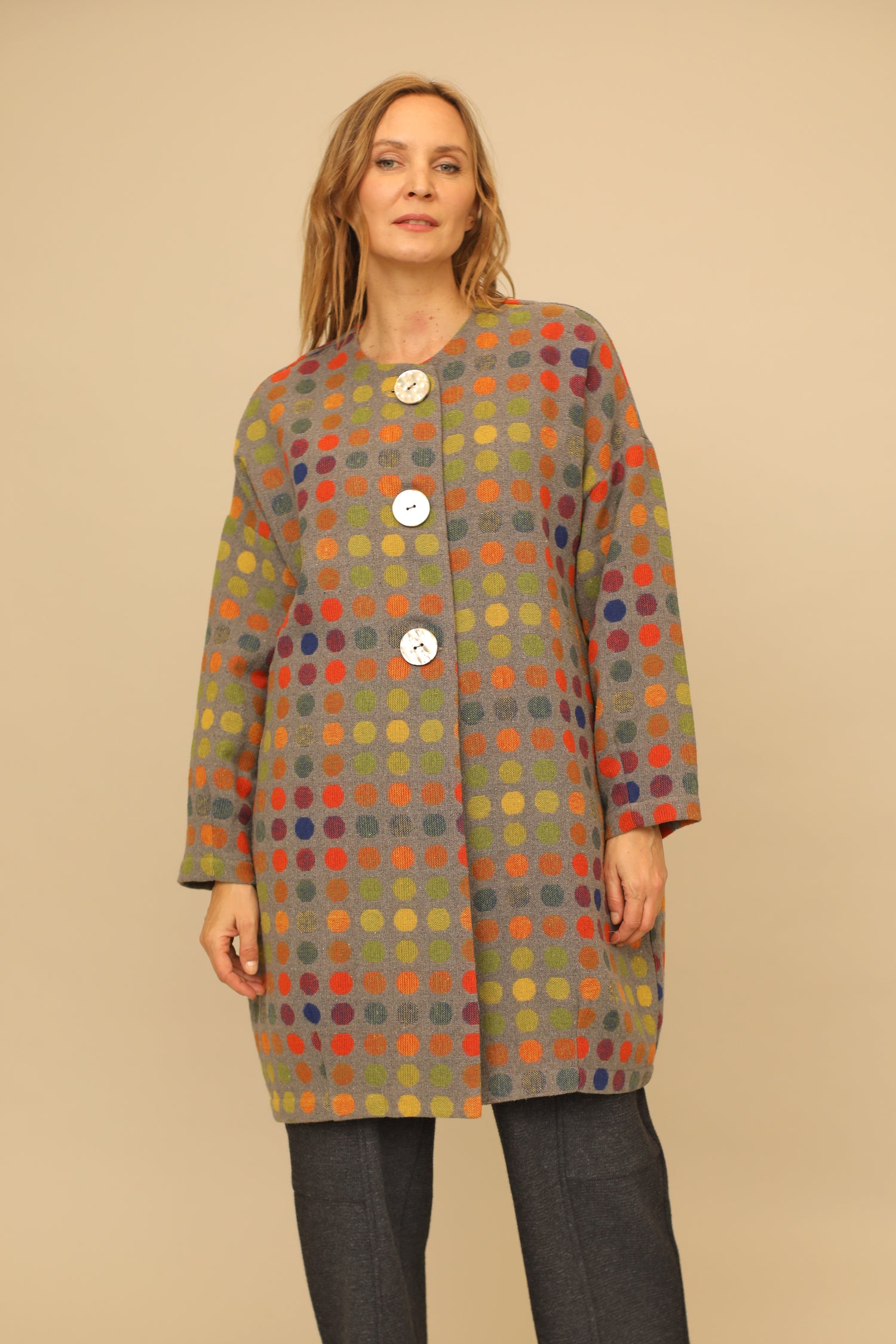 Designed for versatility and crafted with warmth, the long sleeve Gwyneth Coat provides excellent insulation while a rounded neckline with drop shoulder sleeves and inseam pockets upholds an opulent level of comfort. The straight hemmed rounded silhouette ties with the details of its marble buttons for a gorgeous look, regardless of which mulitcolor dot woven colorway you desire.