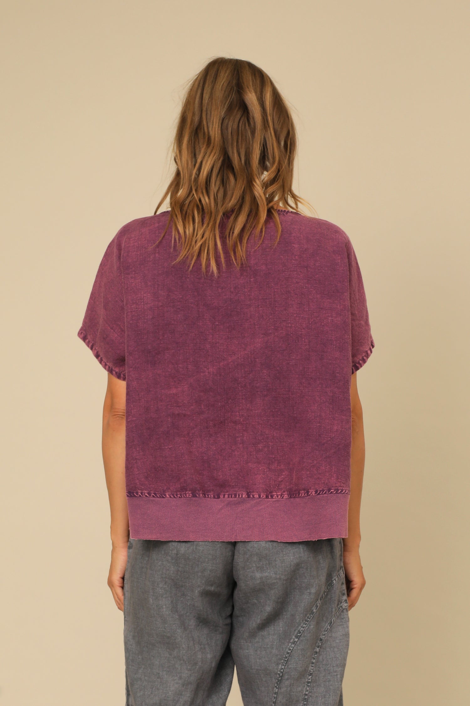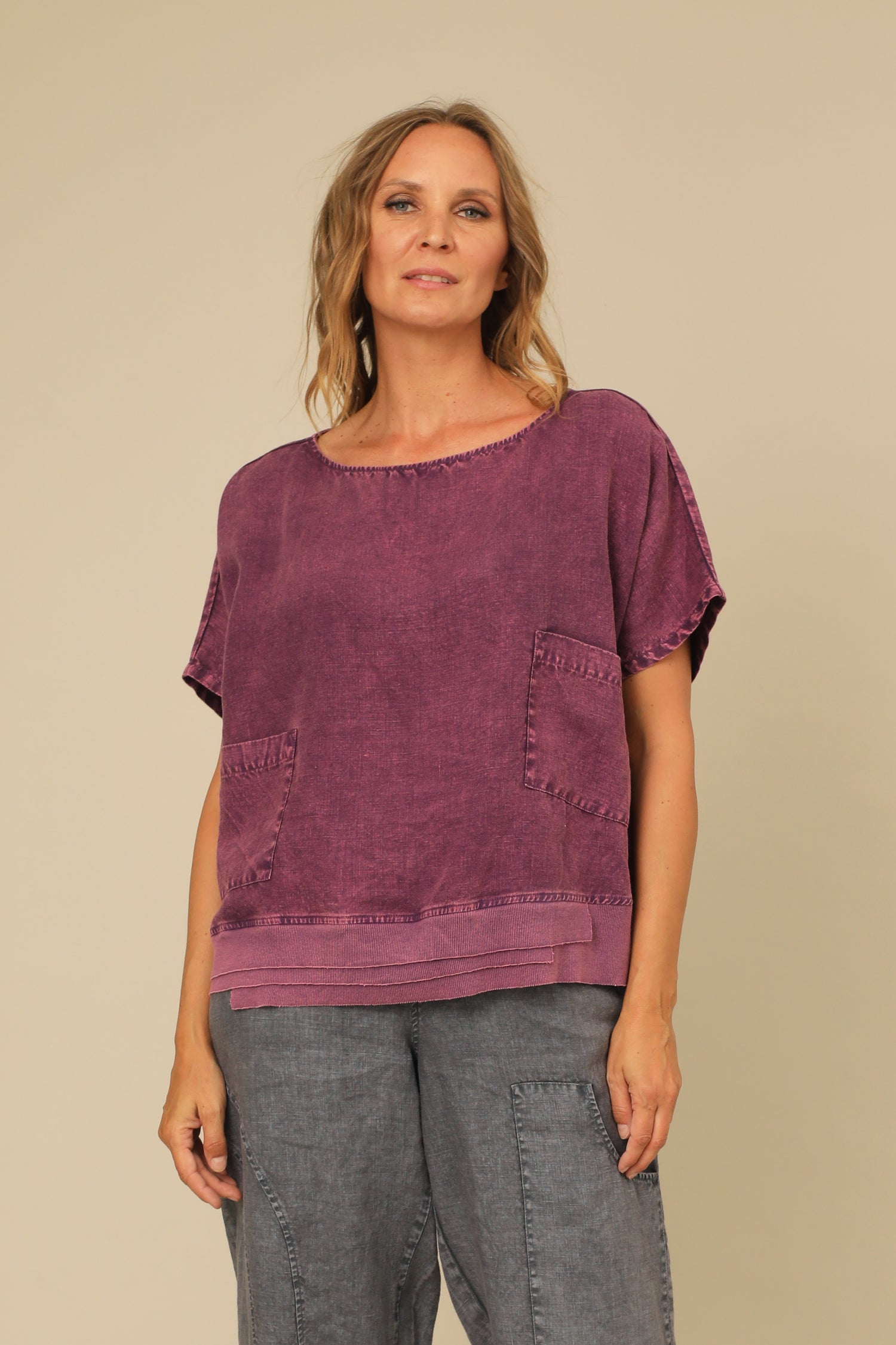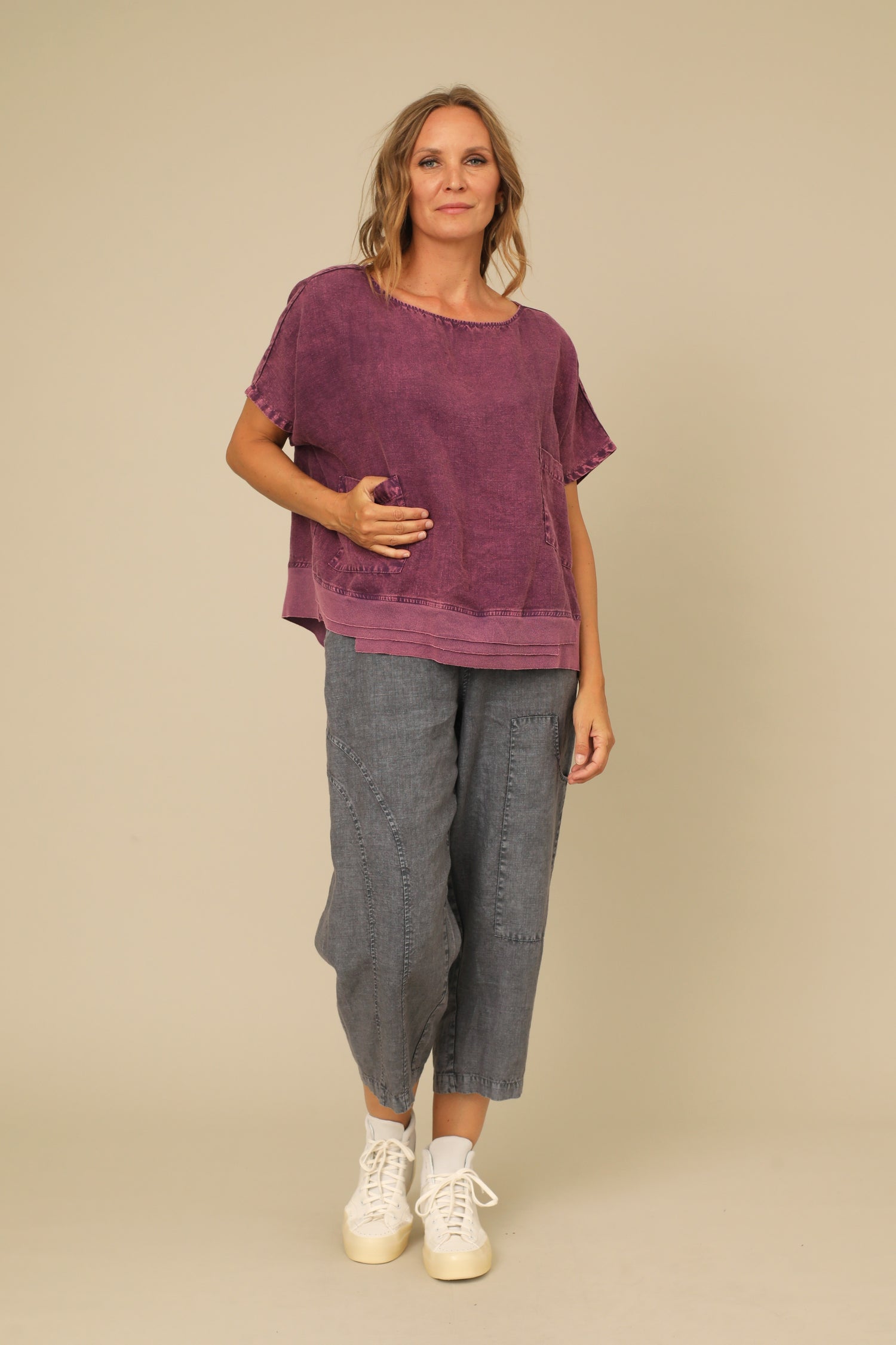The Harlee Top is crafted in breathable linen with dolman short sleeves. The boxy silhouette anchored by a contrasting ribbed asymmetrical hem, rounded at the neckline and detailed with patch pockets. A classy vintage washed piece that offers a refreshing take for effortless dressing.