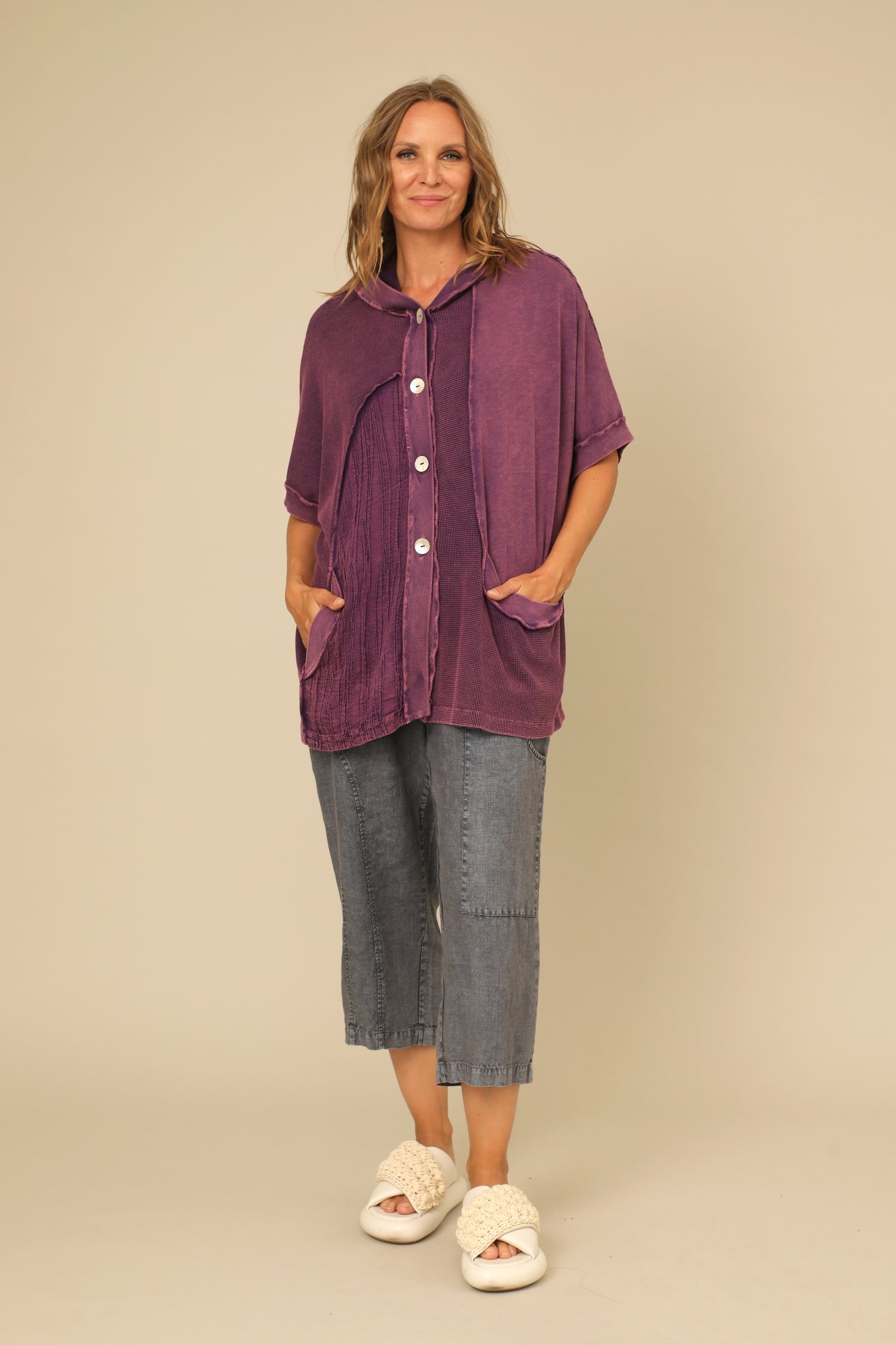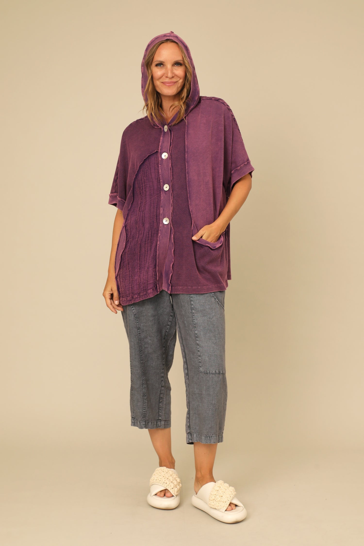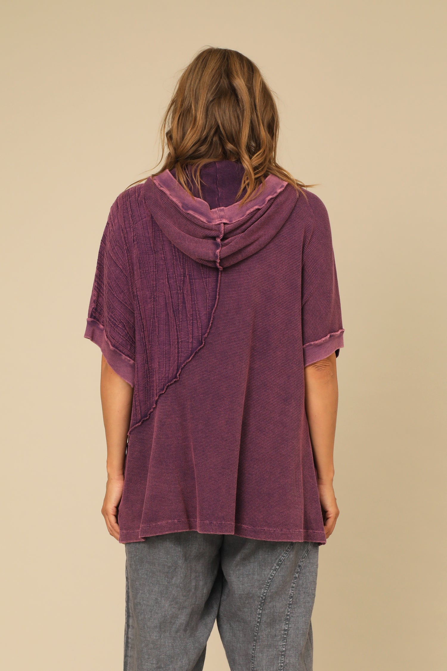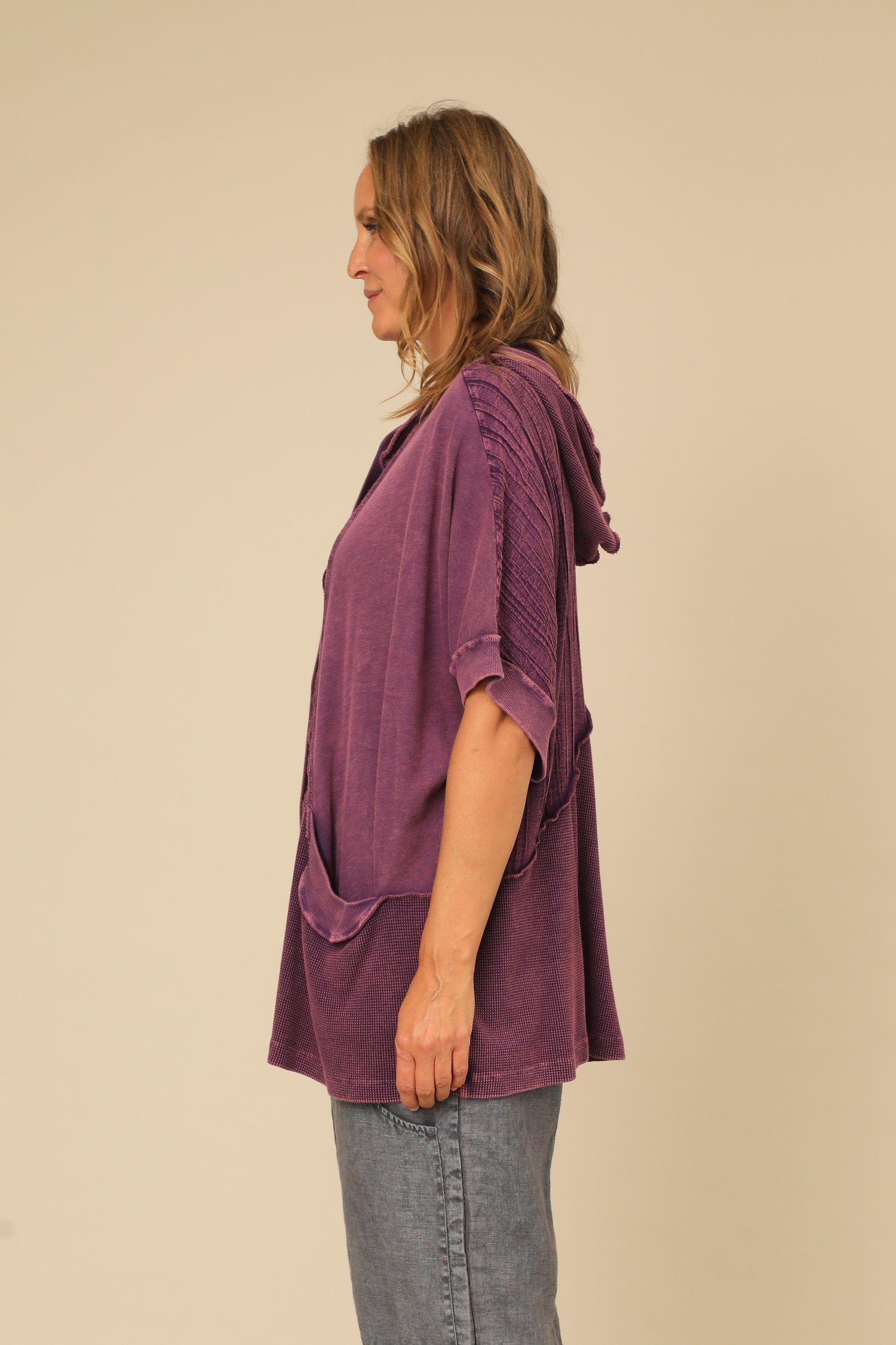 The Helaine Jacket is a tactile modern layering piece with a vintage washed touch. Featuring a hooded button front with dolman sleeves banded in rib fabric, its jersey and wavy knit contrast create a creative dimension and finished with inseam pockets in a straight hemmed boxy silhouette.