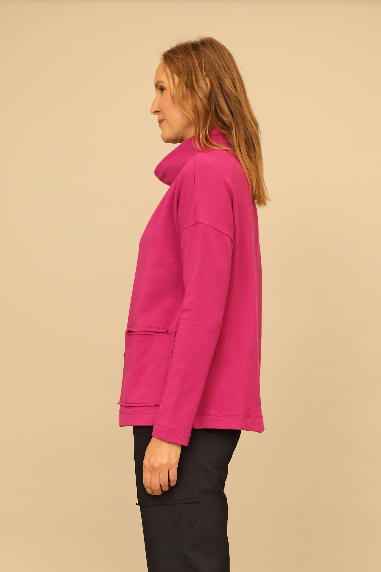 Fall in love with the Henrietta Top in vibrant Fuchsia. This long sleeve top features a turtle neckline, drop shoulder sleeves, and crossing raw edge seam details over a front patch pocket. The A-line silhouette with a straight hem offers a relaxed yet stylish look, perfect for the season.