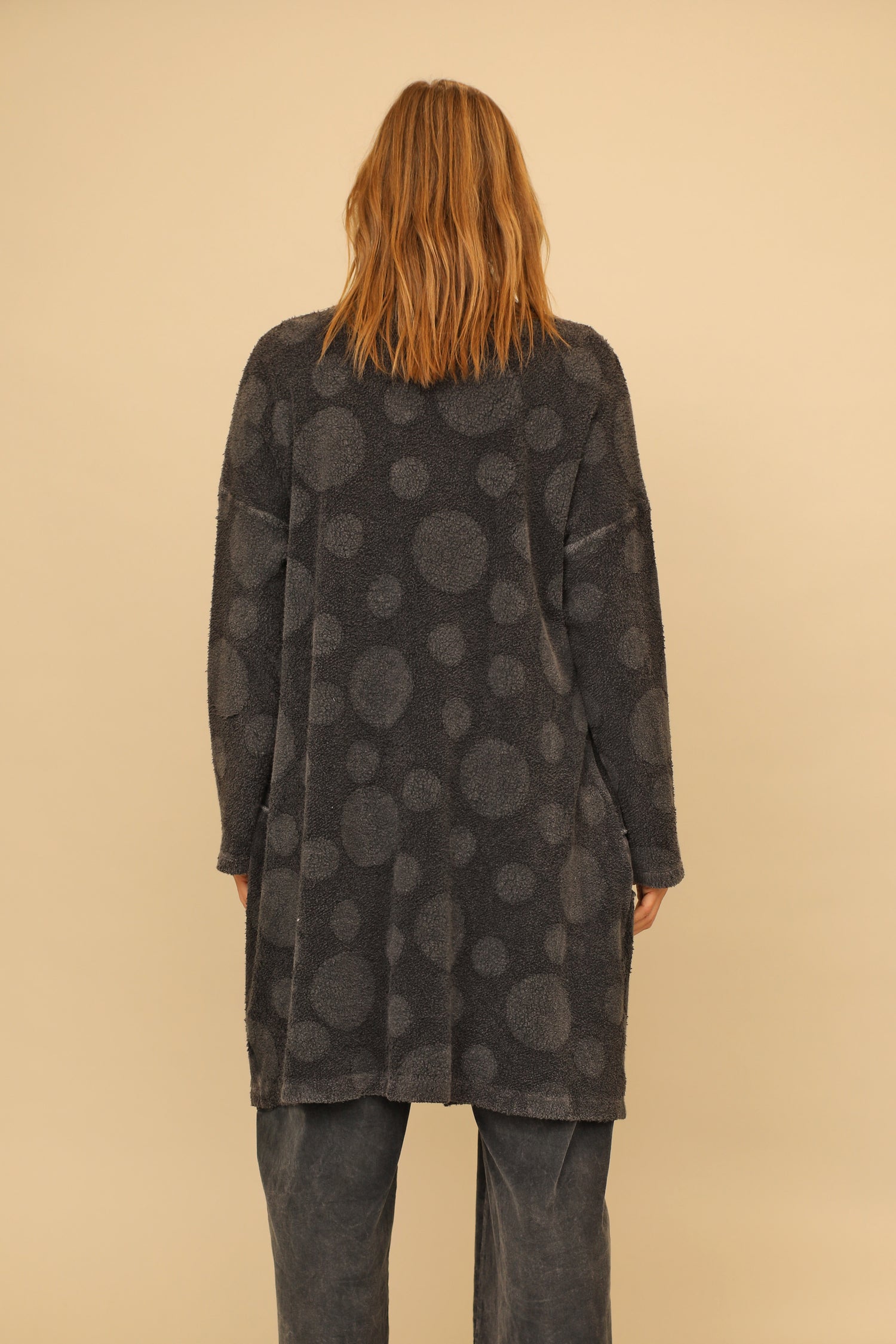 Layer vintage charm with the long-sleeved open Janice Cardi for a one-of-a-kind piece due to our unique dying process. This garment carries a chic appearance with its contrasting mixed fabric design cut with raw edge seams and inseam pockets alongside drop shoulder sleeves to create the quintessential garment for layering no matter how you pair.