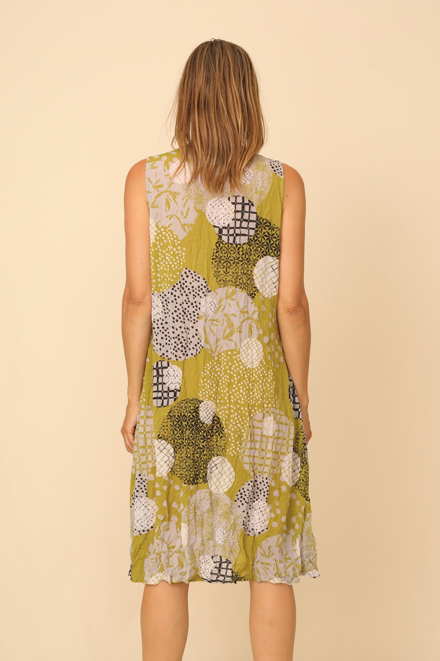 The Jennika Dress is a sleeveless crinkle mesh garment designed with a rounded neckline, asymmetrical functional drawstring hem, A-line silhouette, and inseam pockets. Adored for easy styling and effortless elevated look, this garment highlights its unique textured design while maintaining quality comfort and breathability.