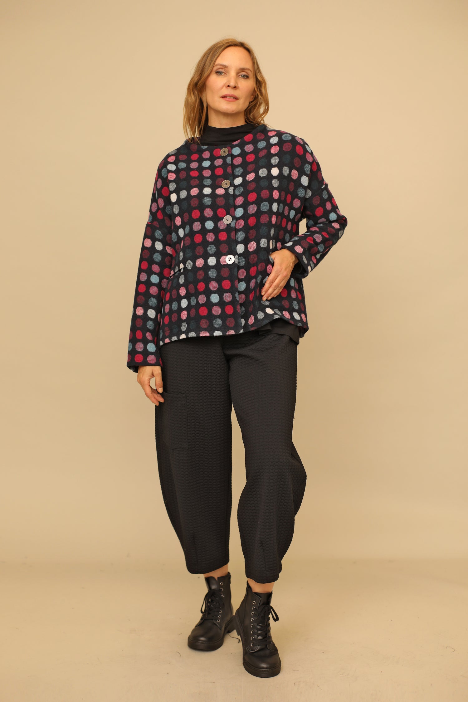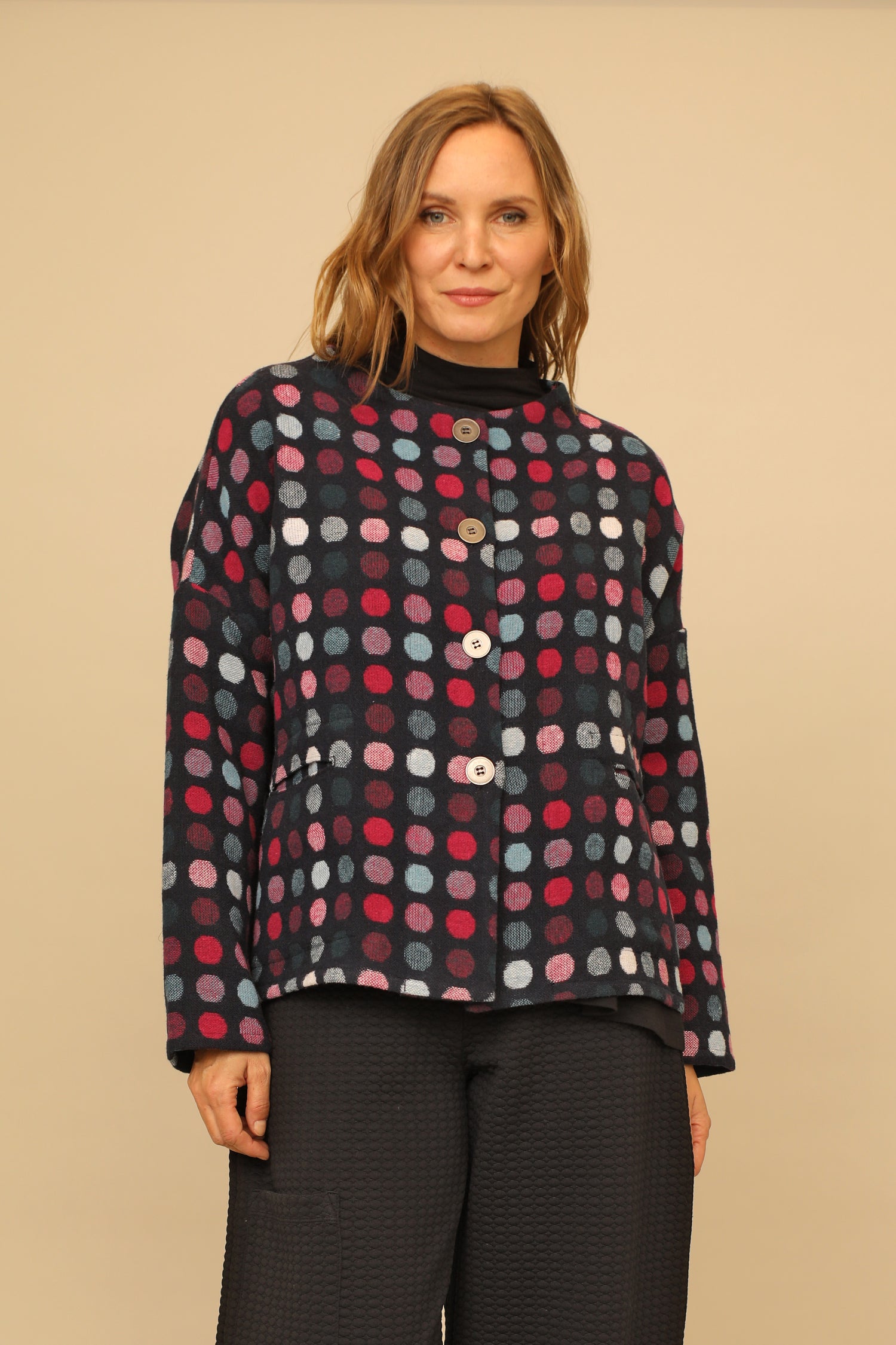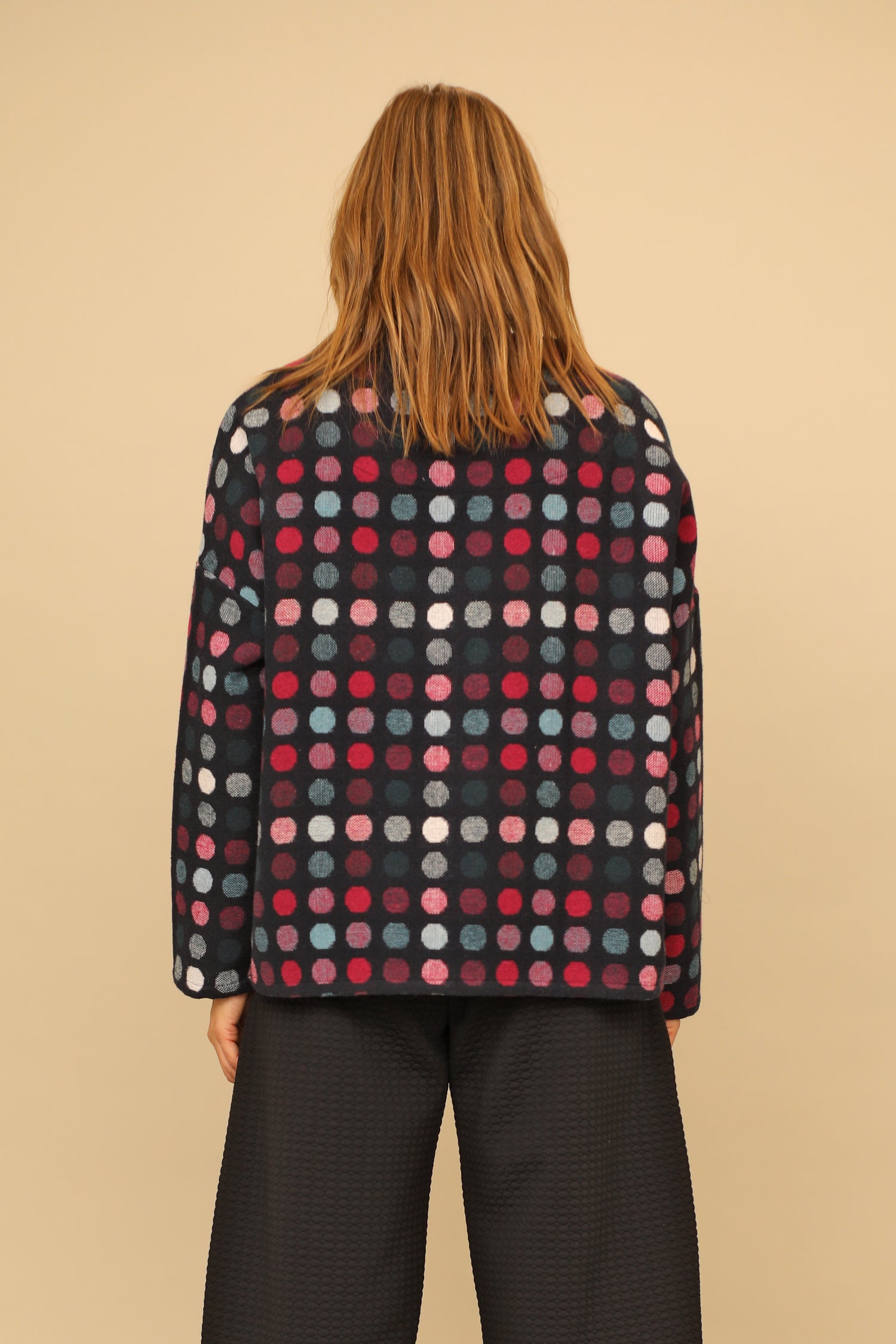 From work to weekend, the button up long sleeved Jovelle Jacket redefines your look no matter where you strut. The multicolor dot woven pattern creates visual interest, while the weltless patch pockets and high rounded neckline with a straight hemmed drop shoulder sleeved boxy silhouette adds stylish modern flair. Layer up with our Henrietta Top for a top tier colorful look to keep warm and in style.