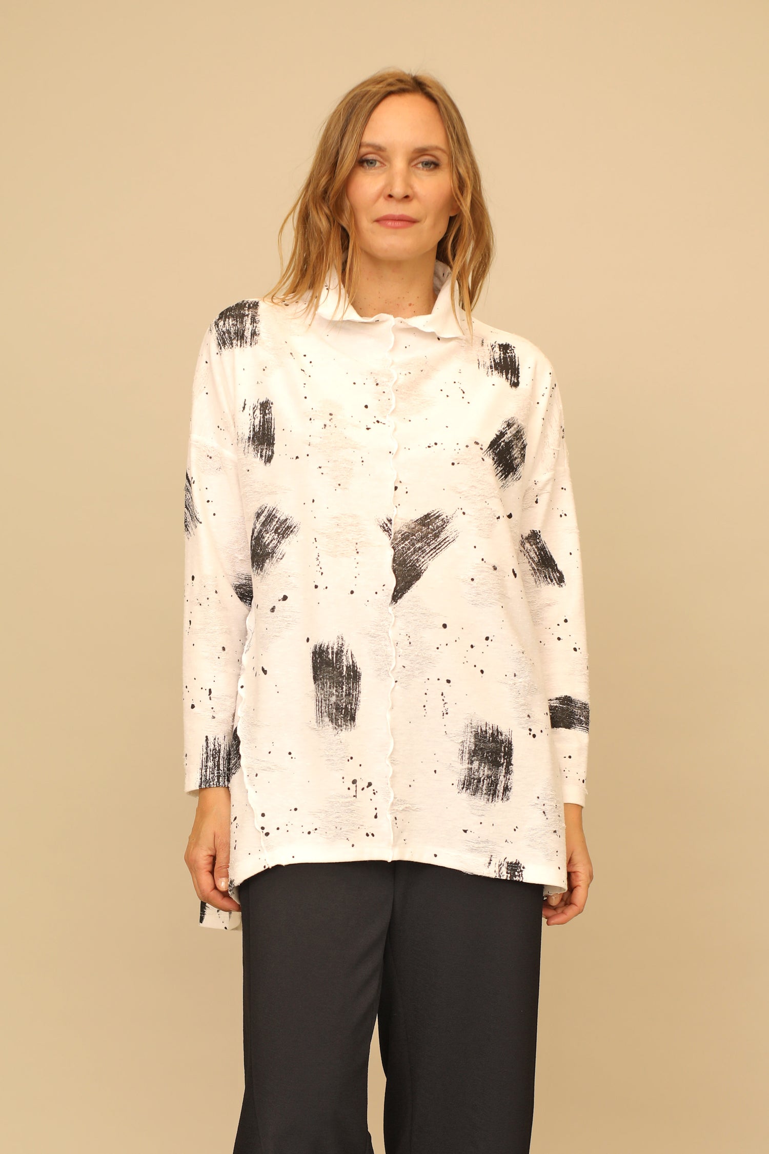 Sleek meets modern artistry with our Juliette Tunic. Cut in our gorgeous distressed print fabric, with a collared neckline alongside exposed seam detailing dancing down the A-line silhouette body. The drop shoulder long sleeves and high low hem perfects this garment to pair with any bottom, especially Tess Pant.