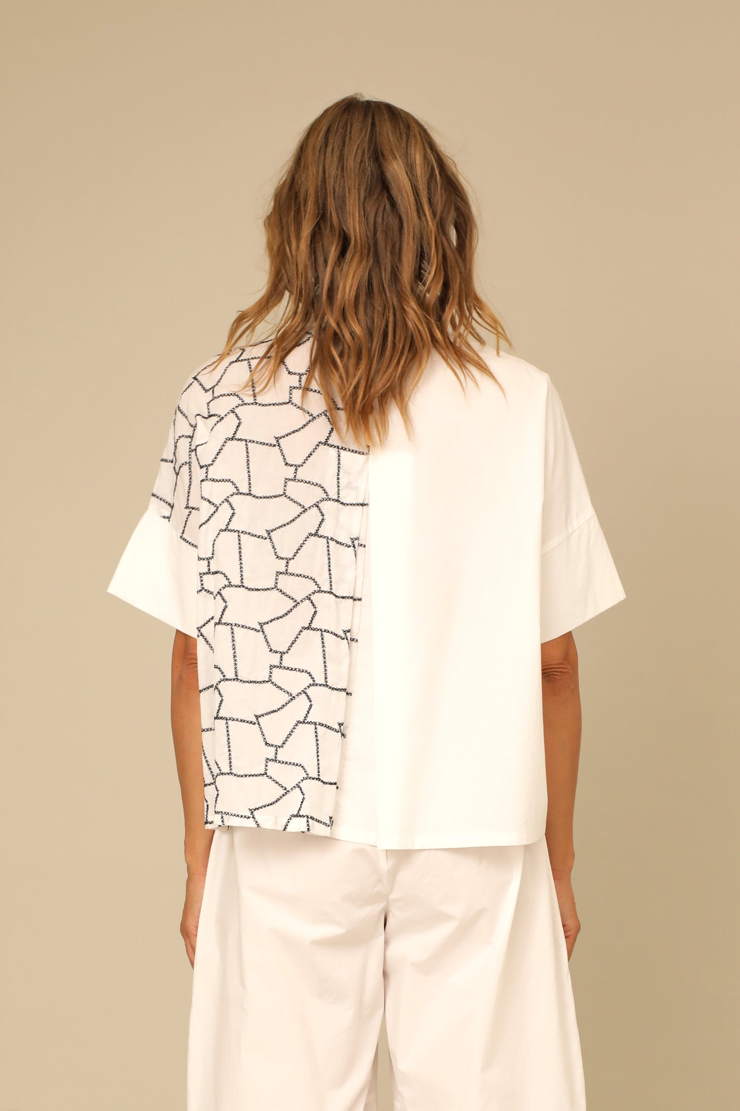 The Kaleen Shirt is an audacious blend of structure with playful details. With a button up collar, drop shoulder sleeves, and an asymmetrical hem, this garment gorgeously flows with any pair of bottoms. Artfully constructed with solid cotton woven fabric and embroidered contrast, it’s a statement piece explored with rich details and texture.