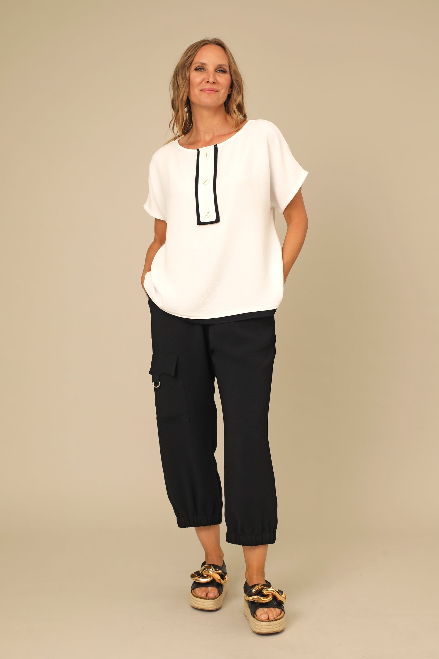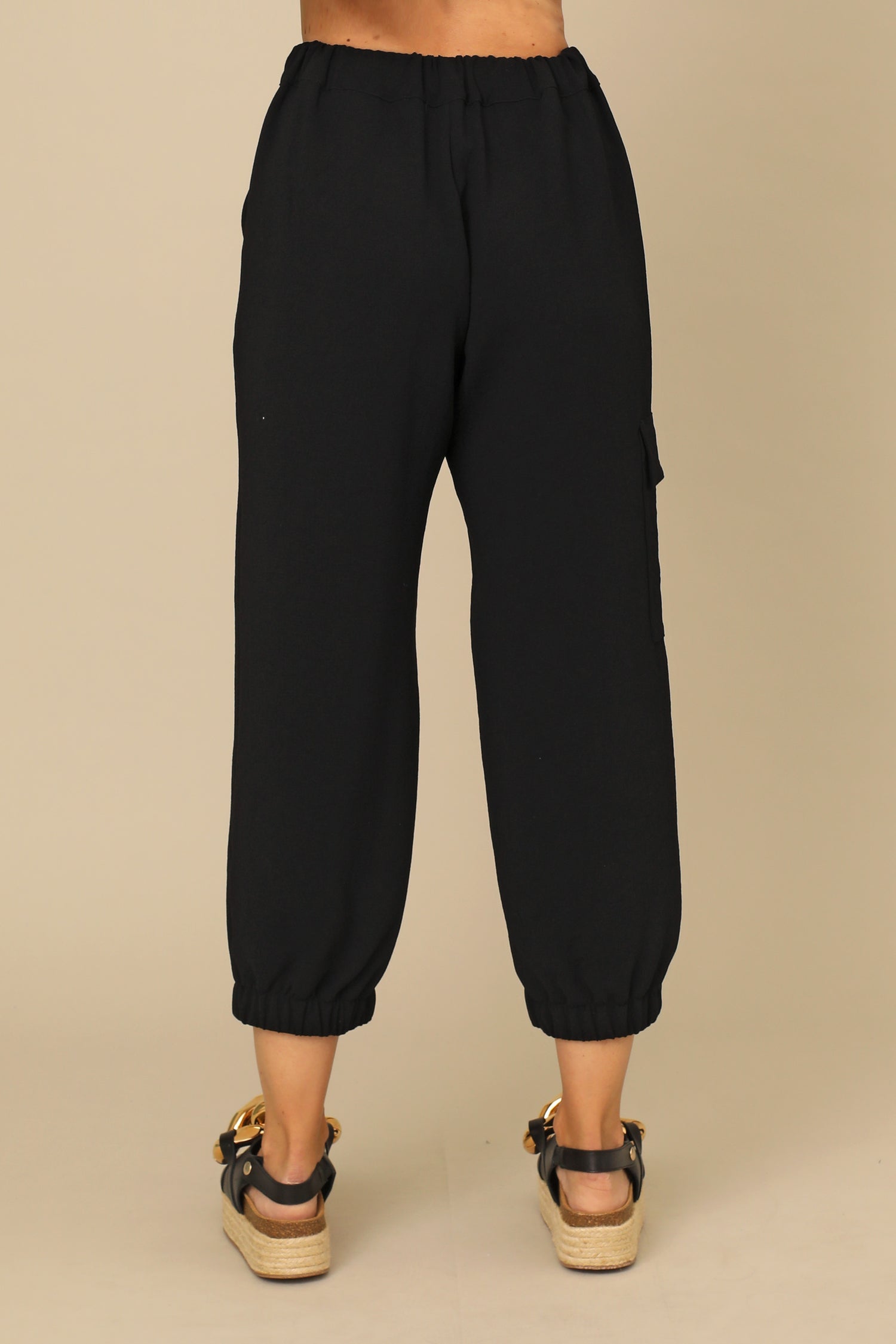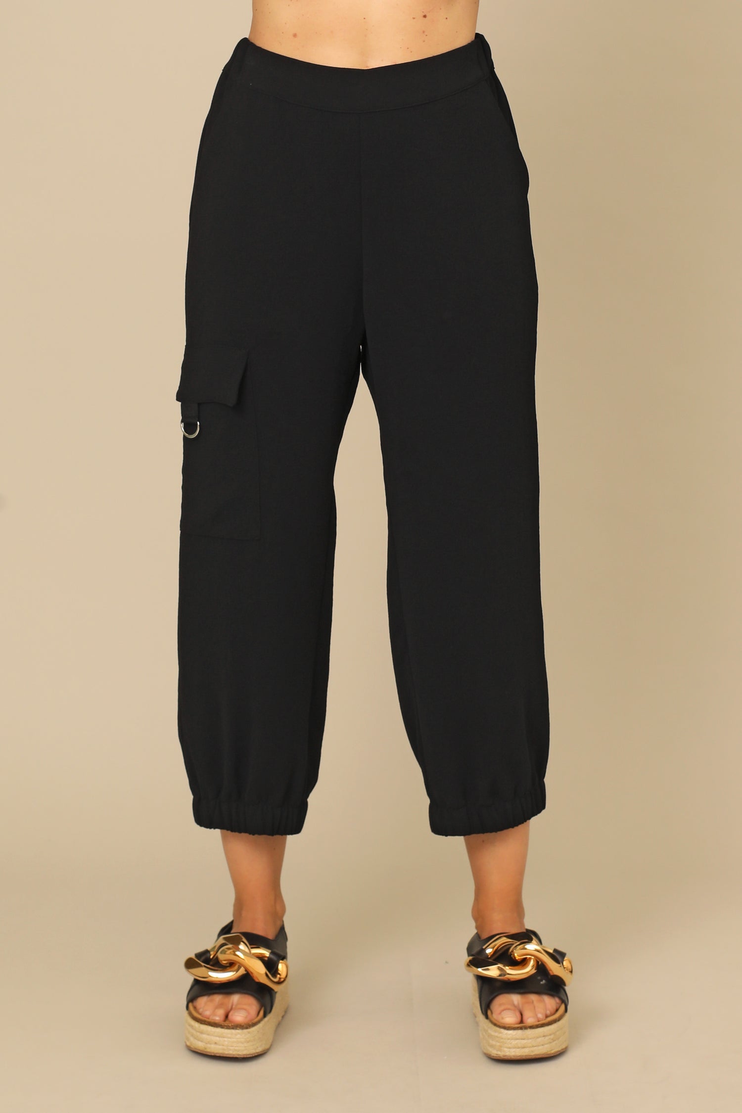 Elevate your essentials with the Kenna Pant. Designed with an elastic waistband for all-day comfort, this piece features clean side pockets and a flapped patch pocket accented with a D-ring trim detail with elastic cuffs. Bringing together the form of artistic edge and function to strut everywhere you travel.