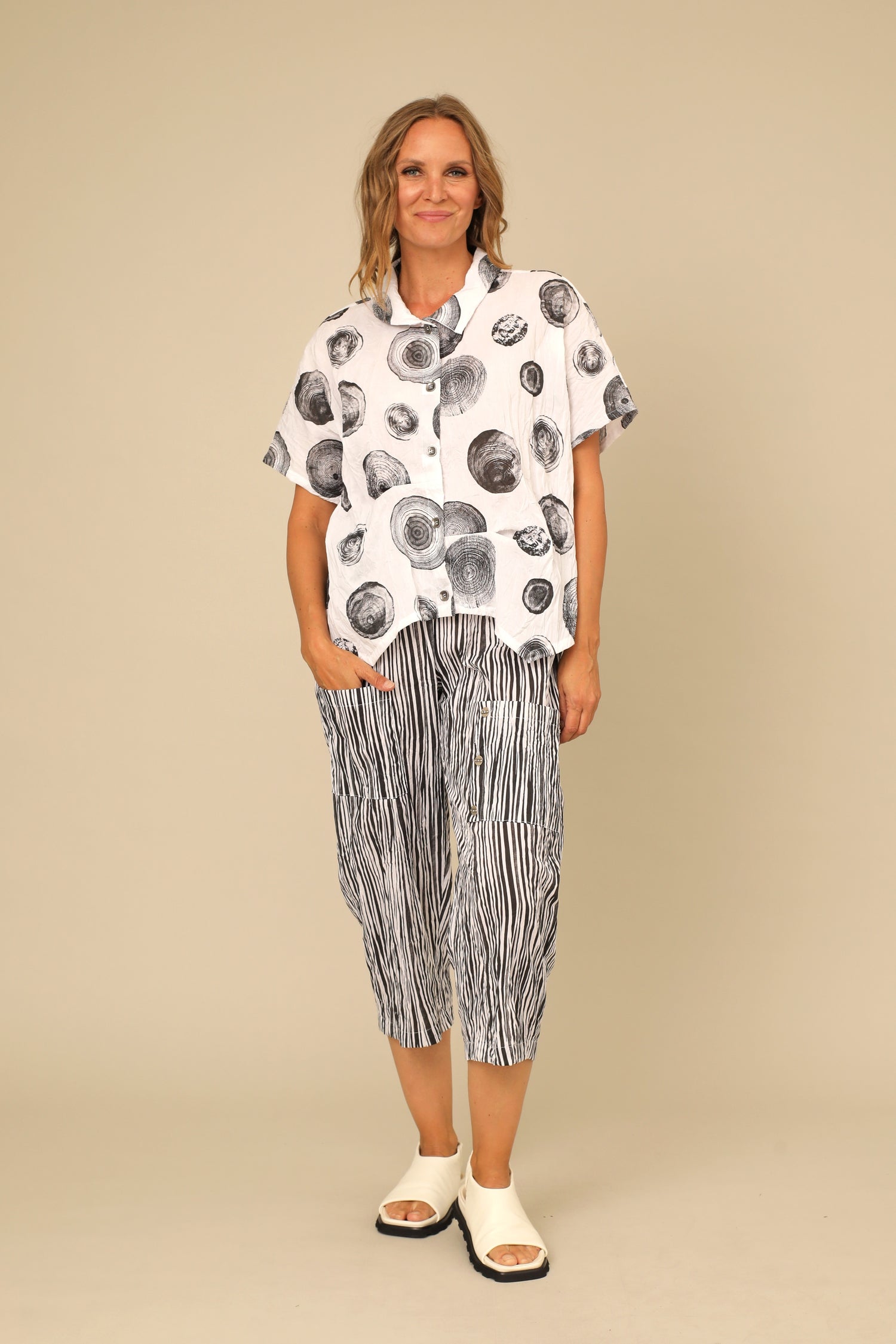 Easy to pull on, hard to forget. The Laurell Pant is curated with a comfy elastic waistband and standout asymmetrical patch pockets with button trimming for added flair, while our naturally textured creased cotton fabric presents breathability and lightweight travel. Make way for those stylish getaways or a stroll around the block