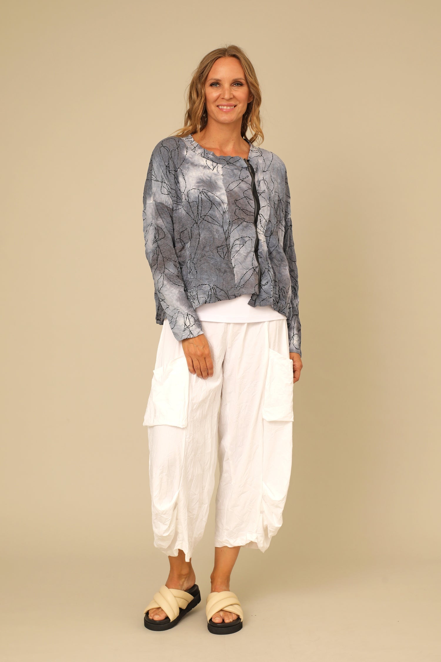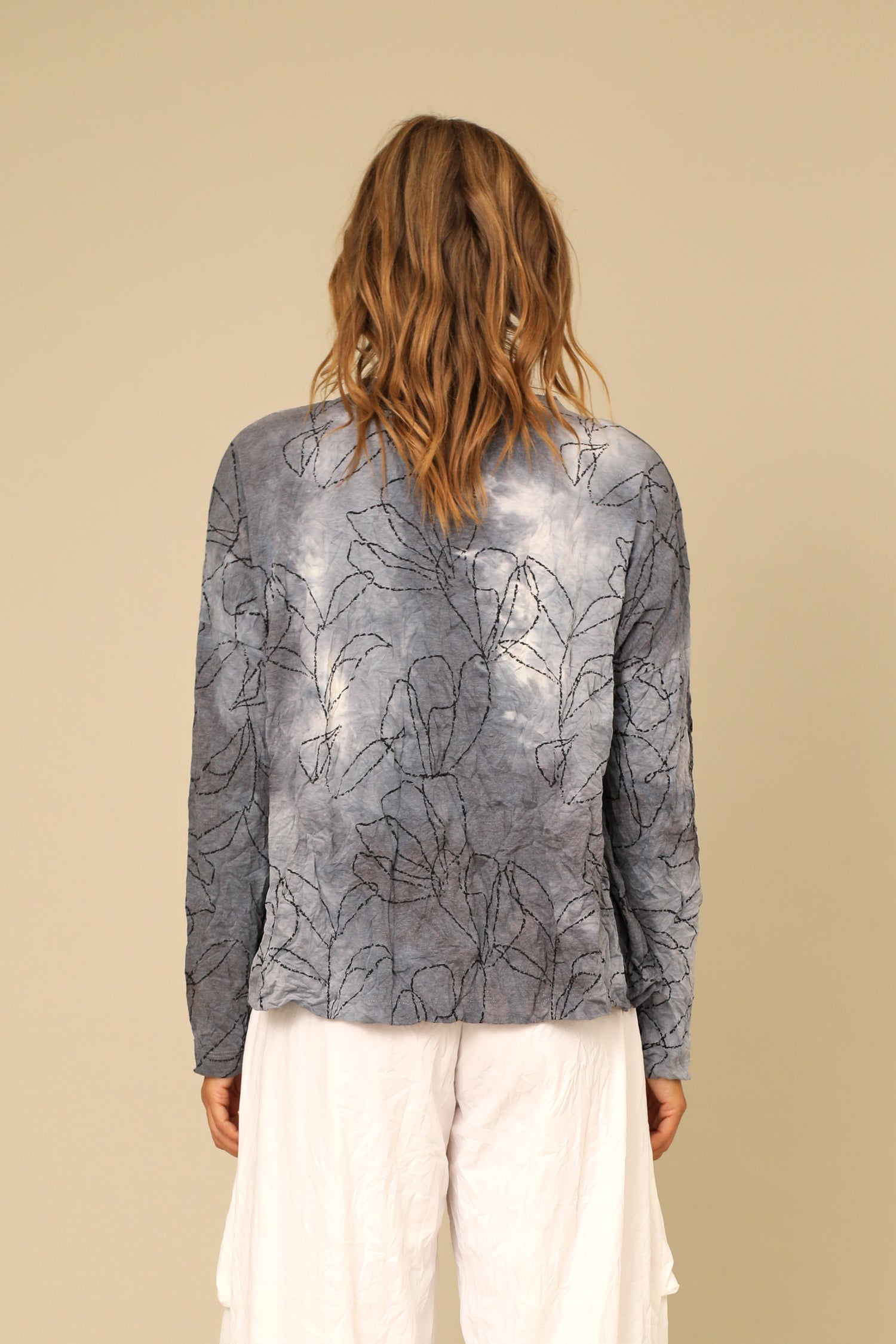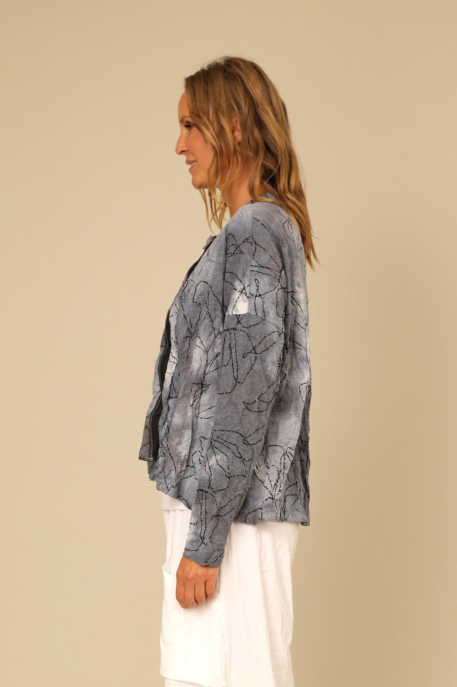 Feel liberated in the zip up Liberty Jacket. A true one of kind statement piece that will have you reaching for it constantly all season long. A rounded neckline and zipper accompanied with raw edge details that reach down to the asyemmtrical hem. Designed in a boxy fit and drop shoulder long sleeves with a front patch pocket in our crinkled handpaint jersey fabric.