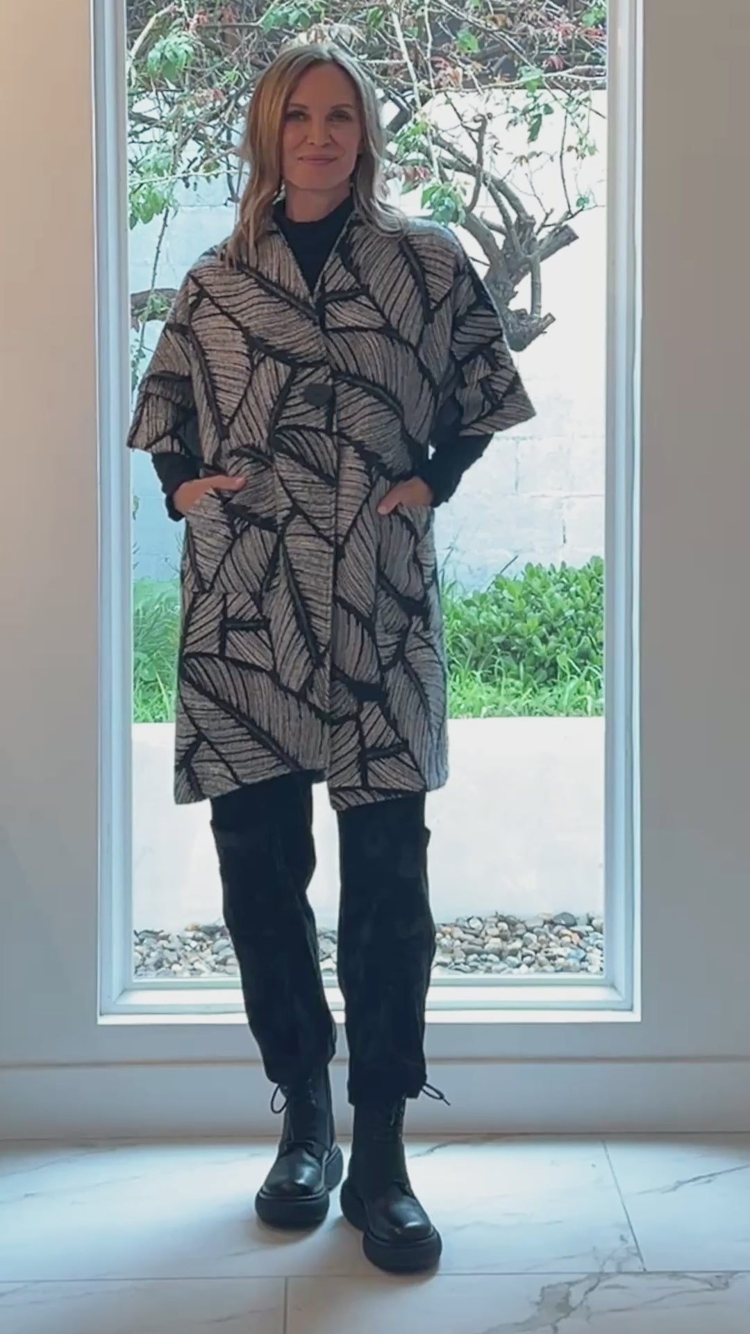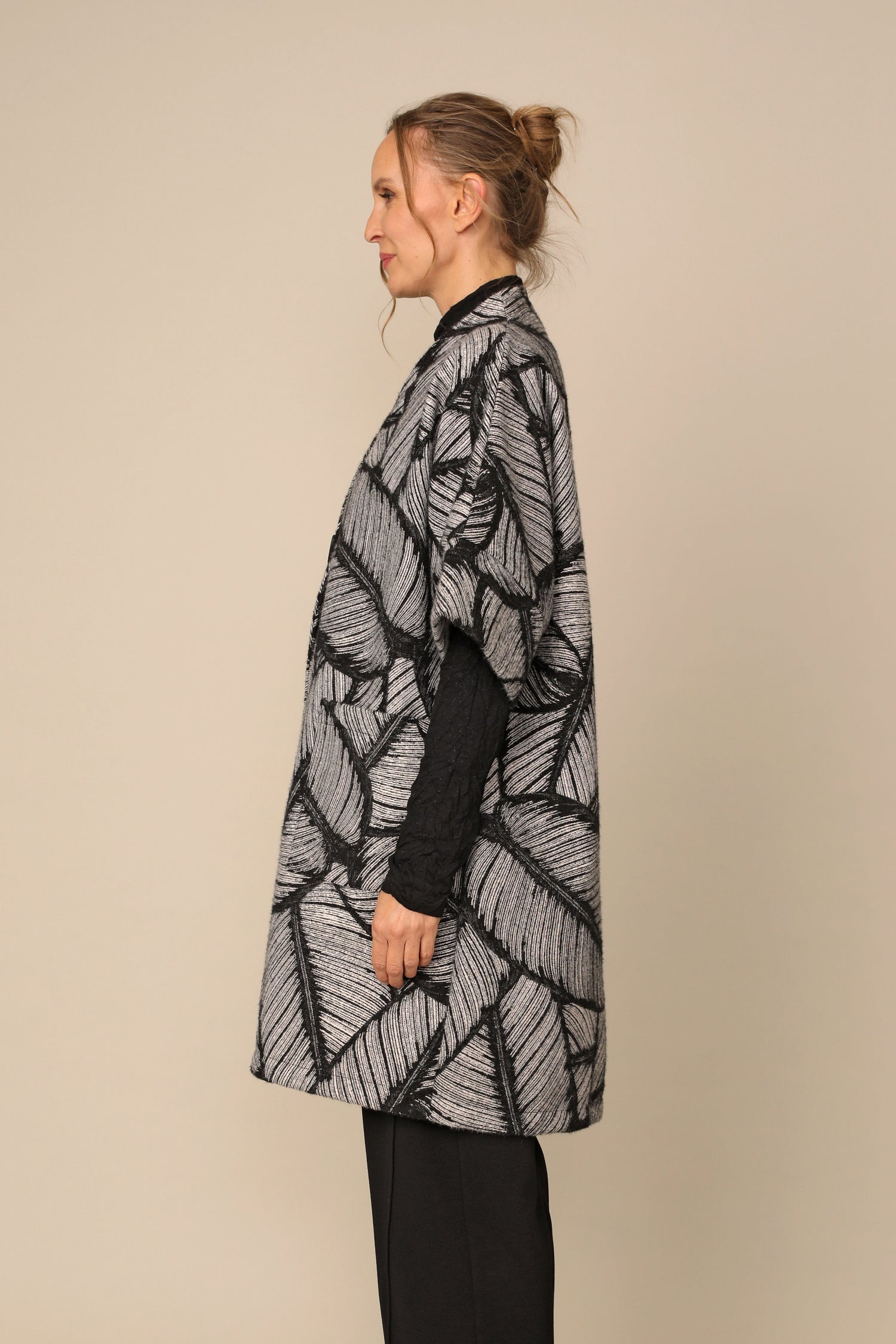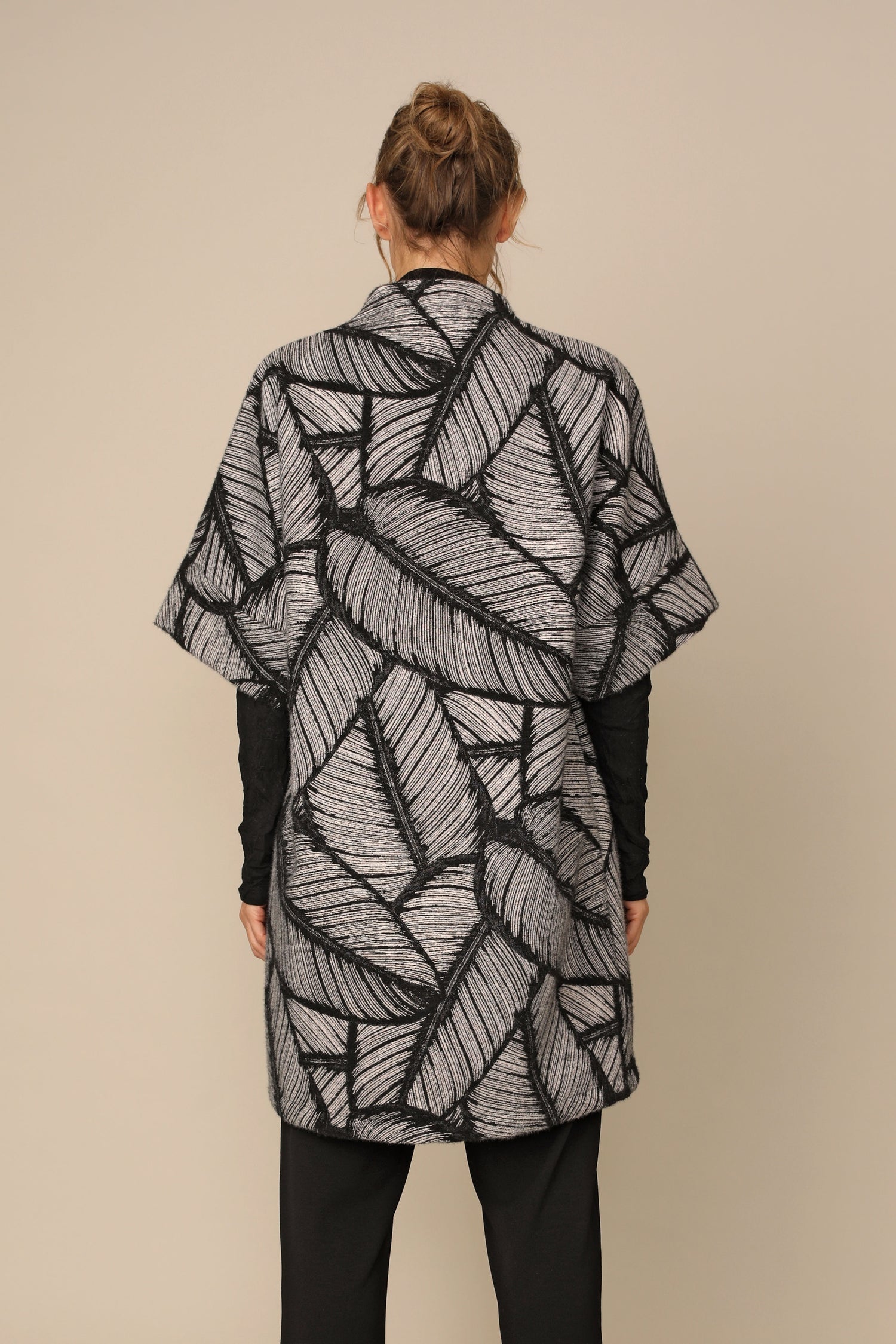 Layer beautifully with the button Lily Jacket. Designed with a V-neckline and dolman banded sleeves in an asymmetrically hemmed A-line silhouette in Feathered Jacquard fabric, it brings a gorgeous appeal to wear over any top while standing out with its unique front patch pockets.