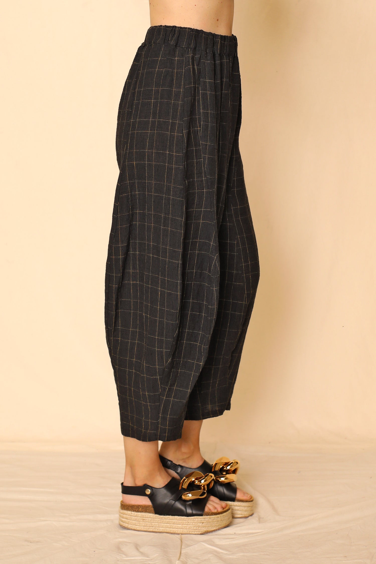 Step into effortless style and comfort with the Lindsay Pant, an essential piece for any versatile wardrobe. Crafted from a soft, breathable linen fabric, these pants feature a distinctive texture that adds a unique touch to your look. The elastic waistband provides a comfortable and secure fit, while the tapered leg design offers a modern, flattering lantern silhouette. Perfect for pairing with a casual top or a more refined blouse, these pants are ideal for both relaxed days and more polished occasions.