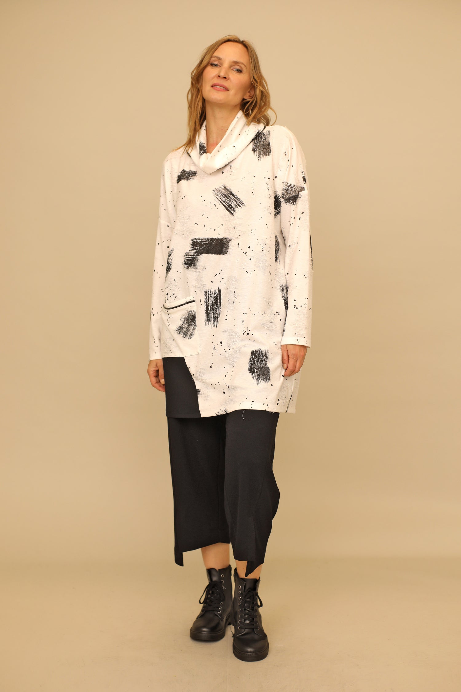 A standout piece for the bold and audacious. The Lisa Dress is cut in our distressed printed fabric with a side black stretch crepe contrast down to the A-lined fitted straight hem. Designed with zipper trims at the turtle neckline and front patch pocket, alongside the drop shoulder long sleeves for extra comfort and extravagant appeal.