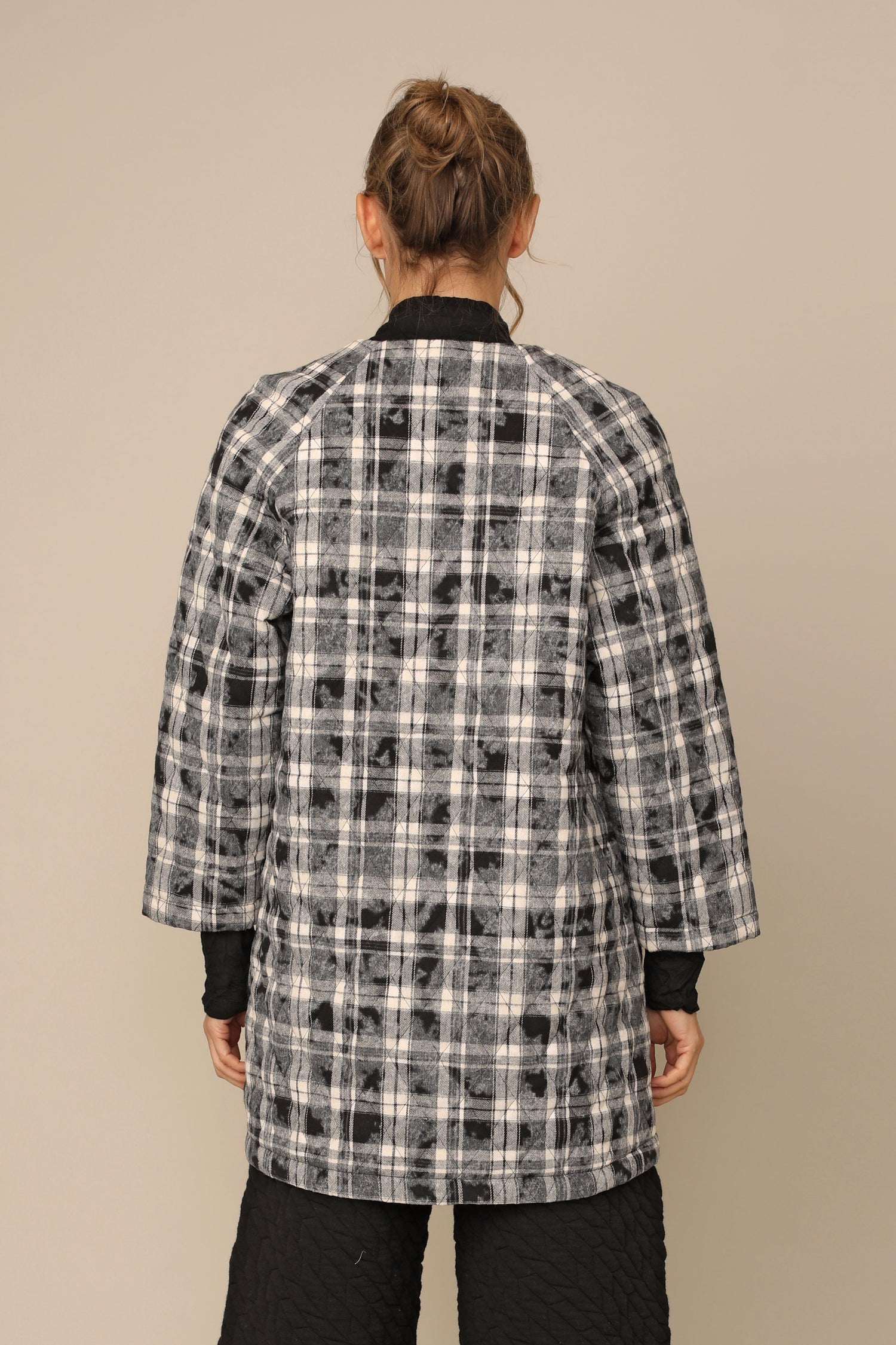 The quilted plaid Livie Jacket features dolman sleeves, a rounded neckline, and front patch pockets. With a straight boxy silhouette, this piece features warmth and versatility while providing a polished chic finish fitted for all occasions this season.