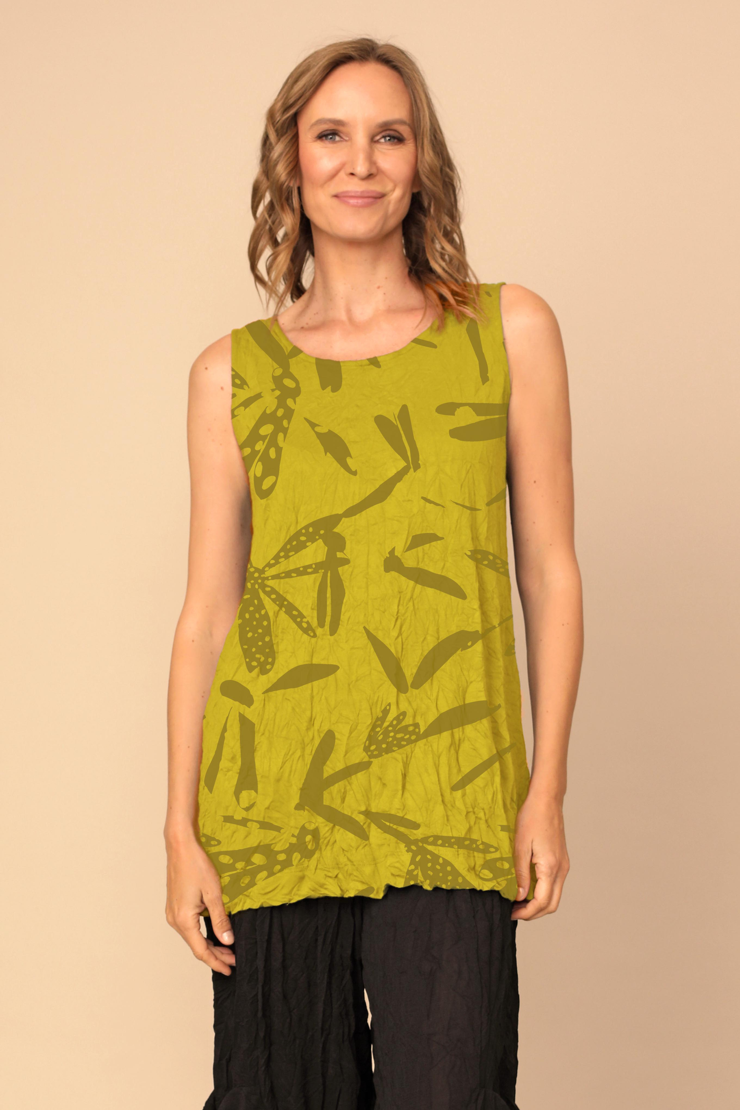 Whether as is on those sunny days or under favorite jacket, our classic sleeveless Liz Tank can be loved once more in a unique print and new seasonal colors. Featuring a rounded neckline and straight hemmed boxy fit, made in our recycled crinkle jersey fabric to easily throw on and travel with wherever you please.