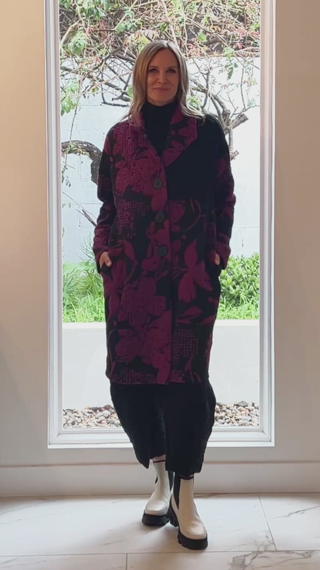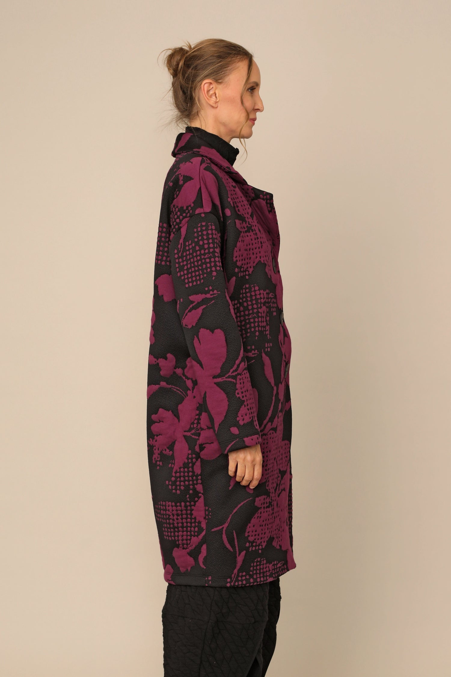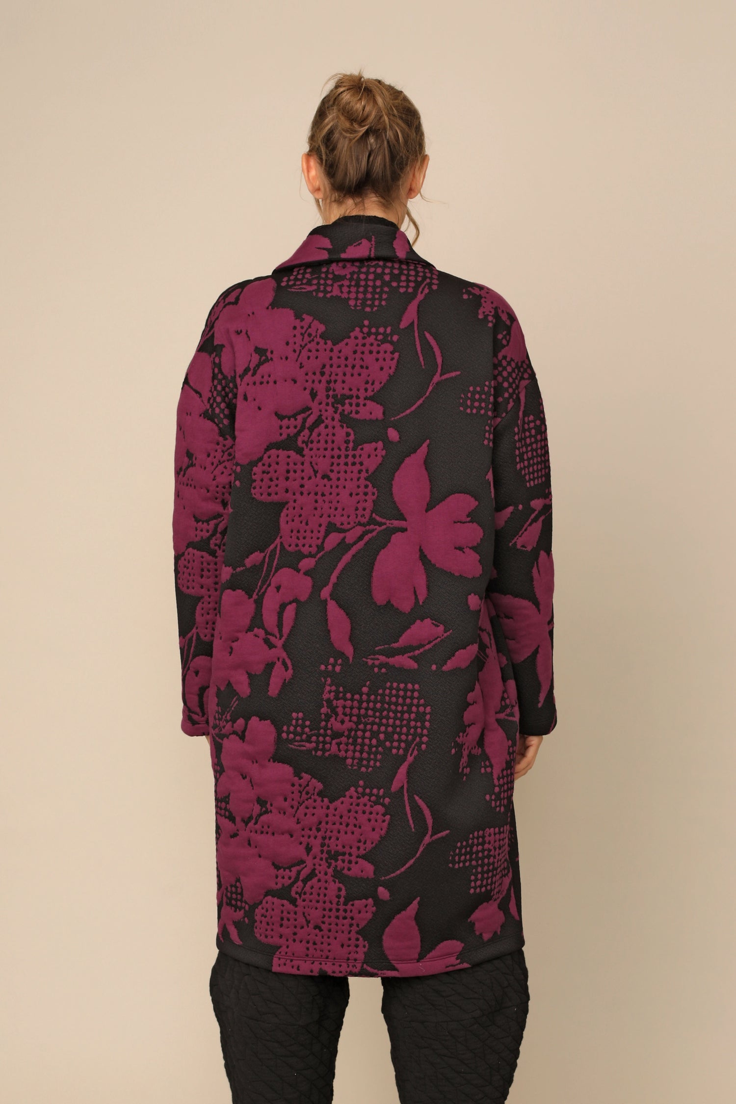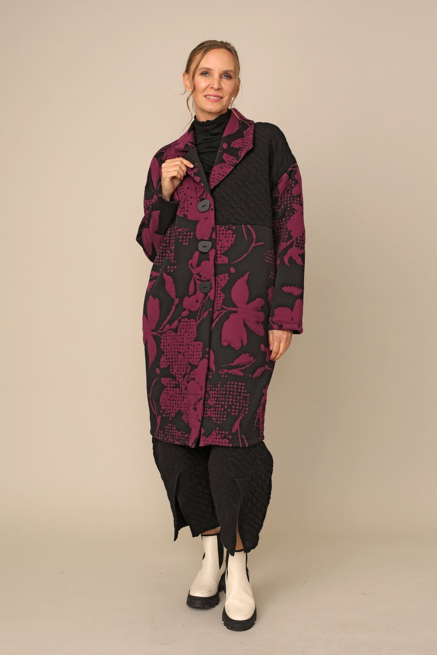 The button up Marcy Jacket features a gorgeous color block design with black contrast and printed jacquard fabric. The drop shoulder long sleeves and straight hemmed boxy silhouette bring a level of familiar class and chic appeal that creates a luxury statement.