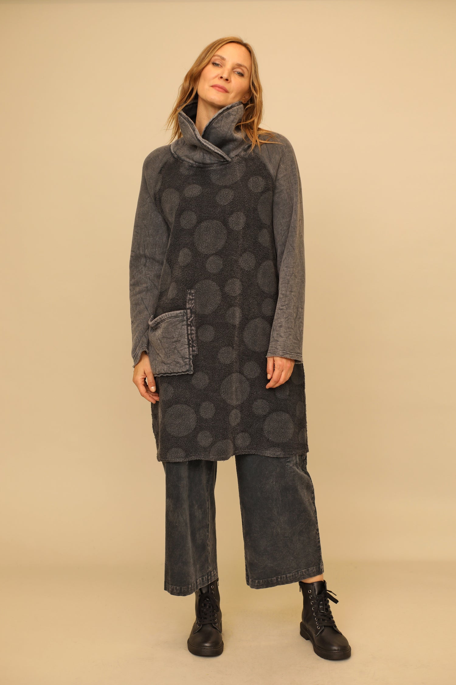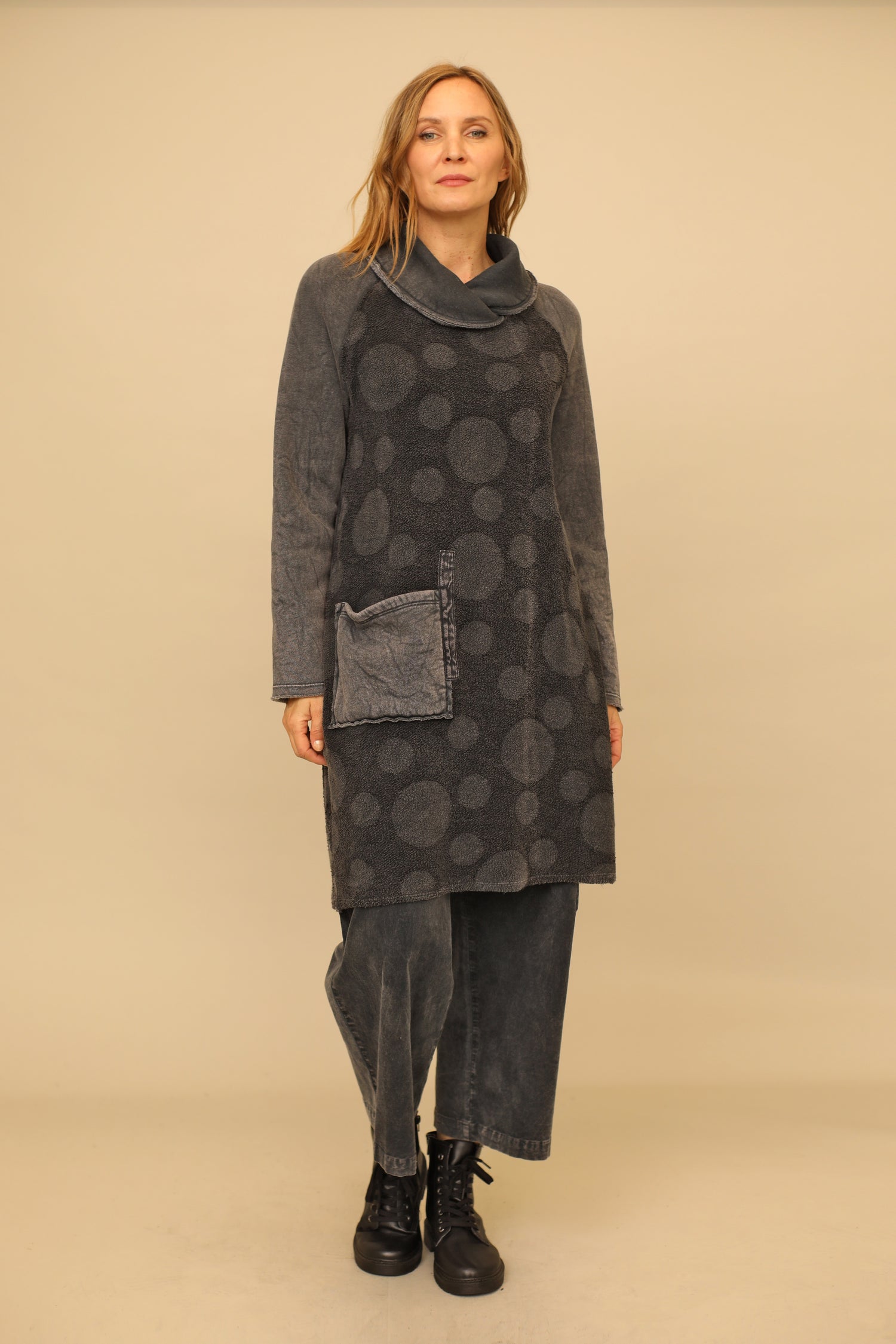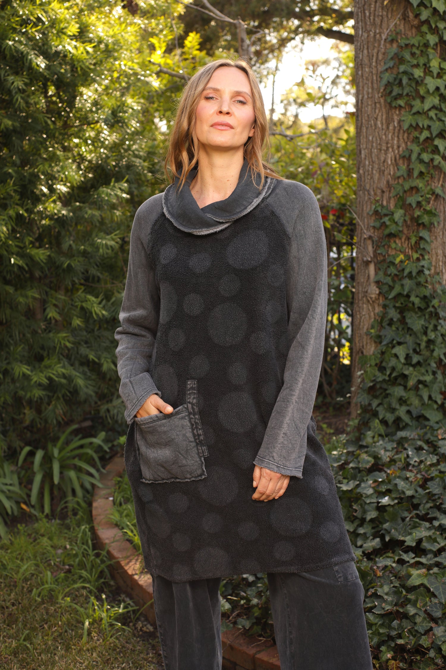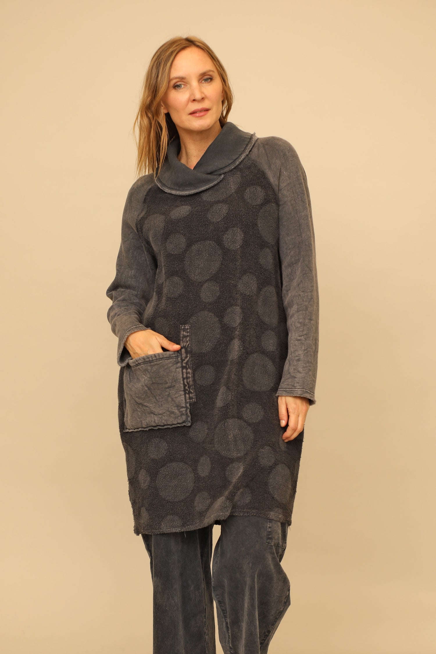 Ensure that you impress with the Mariah Dress, whether you wear its overlapping raw edged turtleneck up or lay it down. Its distinct wash ties perfectly with the contrasting fabric raglan long sleeves and front patch pocket, while flattering with its straight hemmed boxy silhouette.