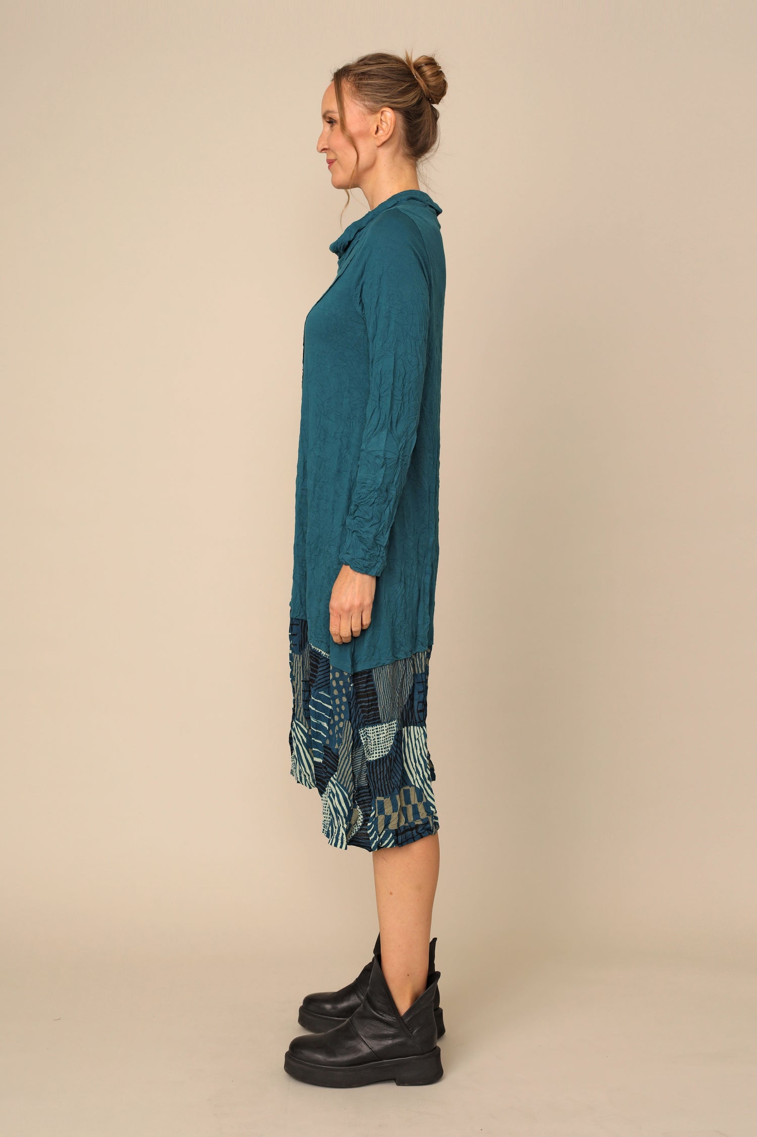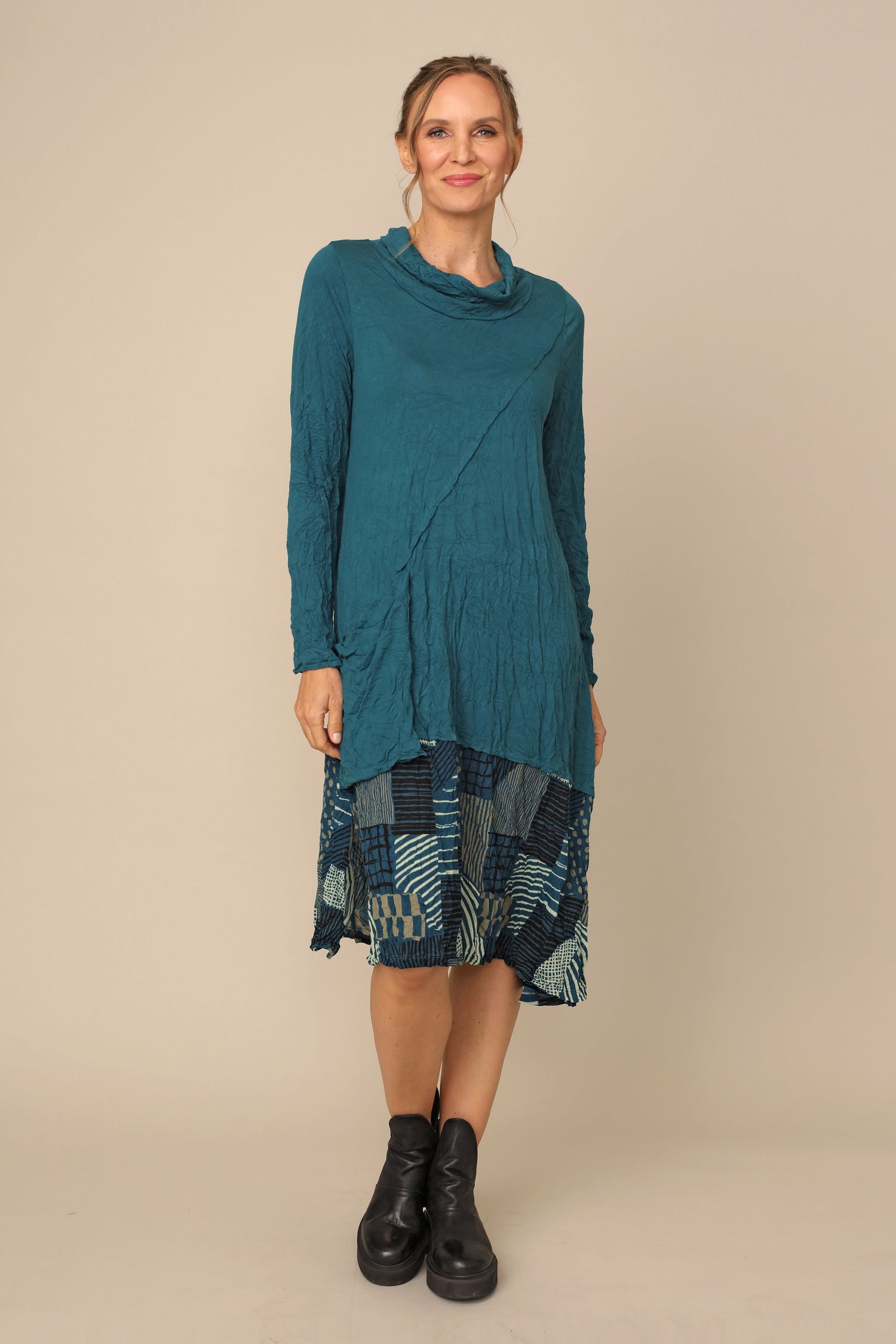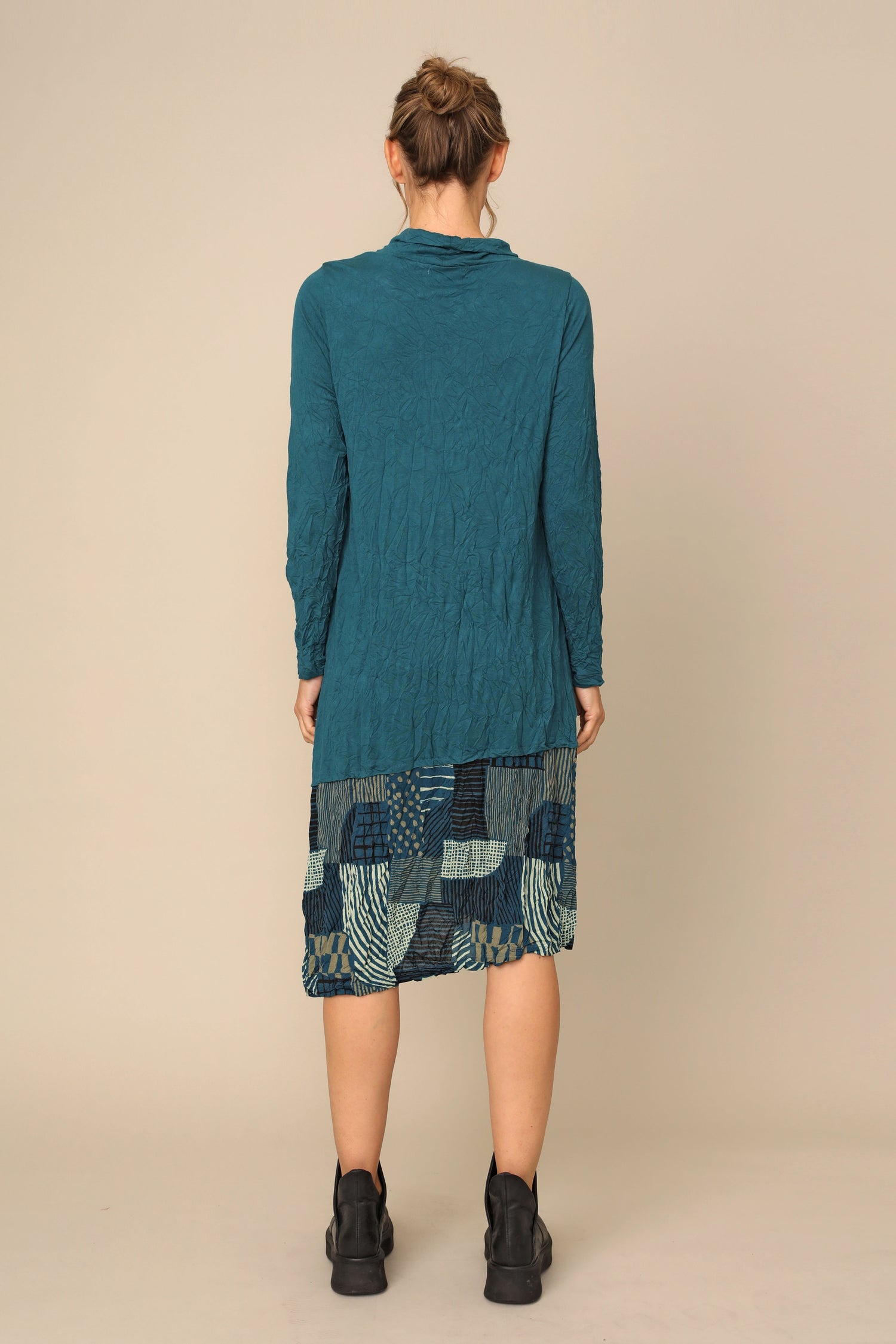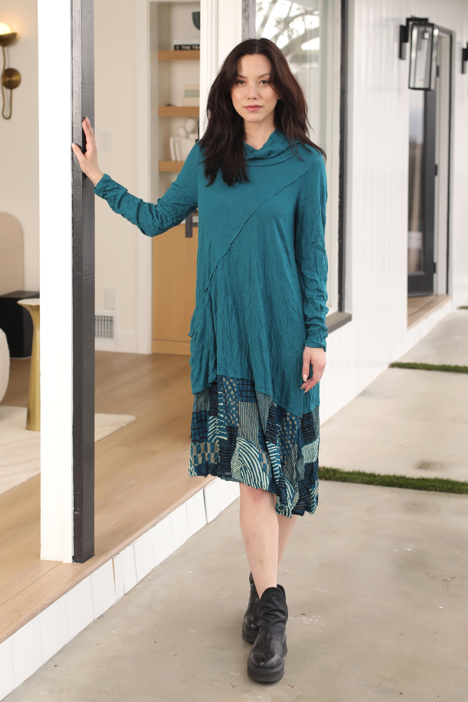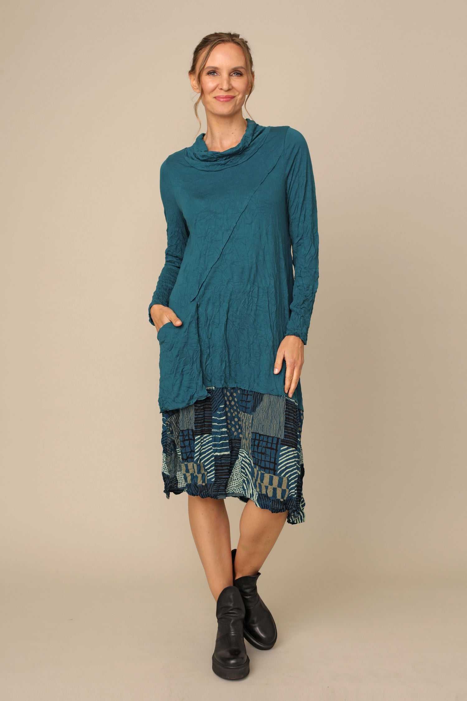 The unique Melina Dress ties classic crinkle jersey at the cowl neckline and A-line silhouette with long sleeves and patch pocket, while beautifully contrasting with crinkle mesh at the side slitted straight hem. Versatile for any occasion, this piece artfully curates a bold look while keeping you in constant comfort.