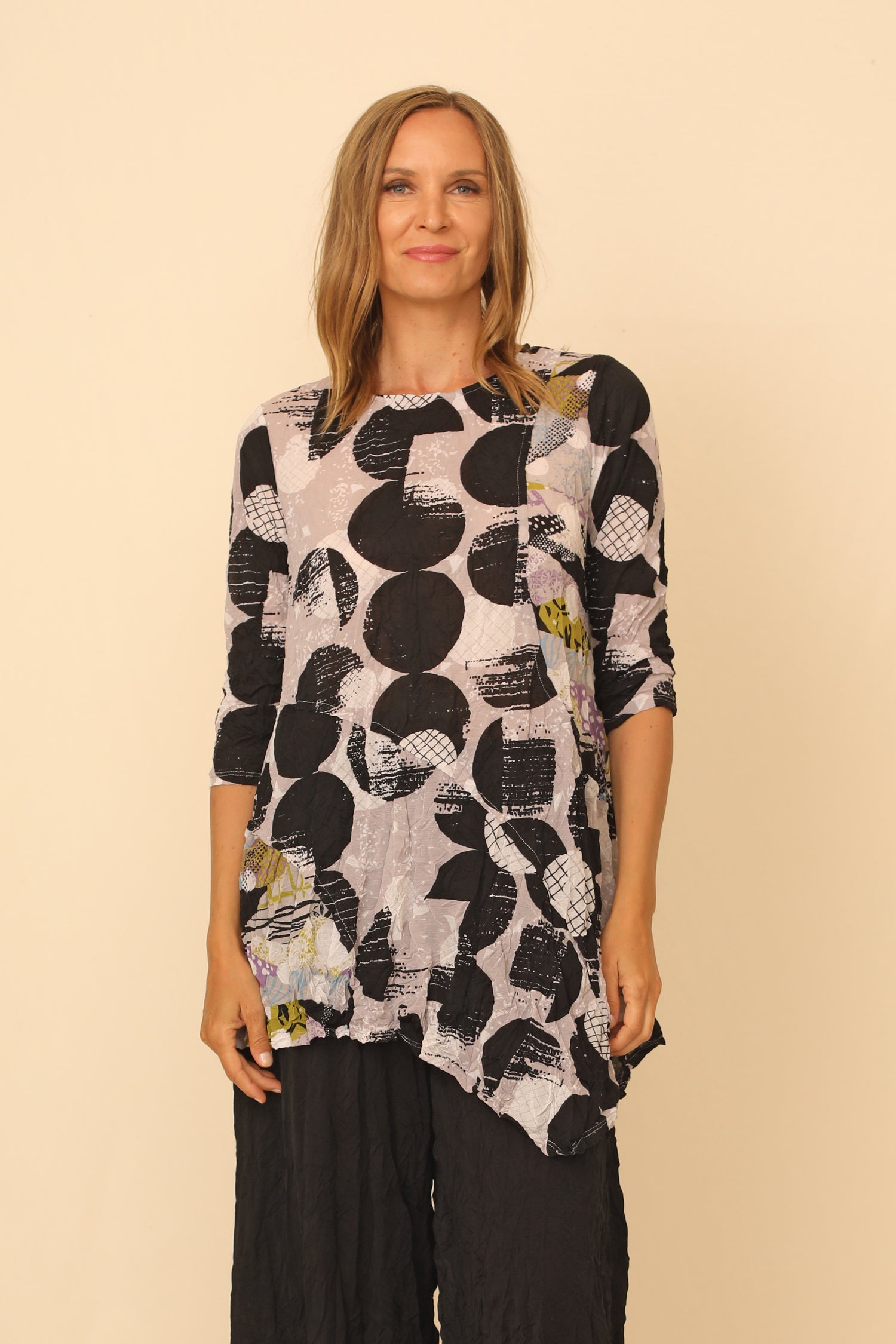 An easy and effortless piece with the Merlyn Tunic. Cut in our travel friendly crinkle mesh fabric, with ¾ sleeves and a rounded neckline to keep you in all day comfort. While the patch print contrast detailed on the side and asymmetrical hem in an A-line silhouette instantly flatters and offers a textural artistic touch to your look.