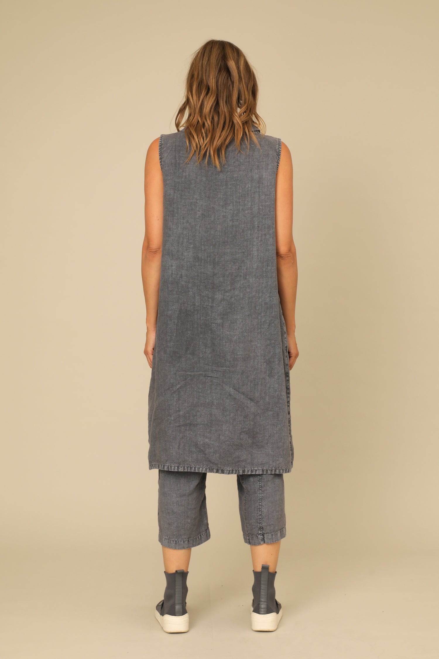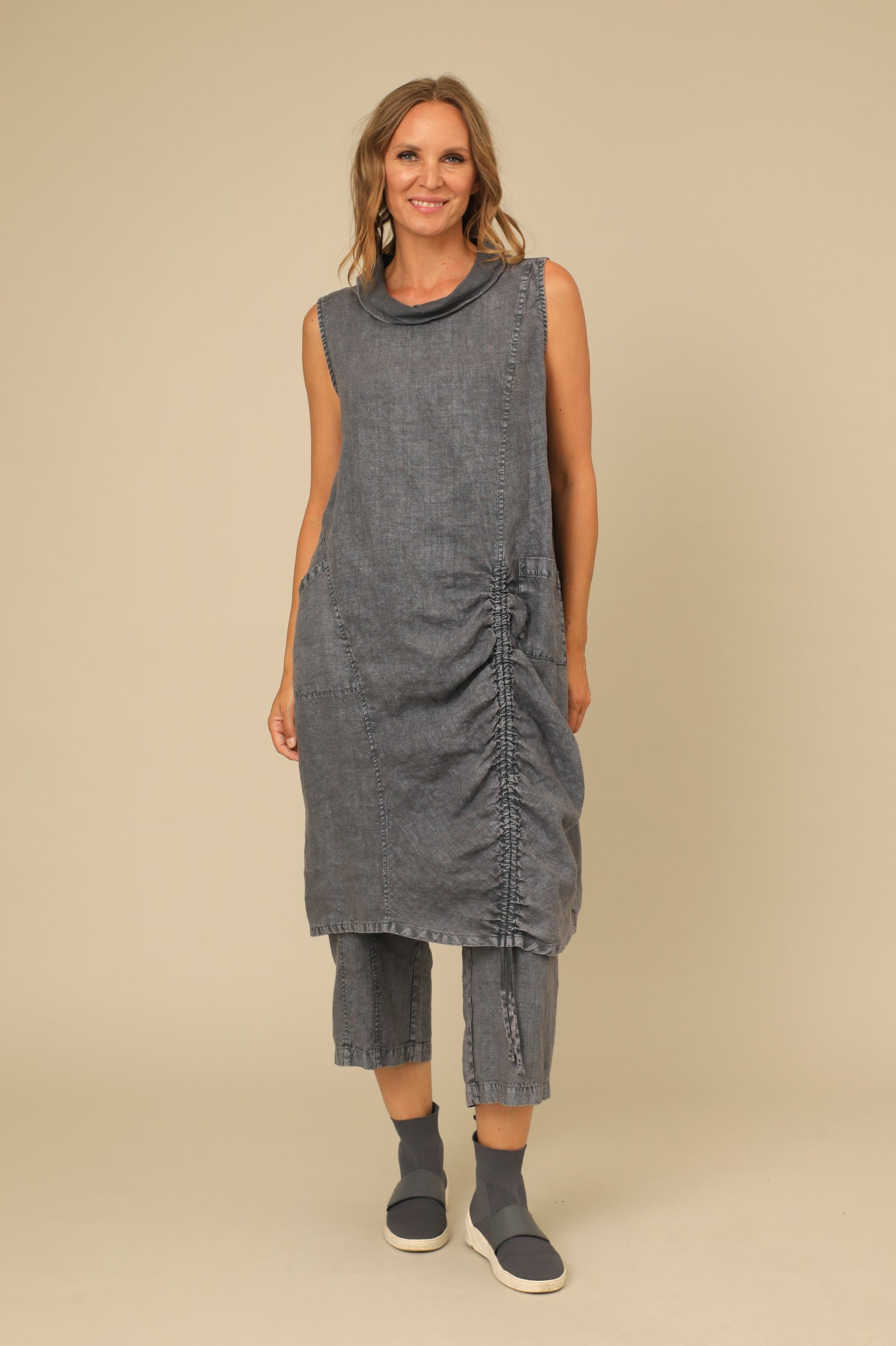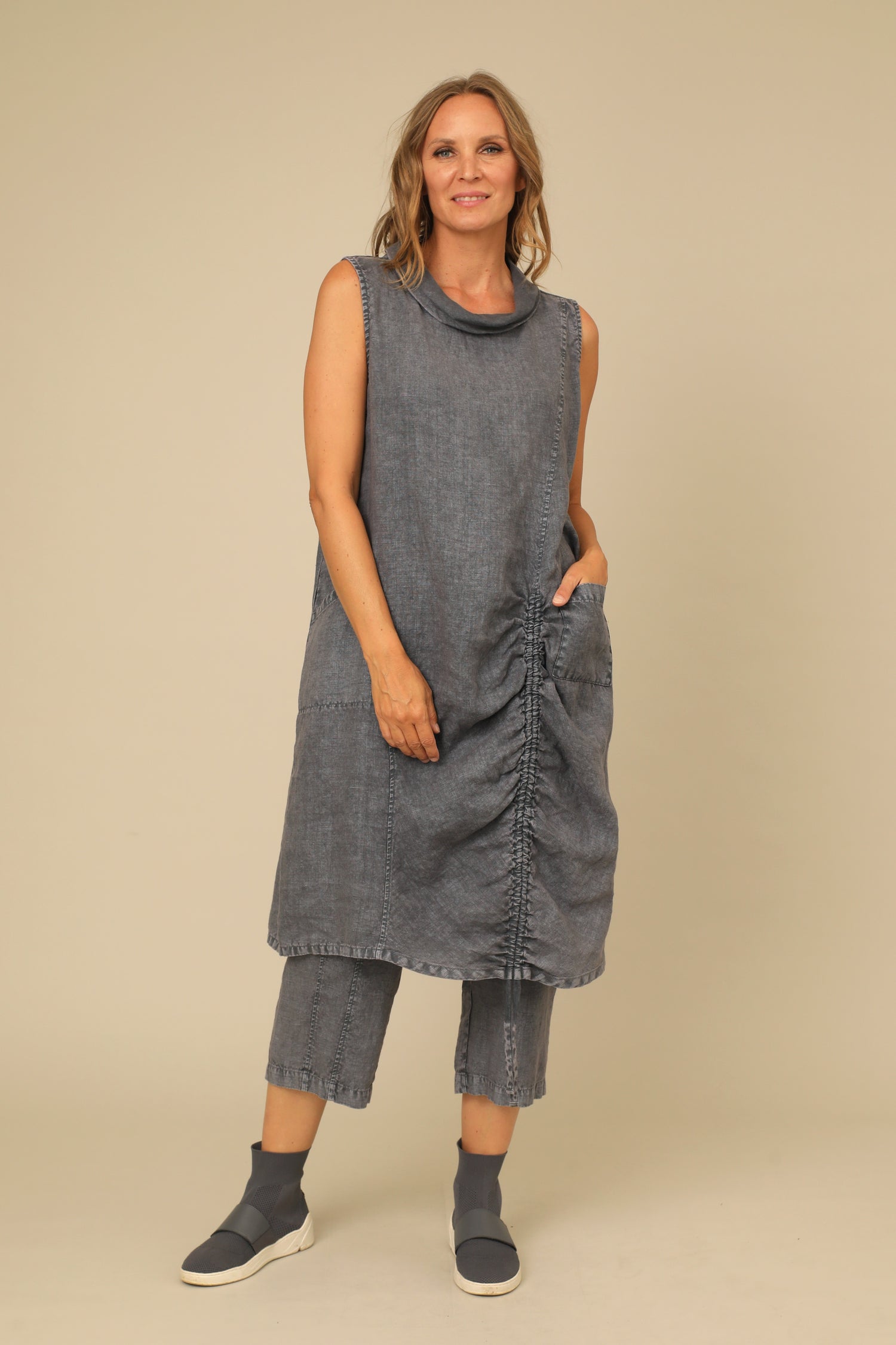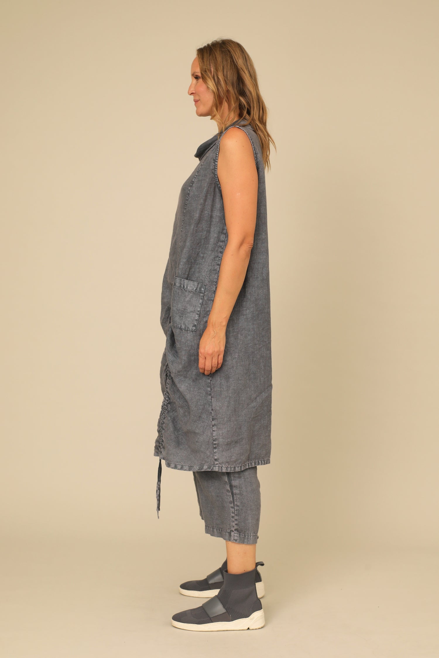 The linen A-line Millie Dress springs to life with a draped cowl neckline, sleeveless A-line silhouette, and an asymmetric hemline with adjustable drawstrings. Detailed with seams running along the body, varied with an inseam and patch pocket. Curated in a vintage wash look for an artfully unique one-of-a-kind piece.