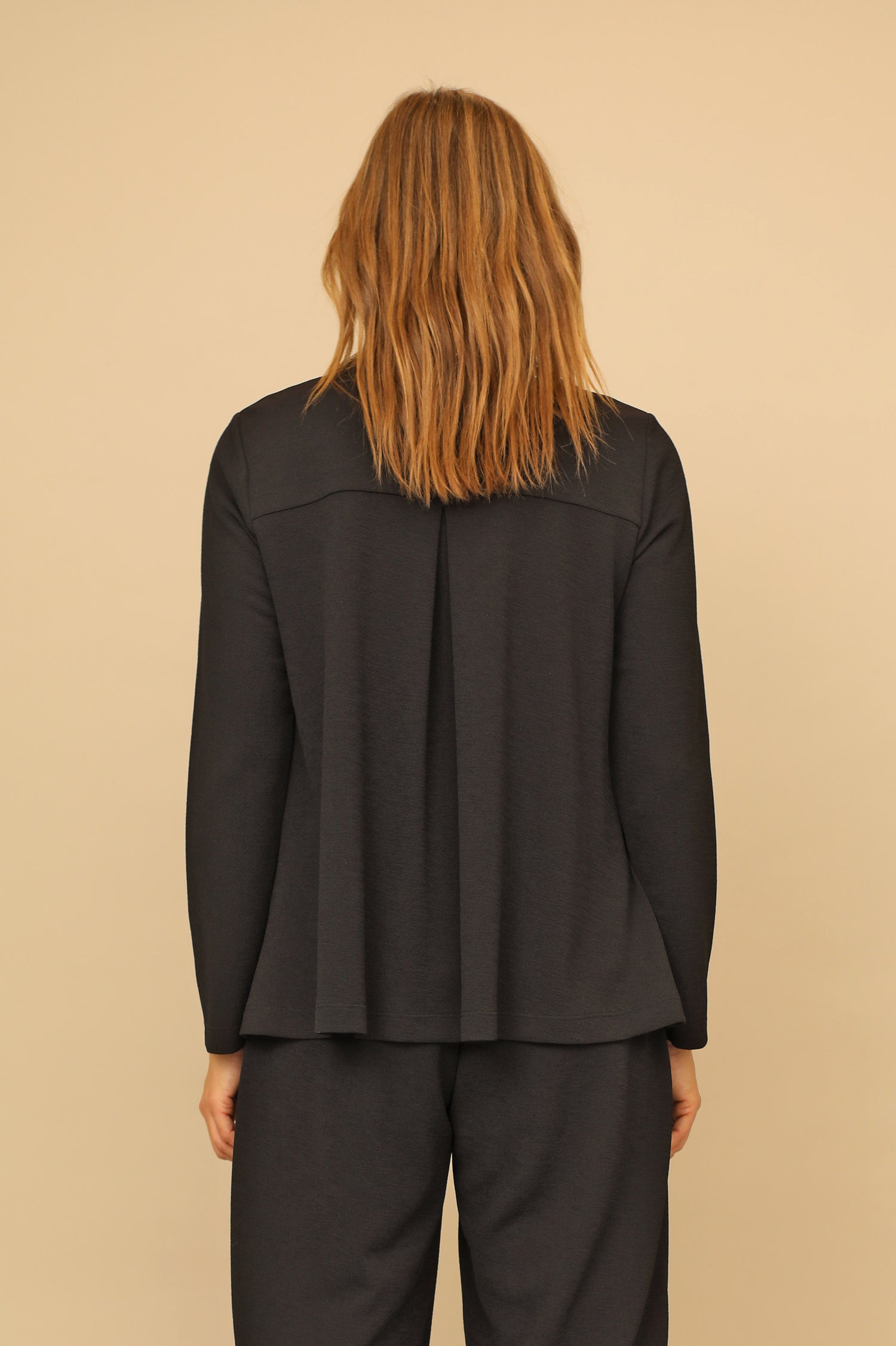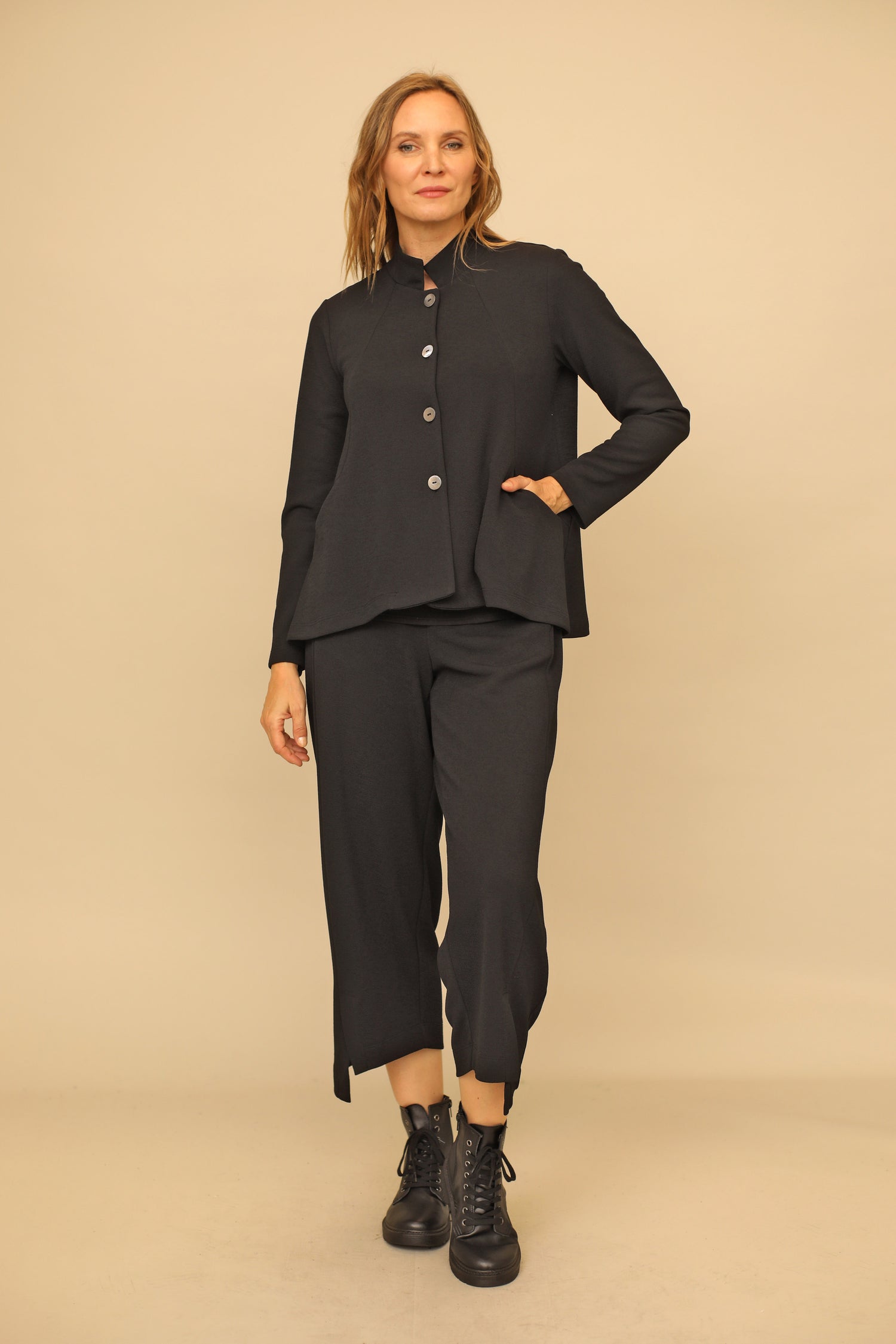 Whether with jeans or our Tess Pant for a monochrome look, the button up long-sleeved Monroe Jacket proudly presents its dashing appeal in our black stretch crepe fabric with a collared neckline and faint high low hem. Designed with in seam pockets that follow along the seam details a gorgeous look.
