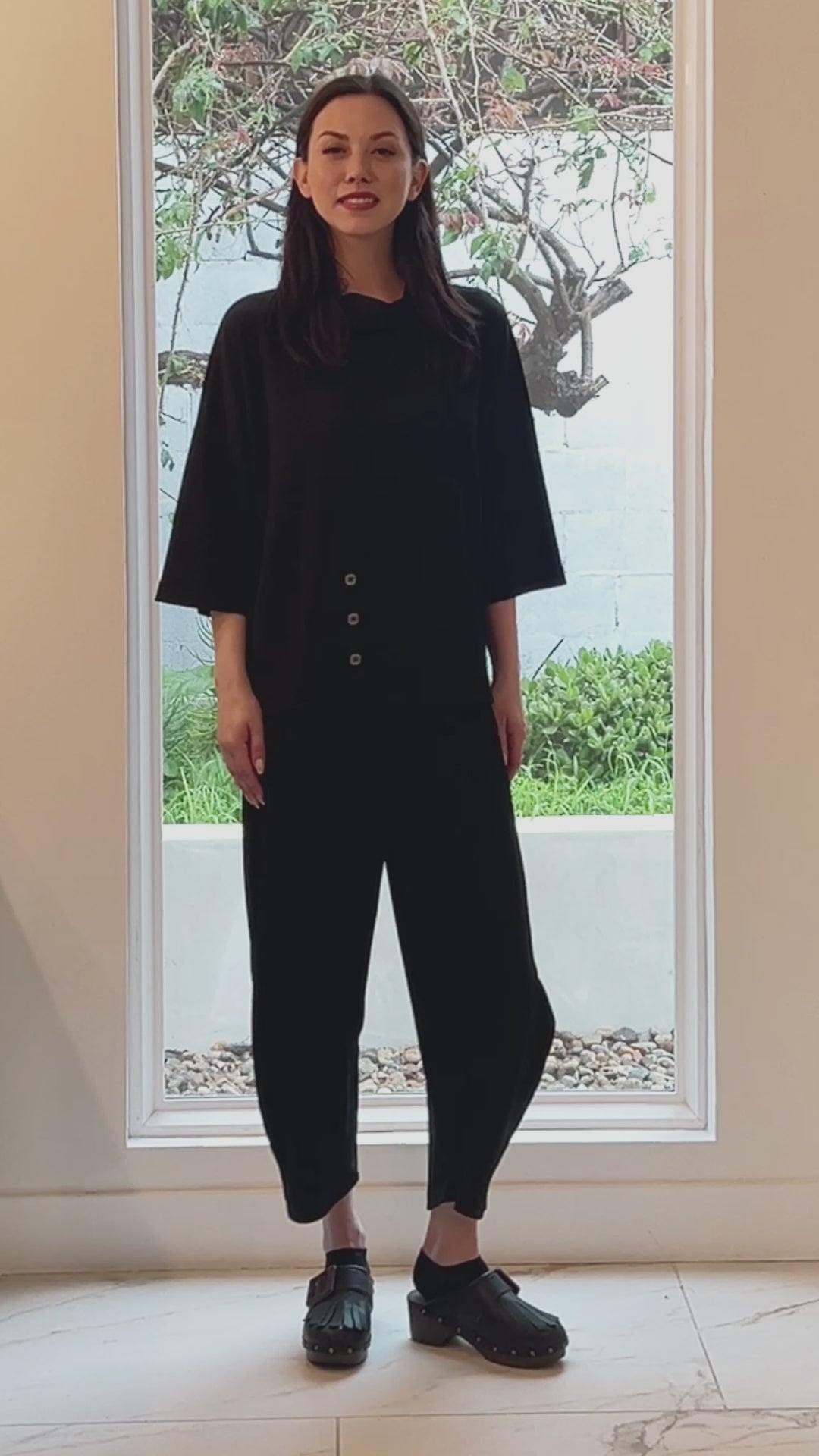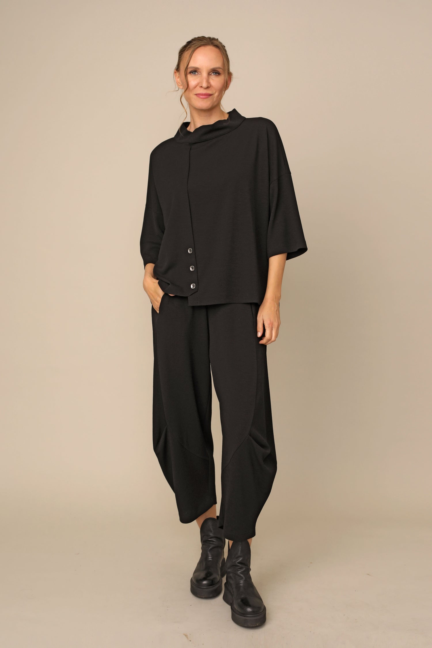 The Morgana Top peaks in effortless appeal and chic feel. Designed with a banded neckline, drop shoulder 3/4 sleeves, asymmetrically hemmed A-line silhouette, and a button trimmed mid pleat in our gorgeously comfortable crepe fabric.