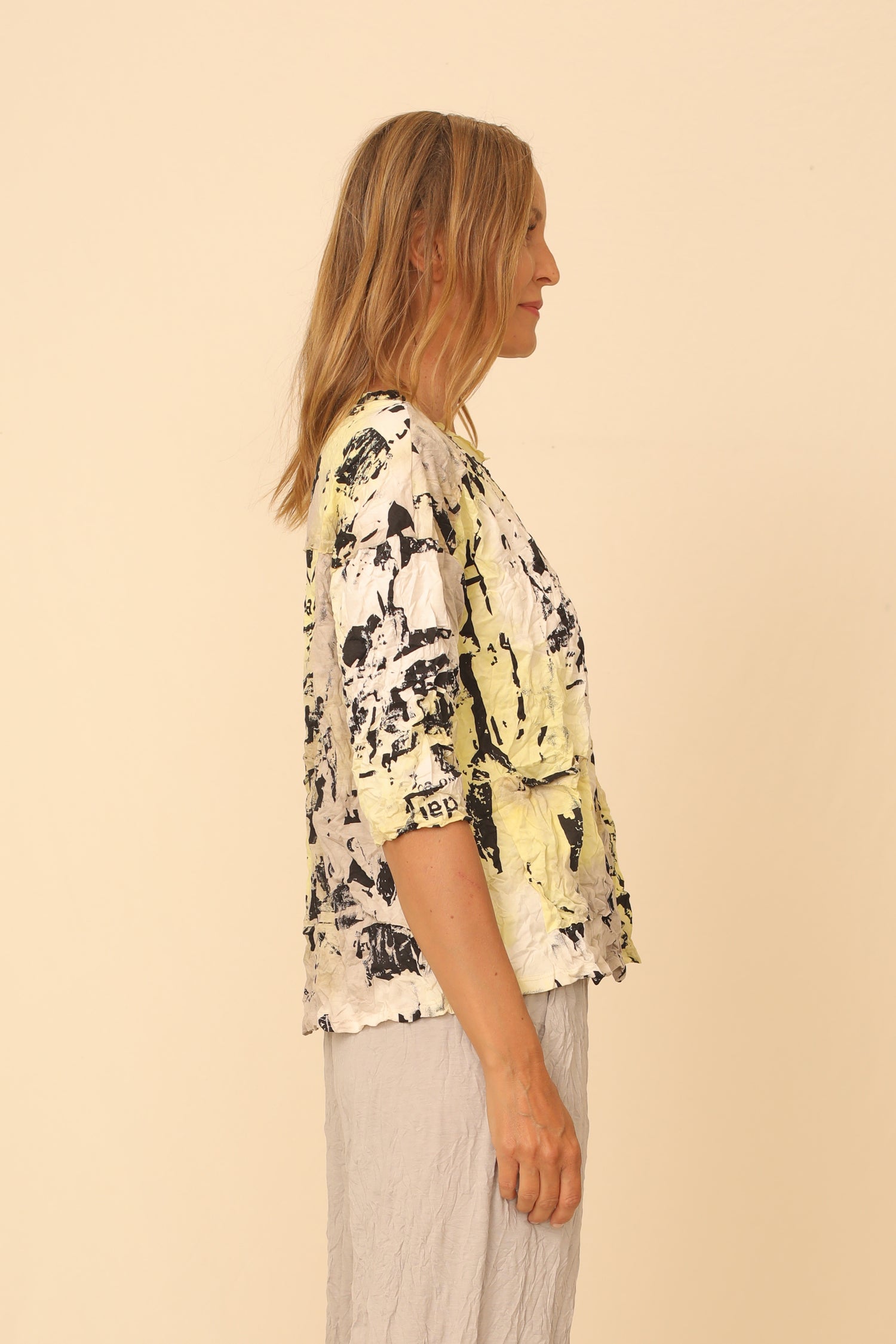 Easily throw on the Neira Top to experience premium comfort and artistry. Curated in our imaginatively patterned lightweight crinkled fabric that can effortlessly carry you through your day, this garment frames with a straight hemmed boxy silhouette with drop shoulder ¾ sleeves and a rounded neckline along with a front patch pocket and raw edge detailed. Chic and a seasonal staple.
