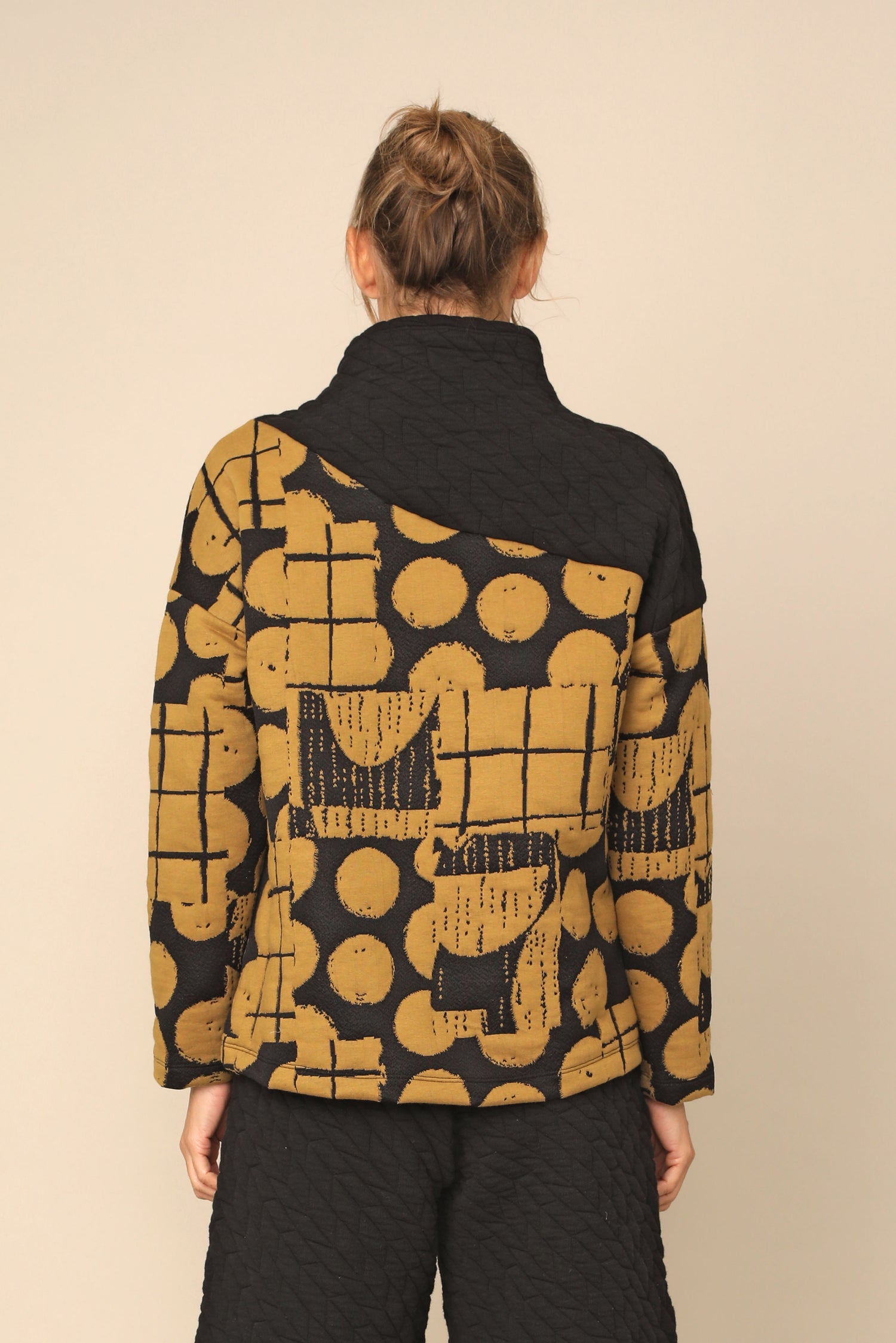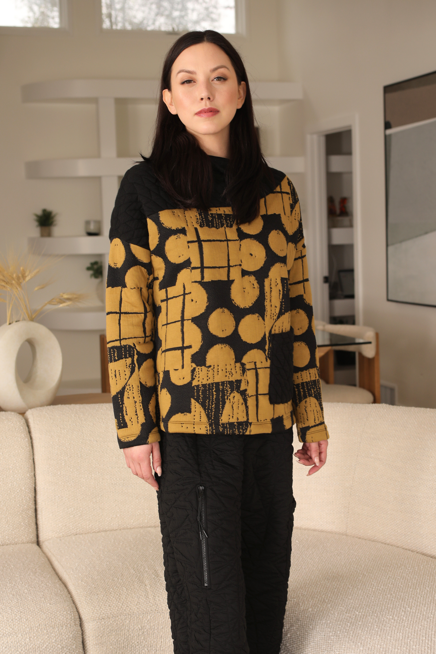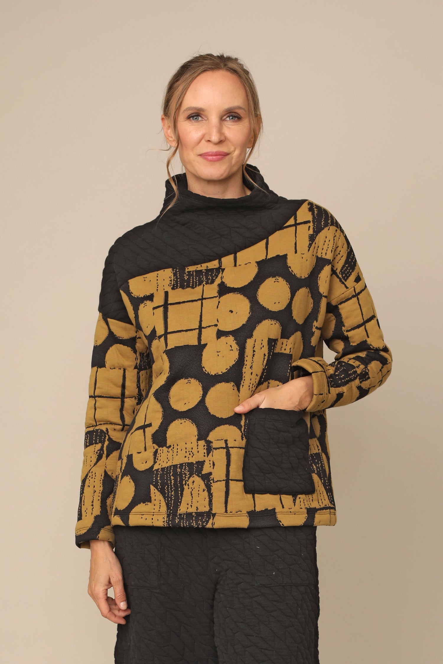 The Nessa Top instantly creates a statement with its color block of contrasting black and print design in our plush jacquard fabric on the mock neckline and front patch pocket. Featuring drop shoulder long sleeves in a straight hemmed boxy fit, this top exudes chic and an effortless modern style.