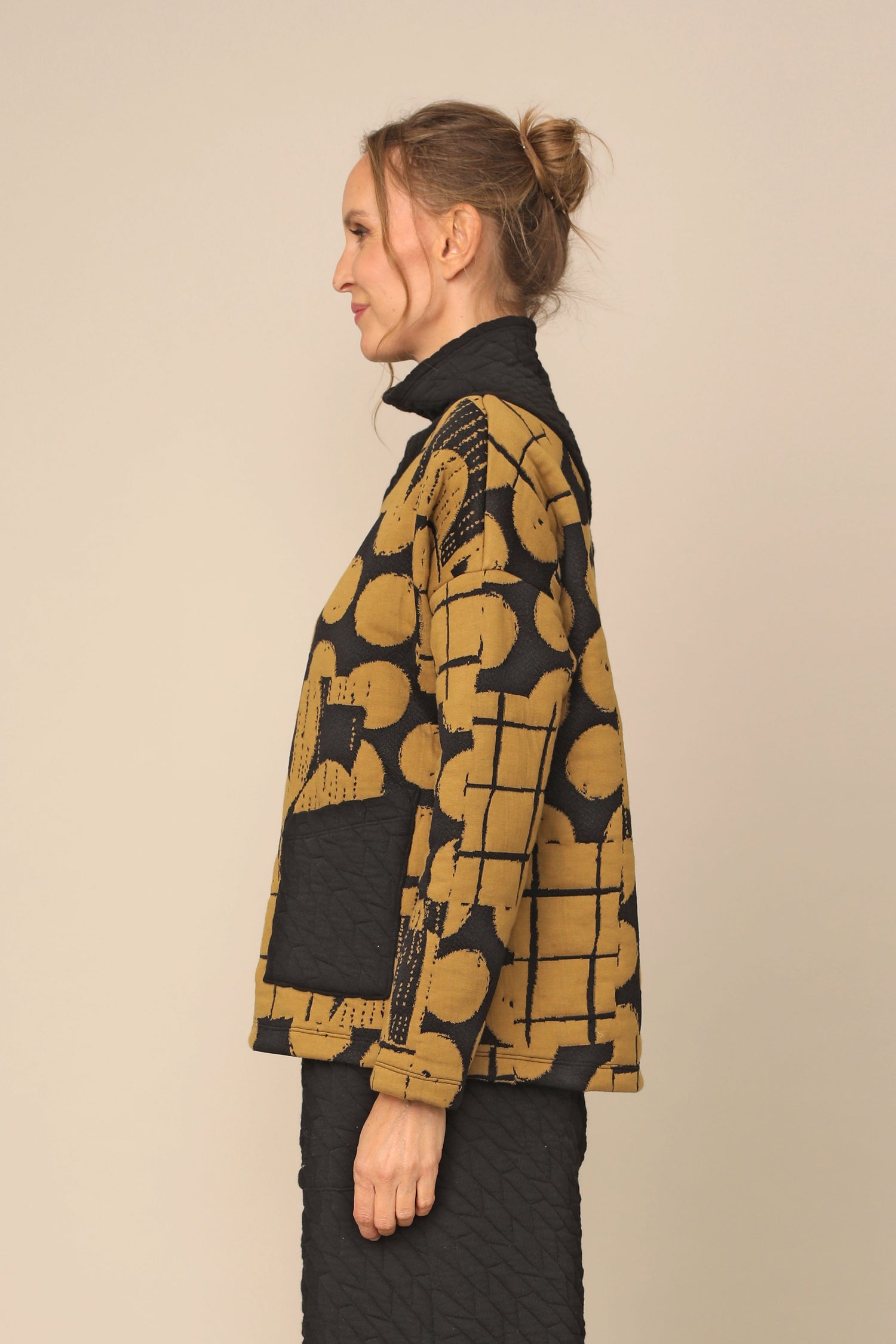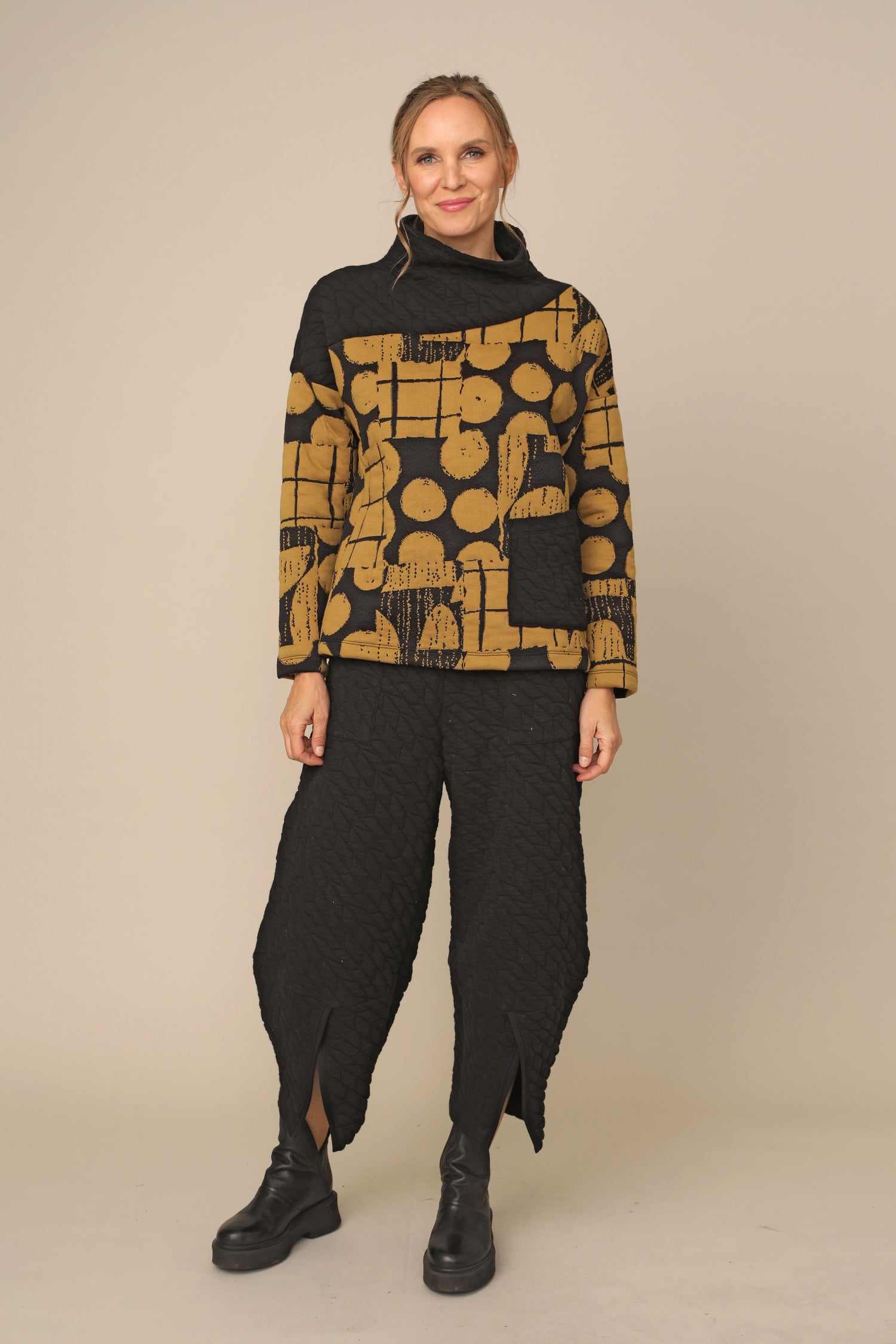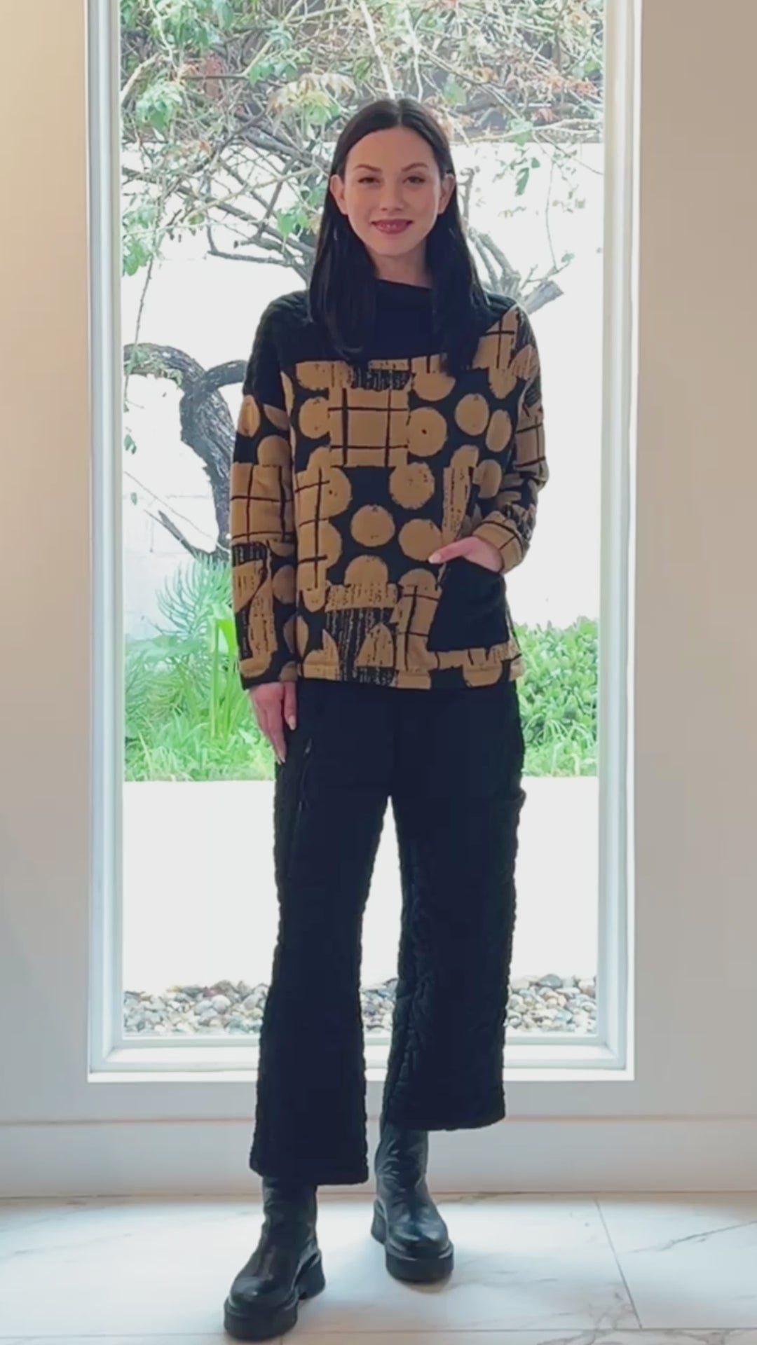 The Nessa Top instantly creates a statement with its color block of contrasting black and print design in our plush jacquard fabric on the mock neckline and front patch pocket. Featuring drop shoulder long sleeves in a straight hemmed boxy fit, this top exudes chic and an effortless modern style.