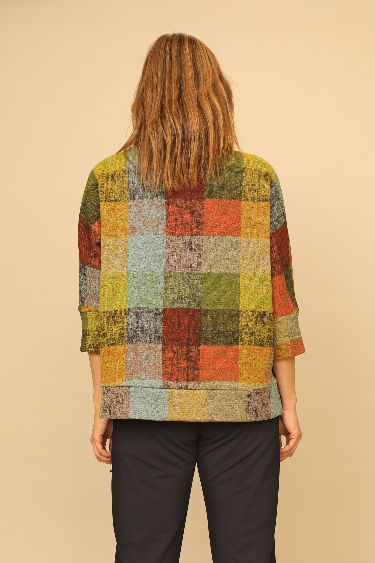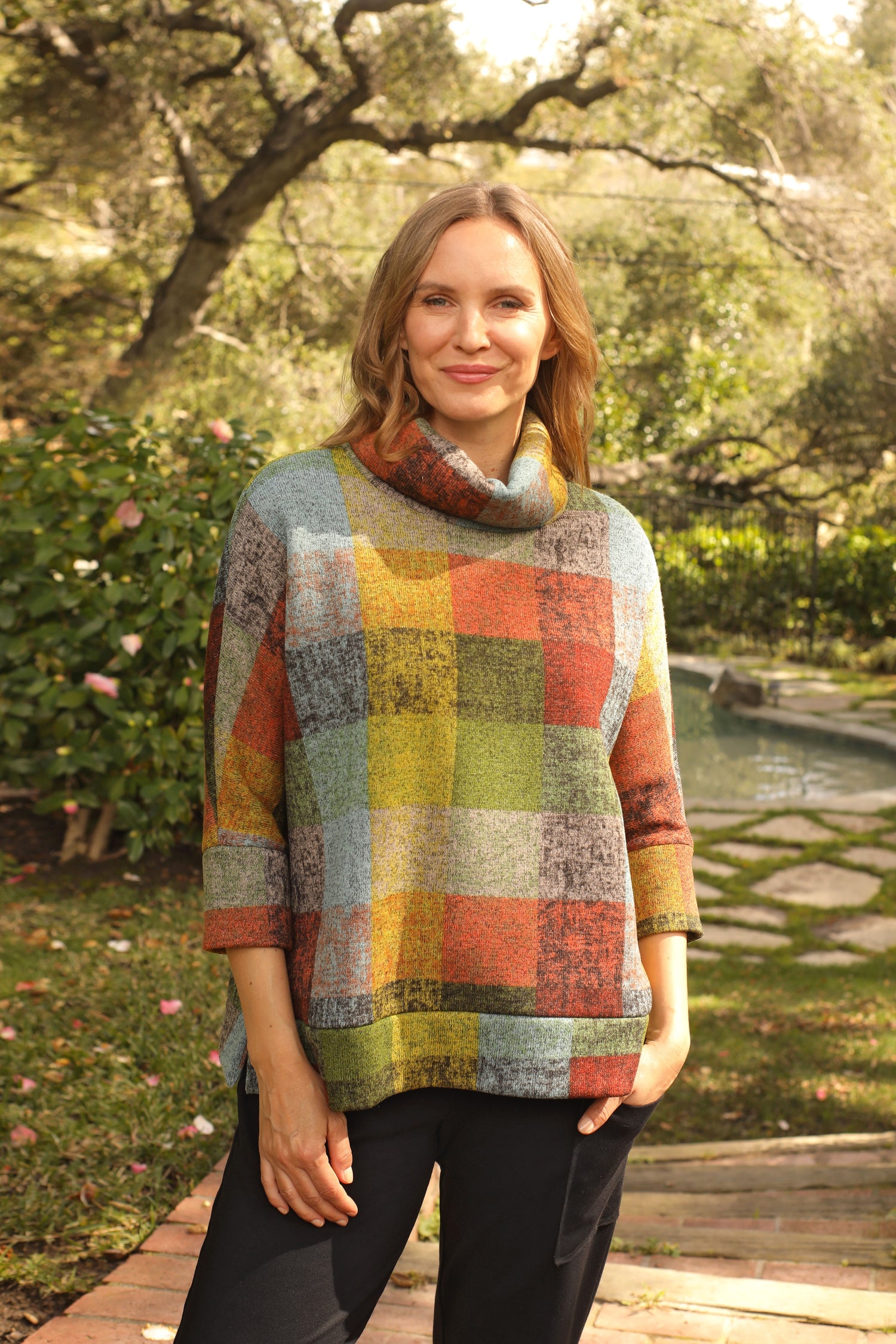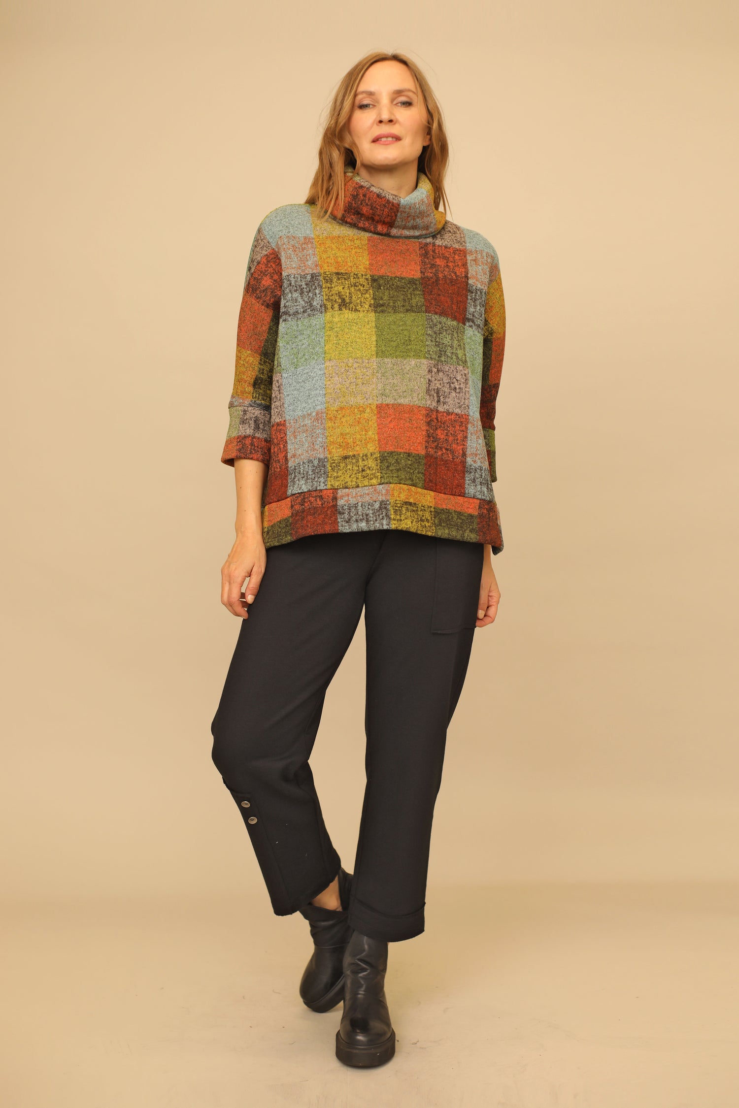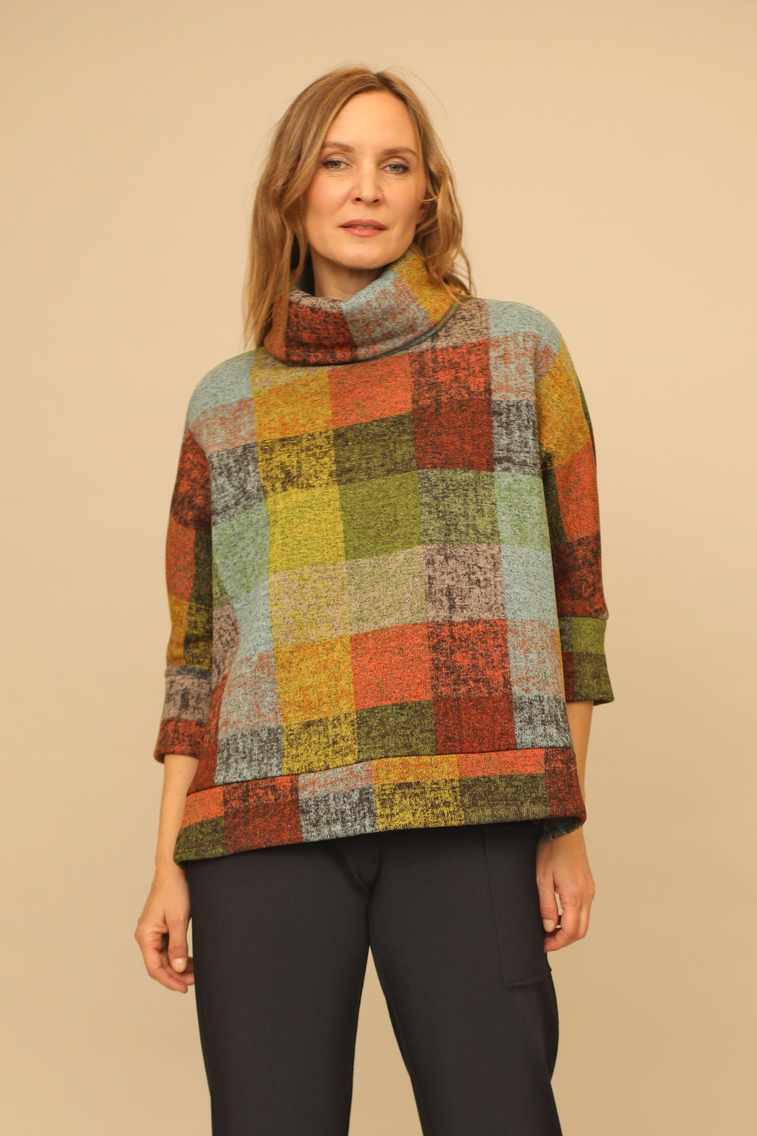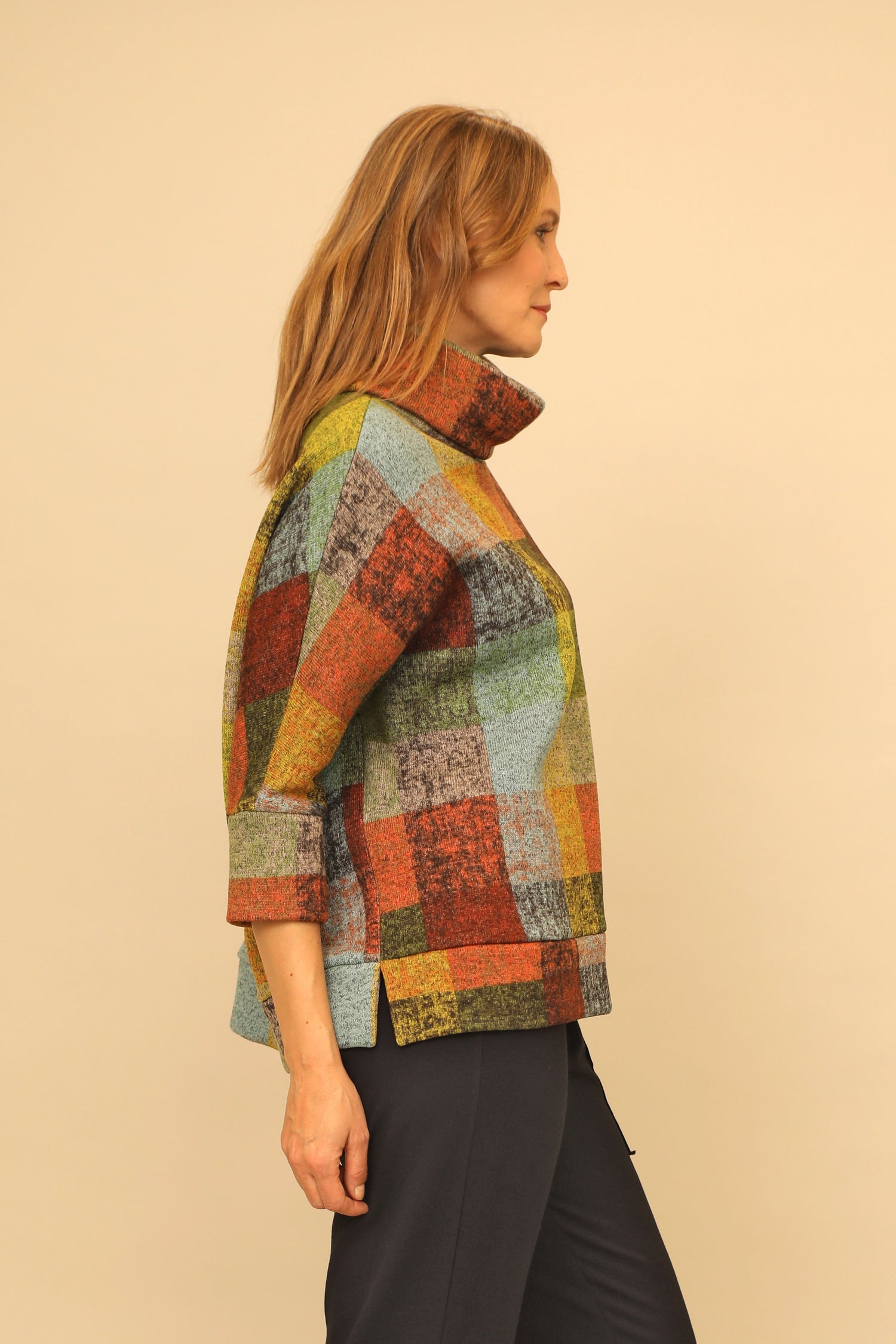 Experience sophistication with the Paisley Top, a statement piece for the season. Its elegant ¾ sleeves and boxy silhouette are complemented by a wide turtle neckline. The straight banded hem enhances its simplicity, while the luxurious printed fleece fabric and drop shoulder sleeves provide both style and comfort.