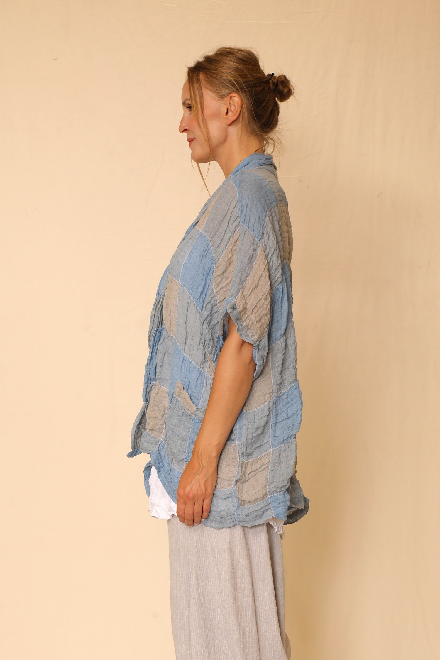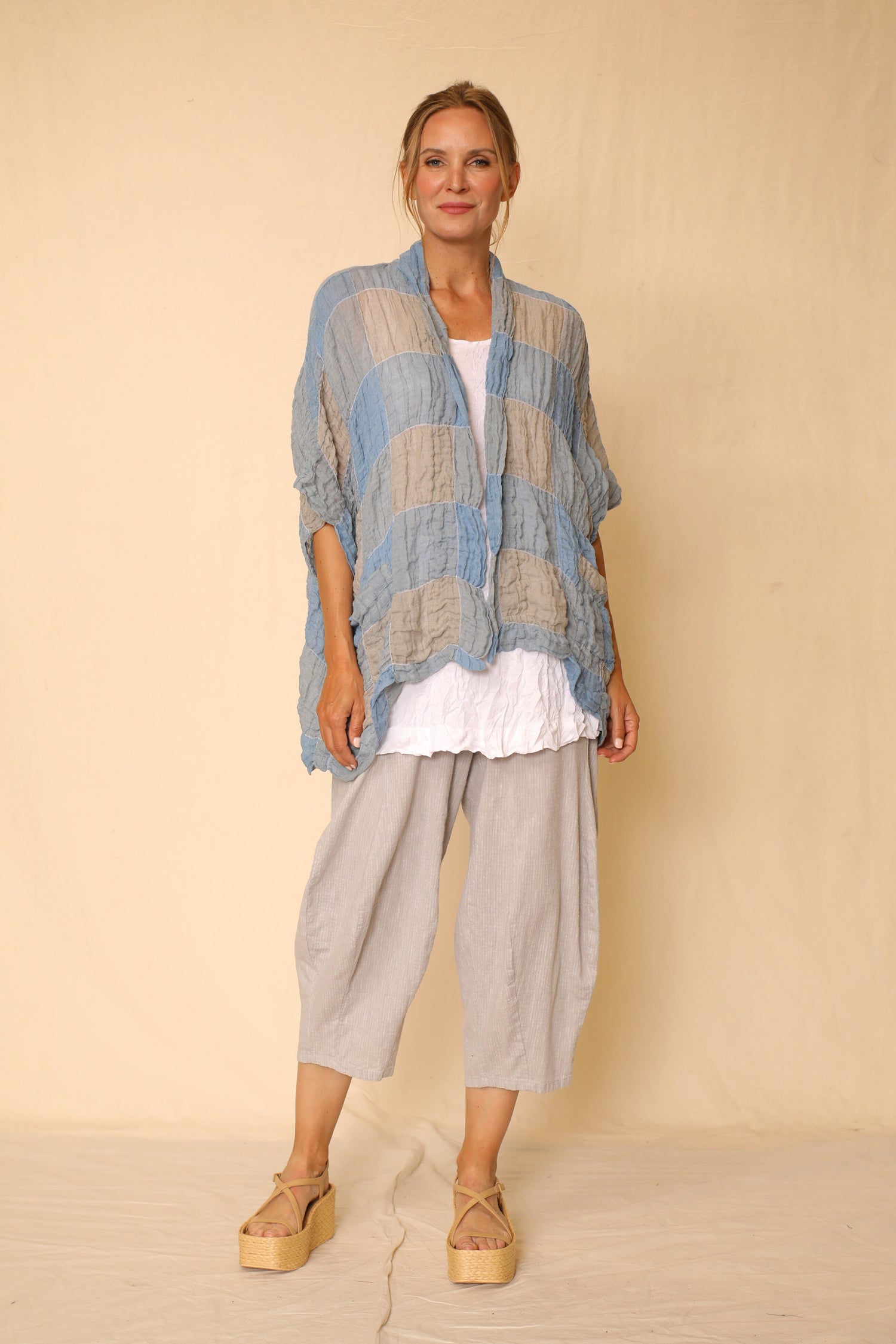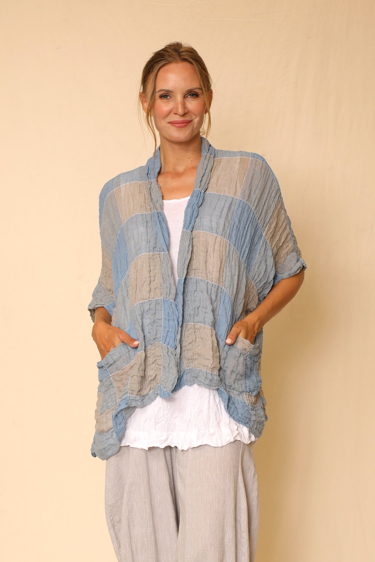 Crafted to combine natural charm and panache, the open Pamela Jacket ties visual interest and sophistication with our beautiful two-toned linen checkered fabric with its natural crinkle texture to enhance its relaxed boxy silhouette. Featuring a shawl collar neckline and drop shoulder sleeves, this garment will be an everlasting piece to pair with a simple pair of jeans or elevated with classy trousers.