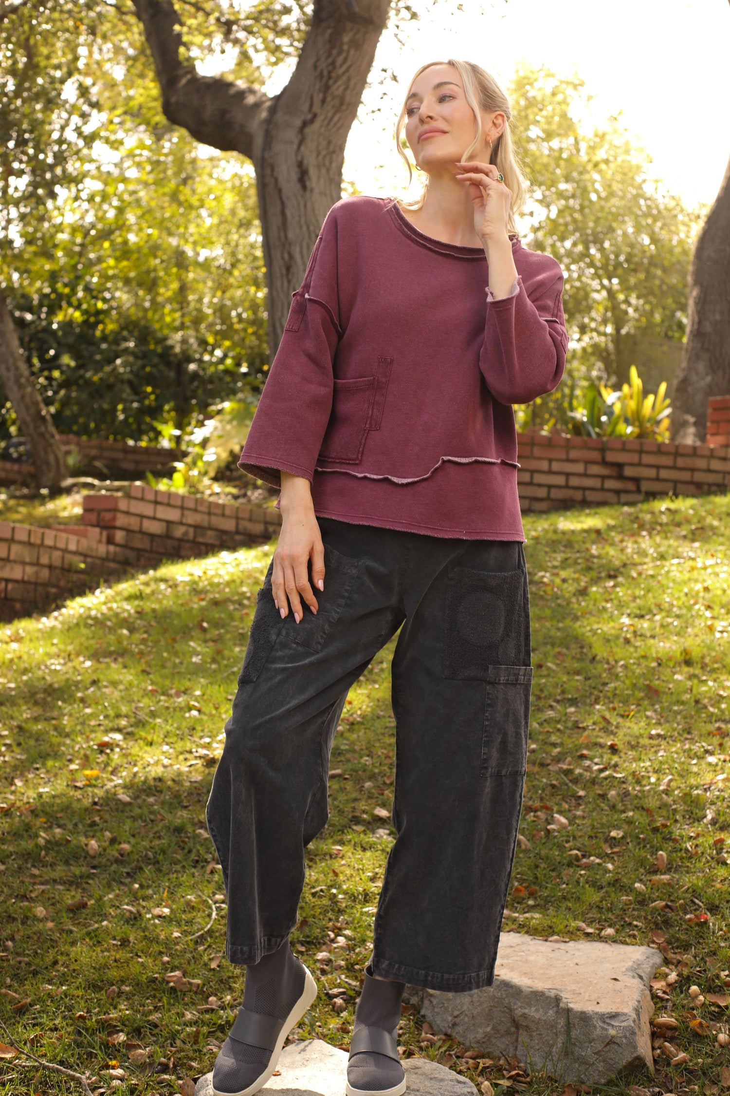 A wardrobe staple with a soft, timeworn style. The charm of our fleece Pauline Top are in the raw edge seams around the rounded neckline along with the drop shoulder ¾ sleeves and above the straight hem, highlight the details of its front patch pocket and straight hemmed boxy fit to perfectly flatter any silhouette.